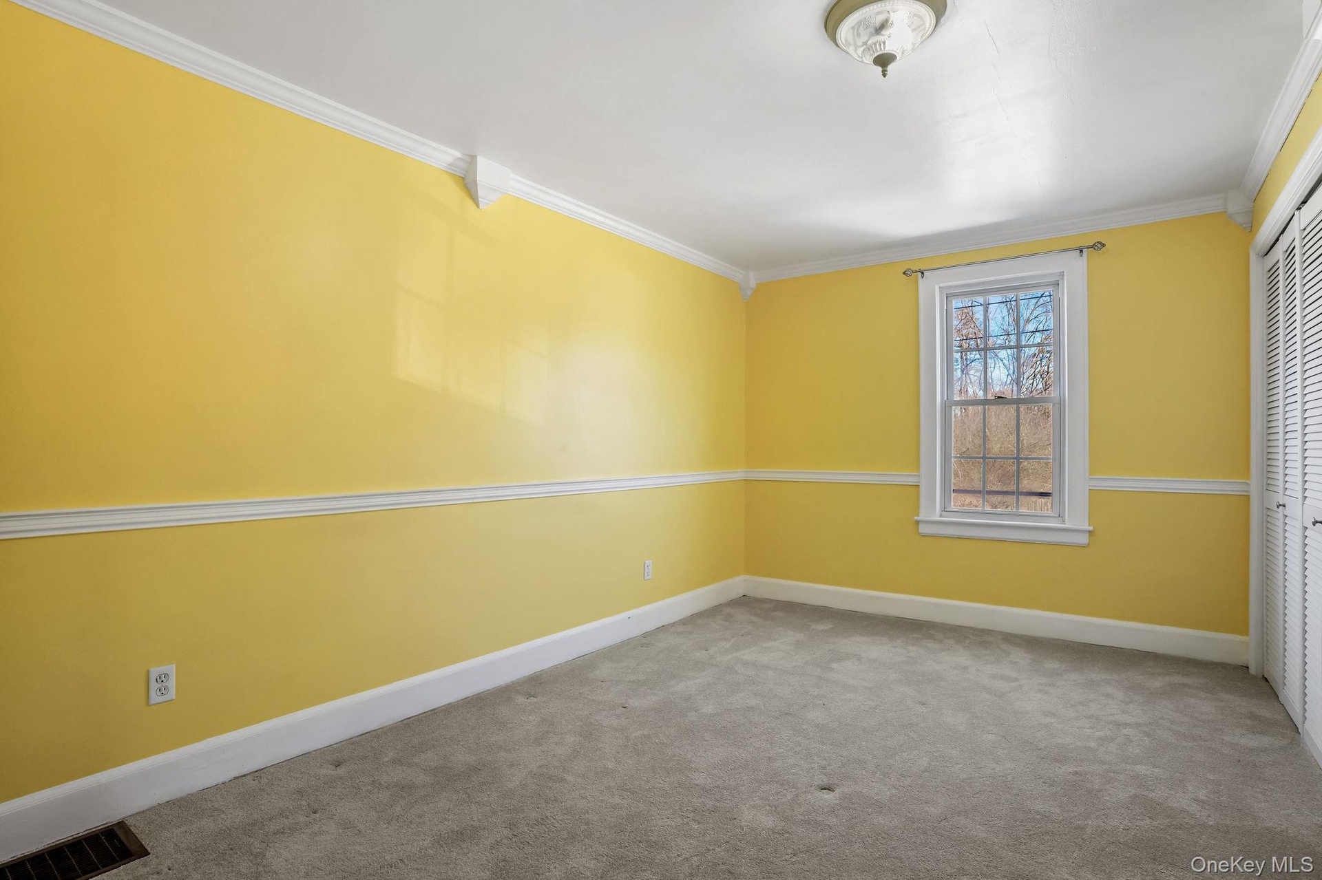- Master bedroom with ornamental molding, carpet, and a closet