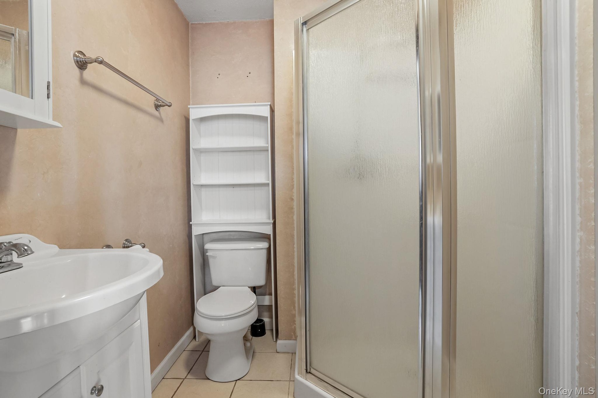 - Bathroom featuring light tile patterned flooring, vanity, a stall shower, and a textured ceiling