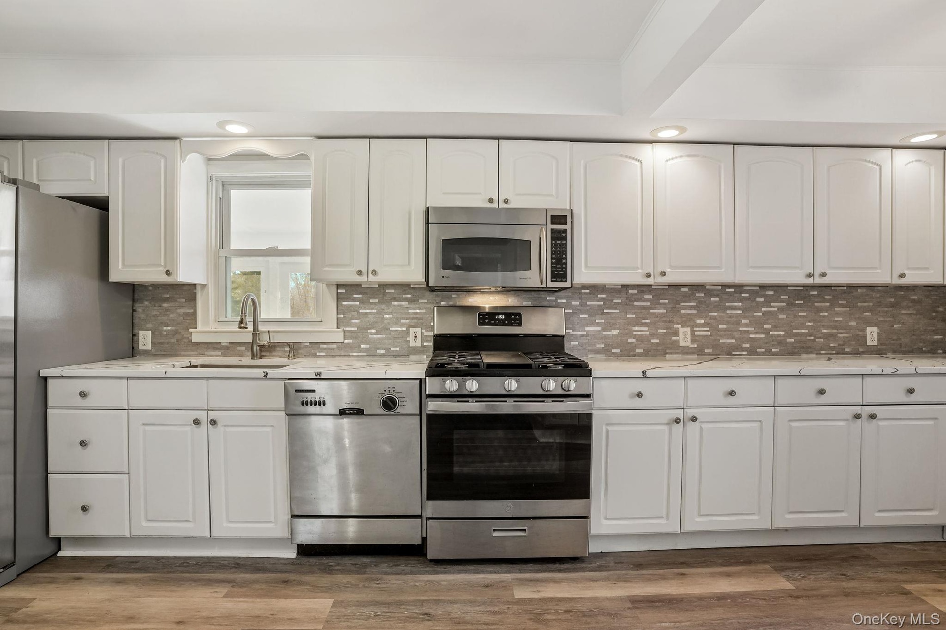 - Kitchen with decorative backsplash, white cabinets, light stone counters, dark wood-type flooring, and stainless steel appliances