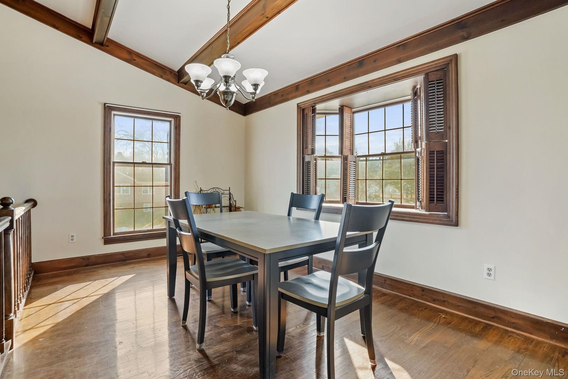 - Dining area with beamed ceiling, dark wood-type flooring, and a chandelier