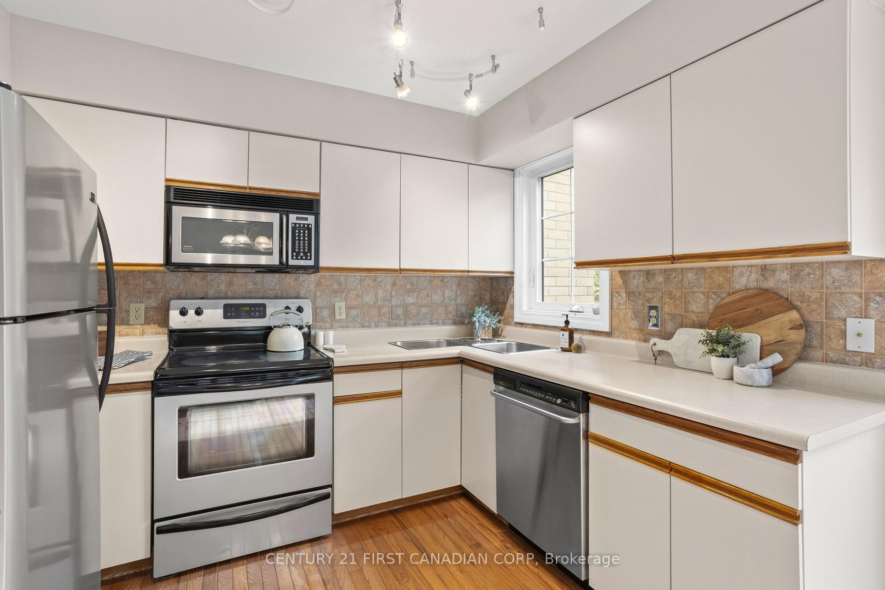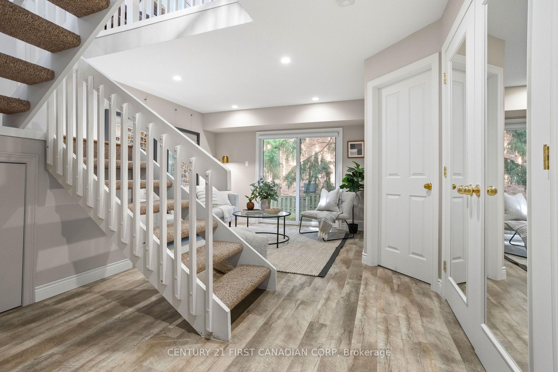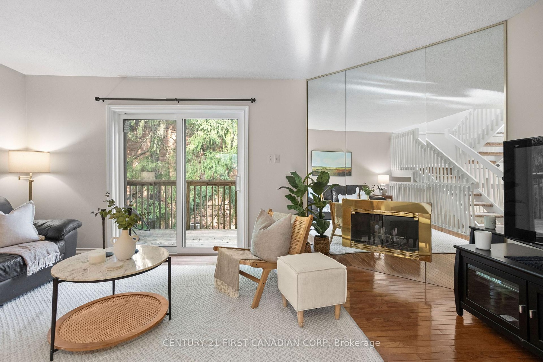 Welcome to 1399 Commissioners Road W., Unit 30, in the sought-after Byron neighbourhood of London. This three-storey townhome offers two spacious bedrooms, 1.5 bathrooms, and a single-car garage. The entry level features a versatile den or office space finished with luxury vinyl plank and provides access to a private patio through updated patio doors. The main floor showcases an open-concept design with hardwood flooring, a gas fireplace, and a private outdoor balcony space through updated patio doors off the living room. A central open staircase with a skylight from the third floor, combined with an abundance of windows throughout, fills the home with natural light. Upstairs, you'll find two generously sized bedrooms and a beautifully renovated three-piece bathroom completed with heated floors, tiled walls and floors, Grohe fixtures, and a 20 rainfall shower. The half bathroom on the main floor also includes Grohe fixtures and a gorgeous tile feature wall. The second and third floors are finished with hardwood, while the furnace room floor has been epoxied to match the luxury vinyl plank flooring. The home is further enhanced by an owned tankless water heater, increasing efficiency and comfort. The garage is finished with Gladiator Garage slat walls, baseboards, and an epoxy floor, offering excellent storage and durability. This condo community backs onto the Thames River and is just minutes on foot to Springbank Park and the heart of Byron, making it the perfect combination of nature, convenience, and lifestyle.