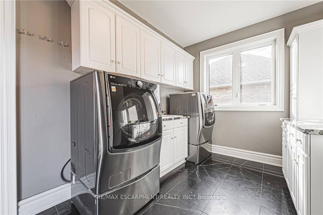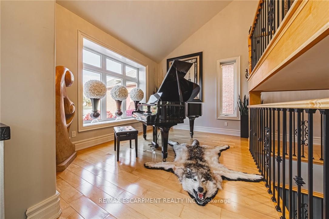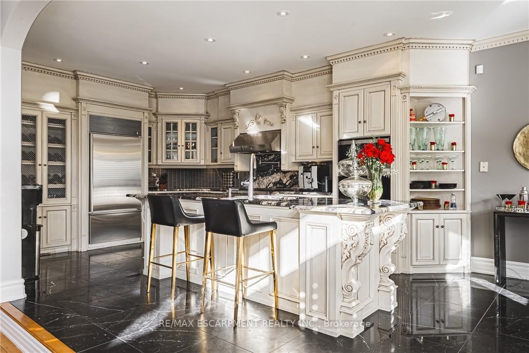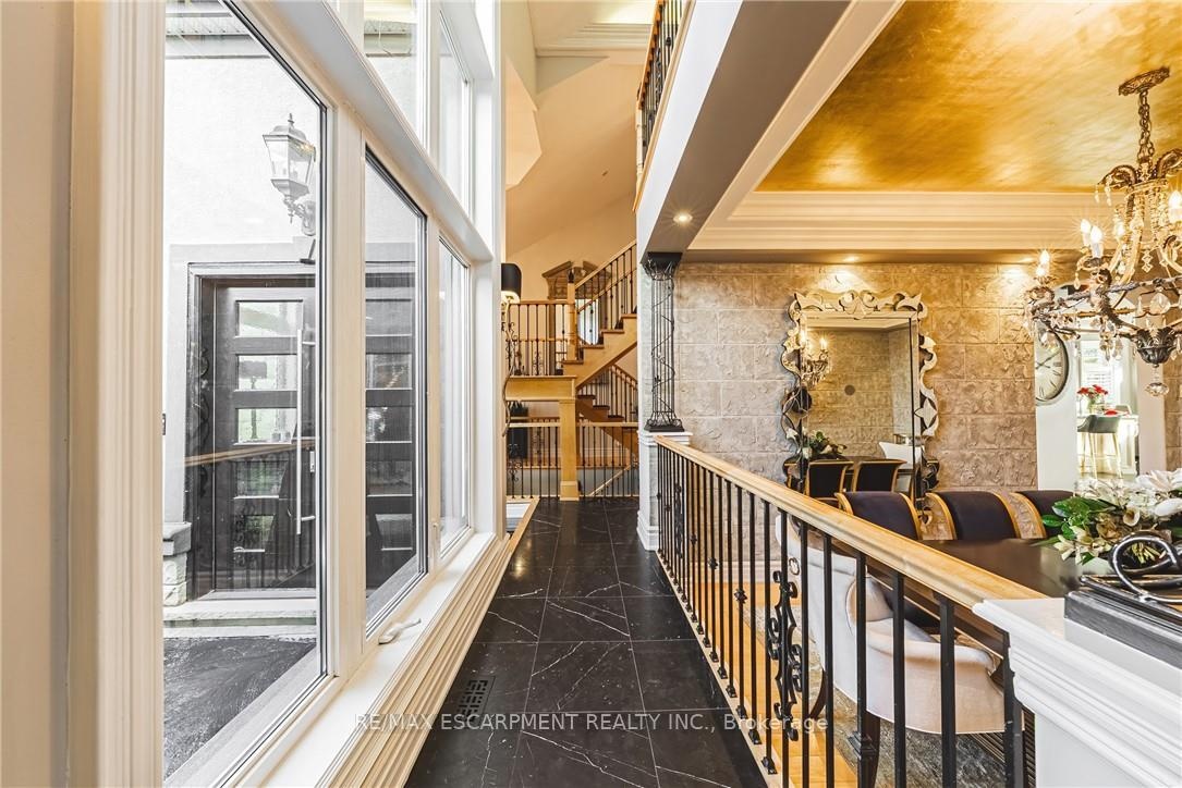 Unique, custom-built luxury home in the highly sought-after Ancaster Heights neighbourhood. Attention to detail & fine construction throughout, this home offers elegance, comfort, & functionality. Step into the grand sitting area, featuring soaring ceilings, stunning windows, & an impressive open staircase that connects all levels of the home. Sunken dining room boasts coffered gold leafing ceilings for refined entertaining. Custom Built Downsview kitchen offers abundant cabinetry, granite countertops, & top-of-the-line stainless steel appliances, including a Sub-Zero refrigerator, Wolf gas range, Gaggenau built-in oven, Miele dishwasher, & microwave storage. Relax or entertain in the expansive great room, featuring dramatic ceiling heights & a backlit onyx walls for your tv. An open-concept office with natural light, perfect workspace. Main-floor laundry room includes garage access. Upstairs, the spacious primary suite offers a large walk-in closet & a renovated 5-piece ensuite (2025). Two generous bedrooms share a beautifully appointed 4-piece bathroom, & a bright loft area overlooks both the front & rear of the home. The lower level features large windows & offers in-law suite potential with separate walk-ups to both the rear yard & garage. Cozy recreation room with fireplace, a fully equipped gym, a sauna for relaxation, 3 pc bath (2025), workshop, cold room, & plenty of storage space. The outdoor oasis includes a composite deck with built-in BBQ, hot tub, & an oversized waterfall feature with fireplace, artificial turf & a storage shed. Additional highlights include an oversized 2-car garage with abundant storage & a long interlock driveway accommodating up to 8 vehicles & irrigation system. Trillium award several years for landscaping. Ideally located near Tiffany Falls, Tamahaac Club, Highway 403, the Linc, Costco, schools, parks, & trails, luxury living with convenience & lifestyle.