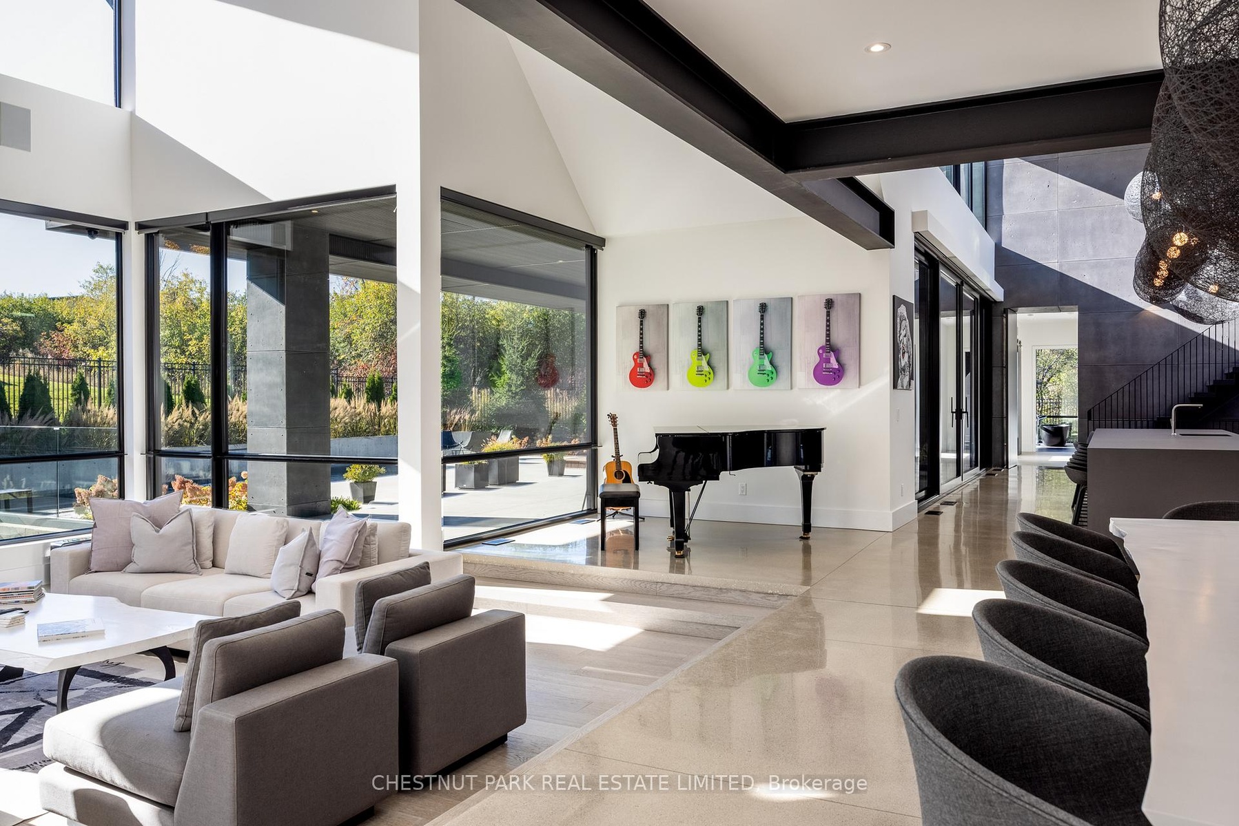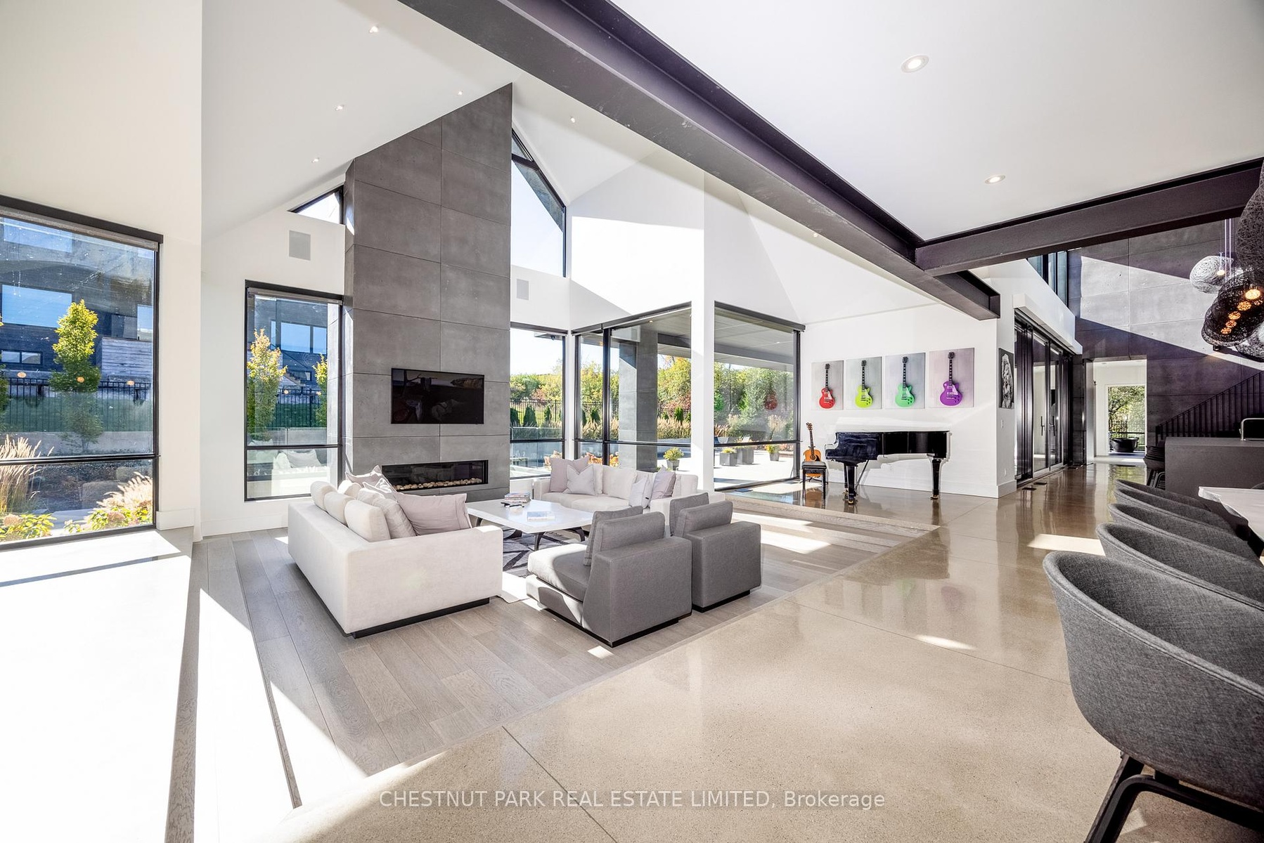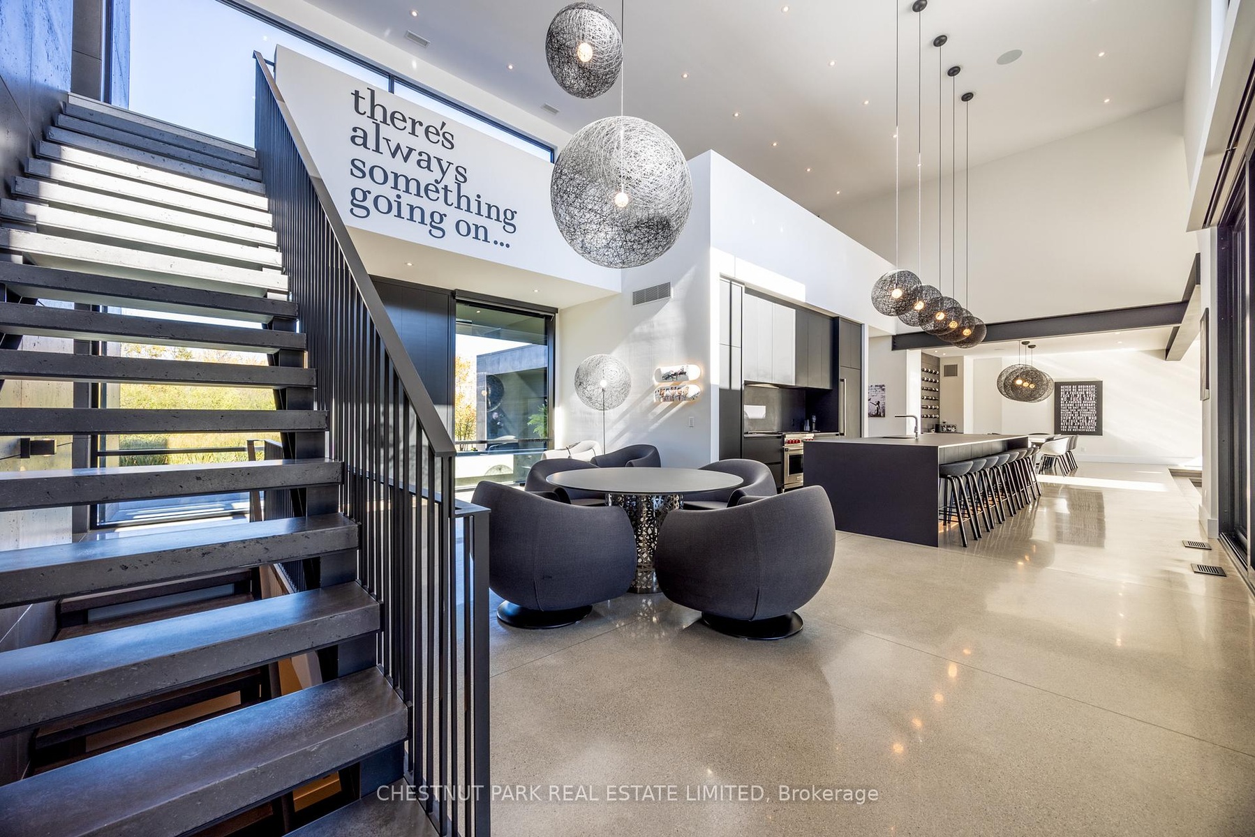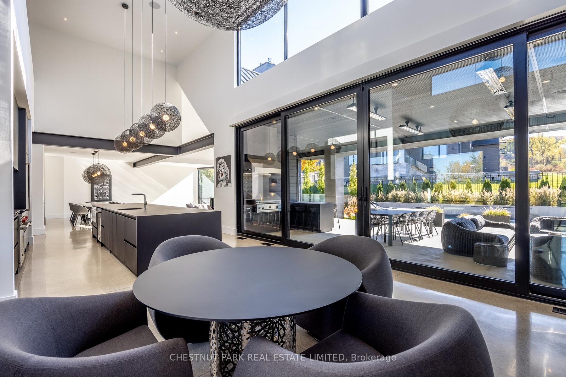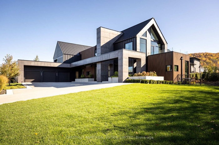 Architecturally stunning custom home in the exclusive Camperdown community, a coveted year-round golf, ski, and outdoor playground that epitomizes four-season living in Southern Georgian Bay. Over 9,000 sq.ft. of refined living space with soaring 20-ft ceilings, exposed beams, heated polished concrete floors and dramatic floor-to-ceiling windows that flood the interior with natural light. The sunken great room with a 24-foot stone fireplace exudes warmth and comfort - a space equally suited for quiet evenings or entertaining a hundred guests with ease. A striking matte-black kitchen anchors the main level with an 18-ft island, Wolf & JennAir appliances, and a fully equipped butler's kitchen for seamless hosting. The private primary wing is a true retreat featuring a fireplace, dual walk-in closets, and a spa-level ensuite with mountain views and a walkout to the hot tub. Upstairs, a junior primary suite impresses with vaulted ceilings, a 6-piece ensuite, and a private terrace, while two additional bedrooms open to a covered patio with escarpment views. The lower level is an entertainer's dream with a games lounge, wet bar, golf simulator, gym, music studio, and two more bedrooms. Outdoors, enjoy resort-inspired living with a waterfall pool, hot tub, and a covered lounge with wood-burning fireplace and built-in BBQ. Legal golf cart access to the Georgian Bay Club, and just minutes to Peaks, Blue Mountain, Thornbury, and Collingwood. A rare offering that captures the very best of four-season living in Southern Georgian Bay.