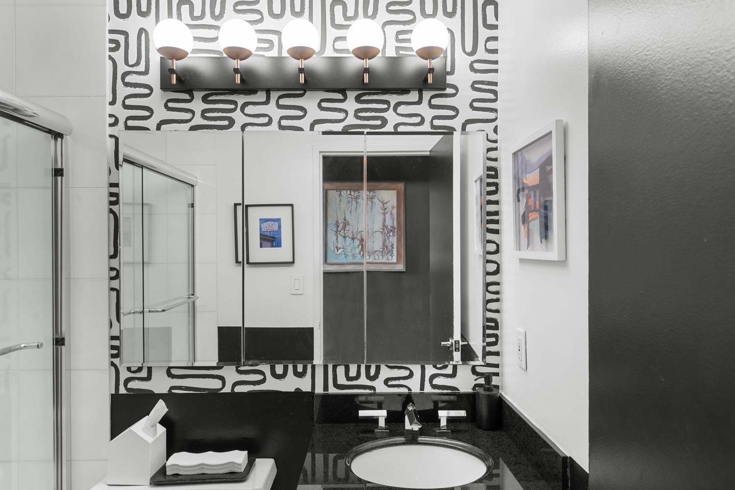 The bedroom features a wall of floor to ceiling closets and is generous enough in size to easily accommodate a King size bed, night stands, an armoire, and even an office desk for those who may work from home. There is a full sized bathroom off of the bedroom with a glass shower door. Previously, this home was flexed into a comfortable 2 bedroom.
