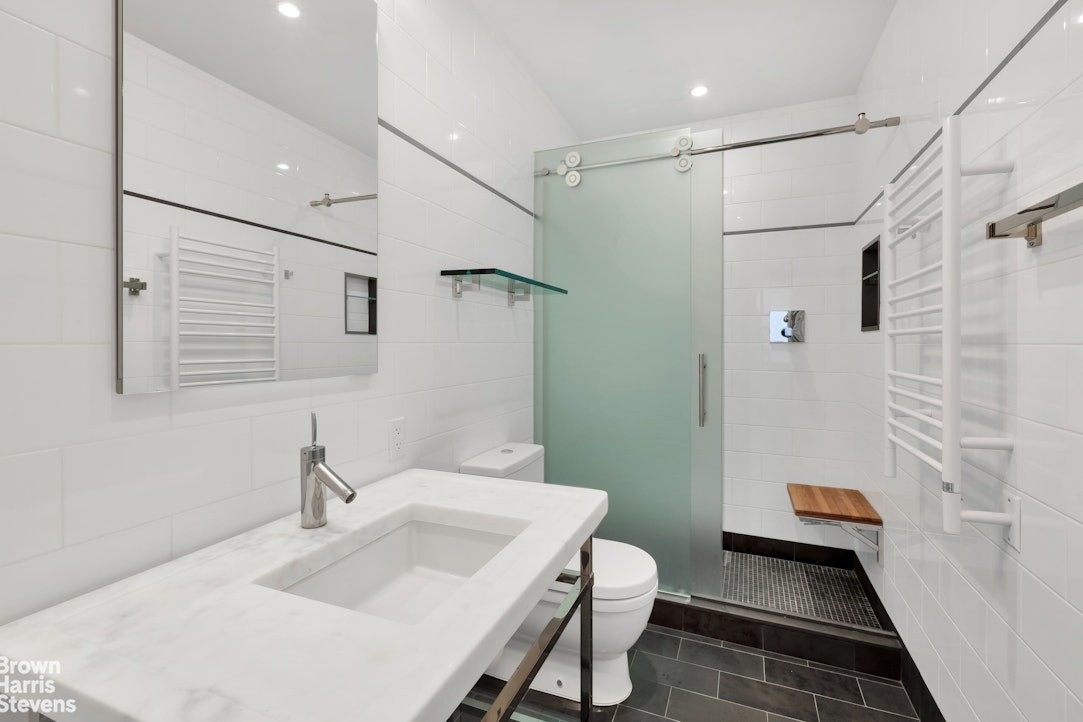 The second bedroom is roomy and includes fitted double closets, while the versatile third bedroom (or home office), enclosed by sliding French doors, has wall-to-wall built in storage. The second bath is crisply tiled and replete with a marble pedestal sink and glass-walled walk-in shower.