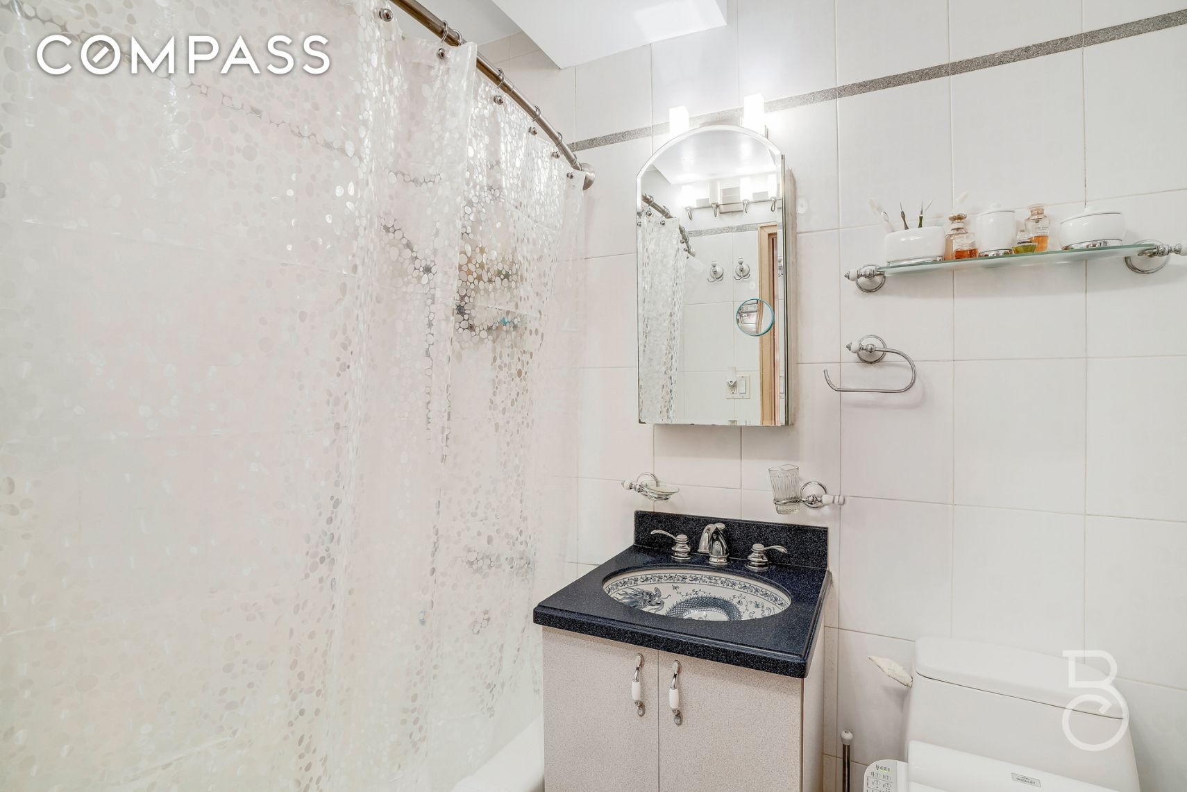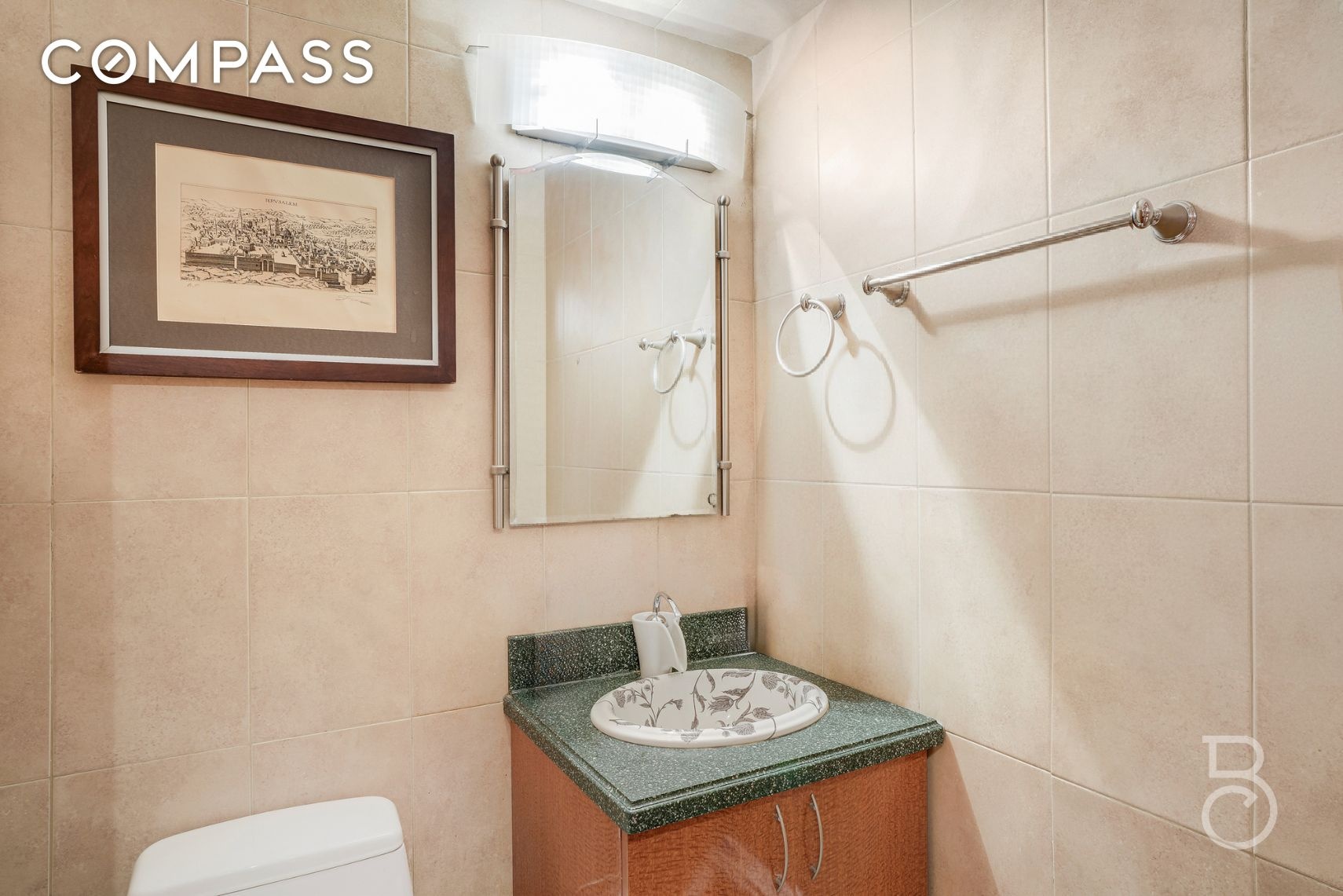 The open living space features warm bamboo floors, custom radiator covers with concealed storage, and bespoke built-ins that reflect a deep appreciation for craftsmanship. The kitchen—anchored by sleek stainless-steel appliances and beautifully tailored cabinetry—offers exceptional storage and a refined sense of order. Both bathrooms exude individuality, with distinctive, sculptural sinks that transform daily rituals into moments of quiet luxury.