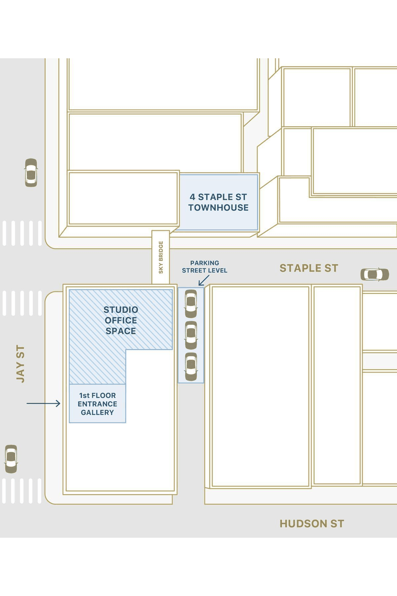 Across Staple Street sits the annex component: an ideal studio, gallery, office, or guest facility. A discreet entrance at 1 Jay Street opens to a reception area, leading down to 2,000+ sf of windowed offices with kitchenette and bath. Private & gated parking spaces adjoin: an unheard-of luxury downtown.