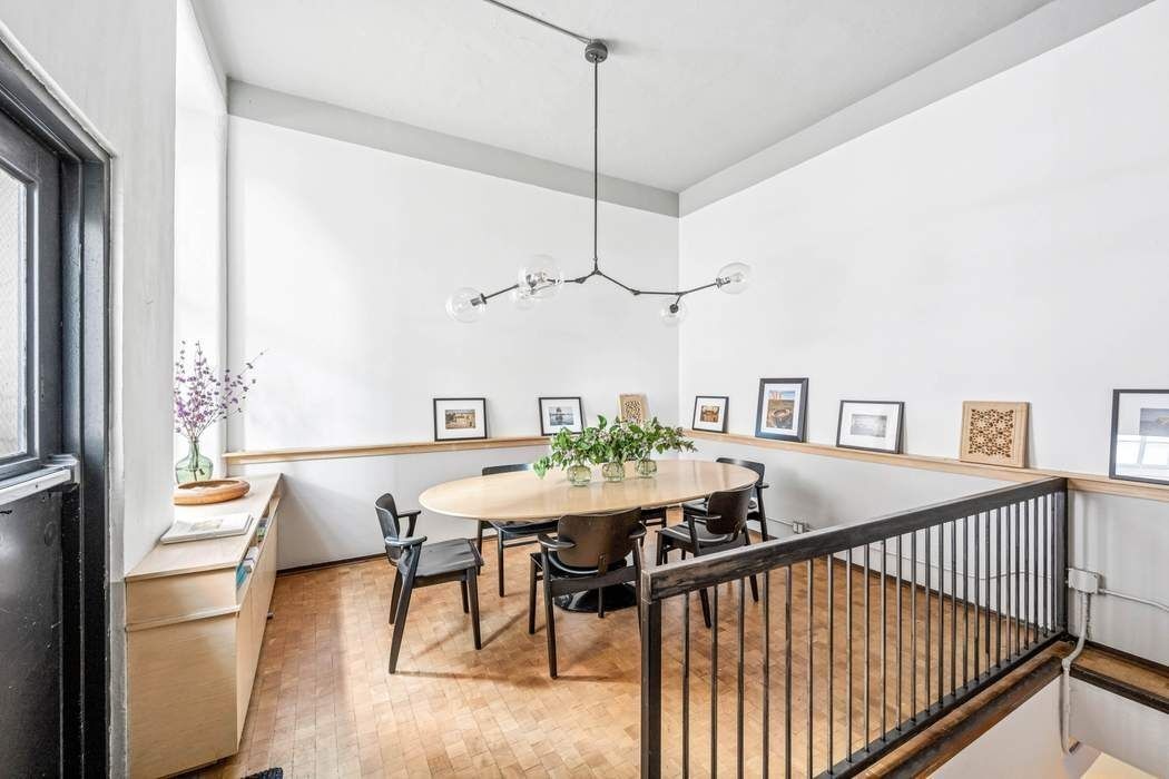 -Main Floor: 13' ceilings, open living/dining anchored by a wood-burning fireplace, built-ins, and a chef’s kitchen with custom cabinets made from reclaimed Coney Island lockers. A windowed nook offers space for breakfast, reading, or work.