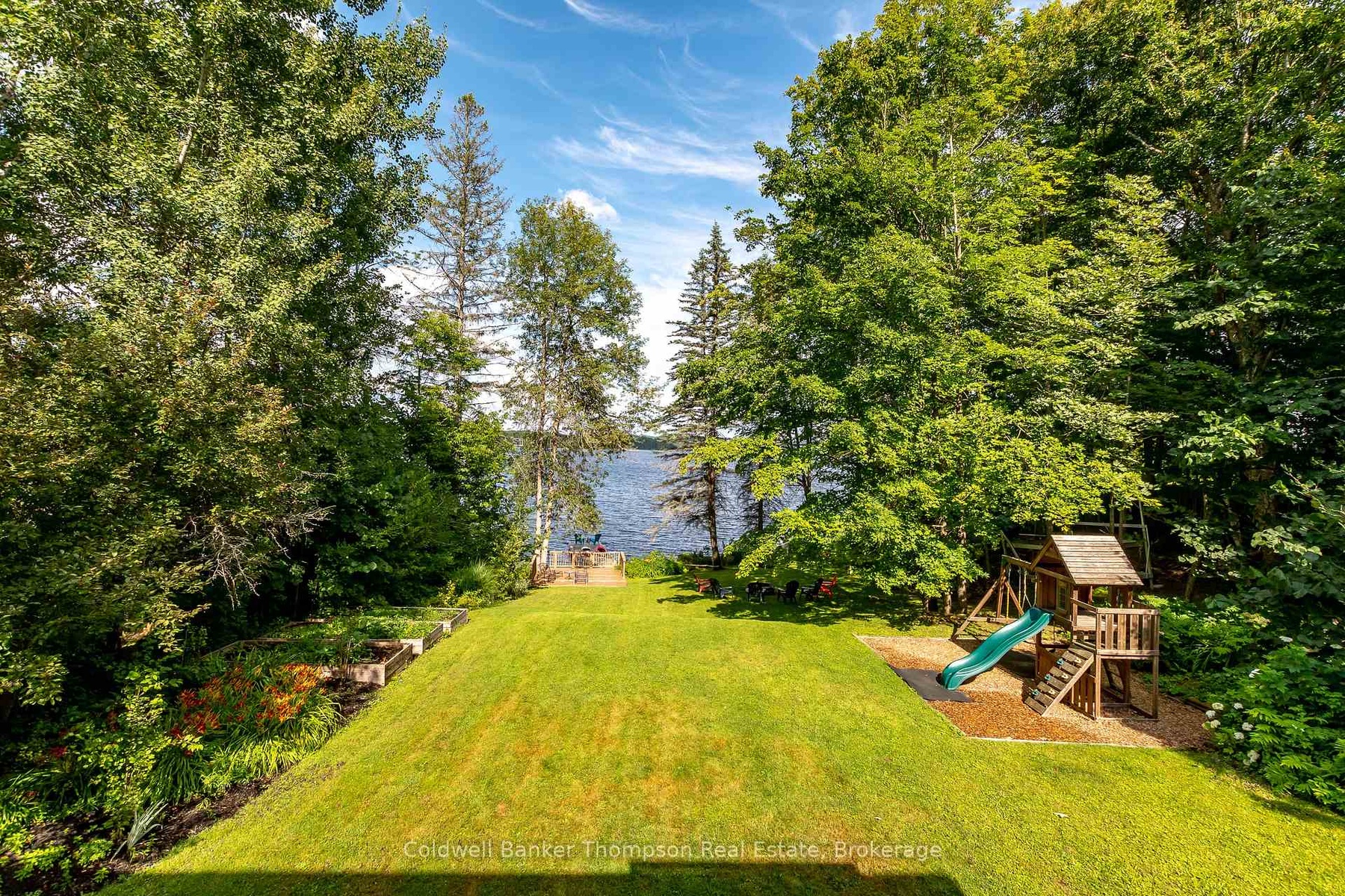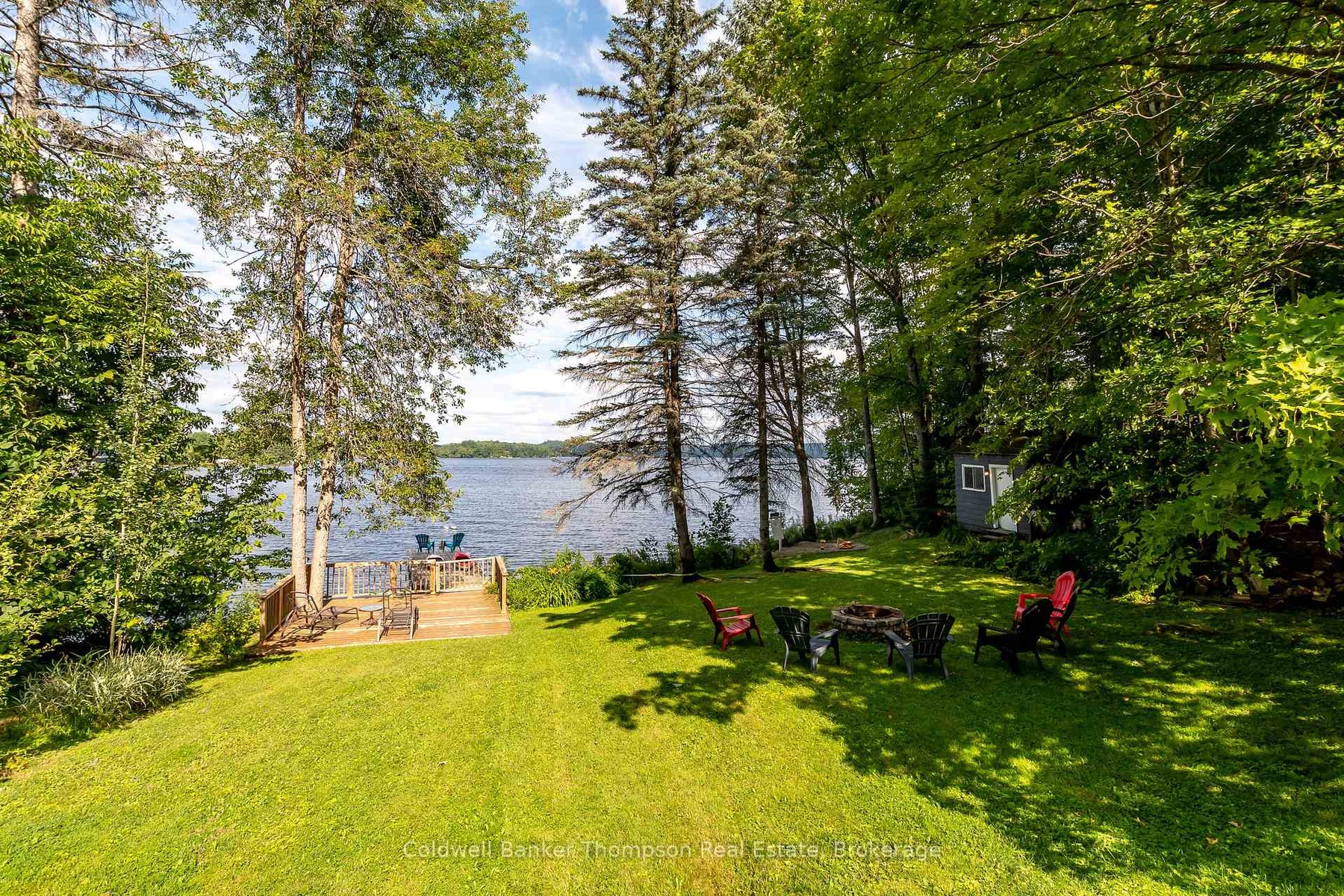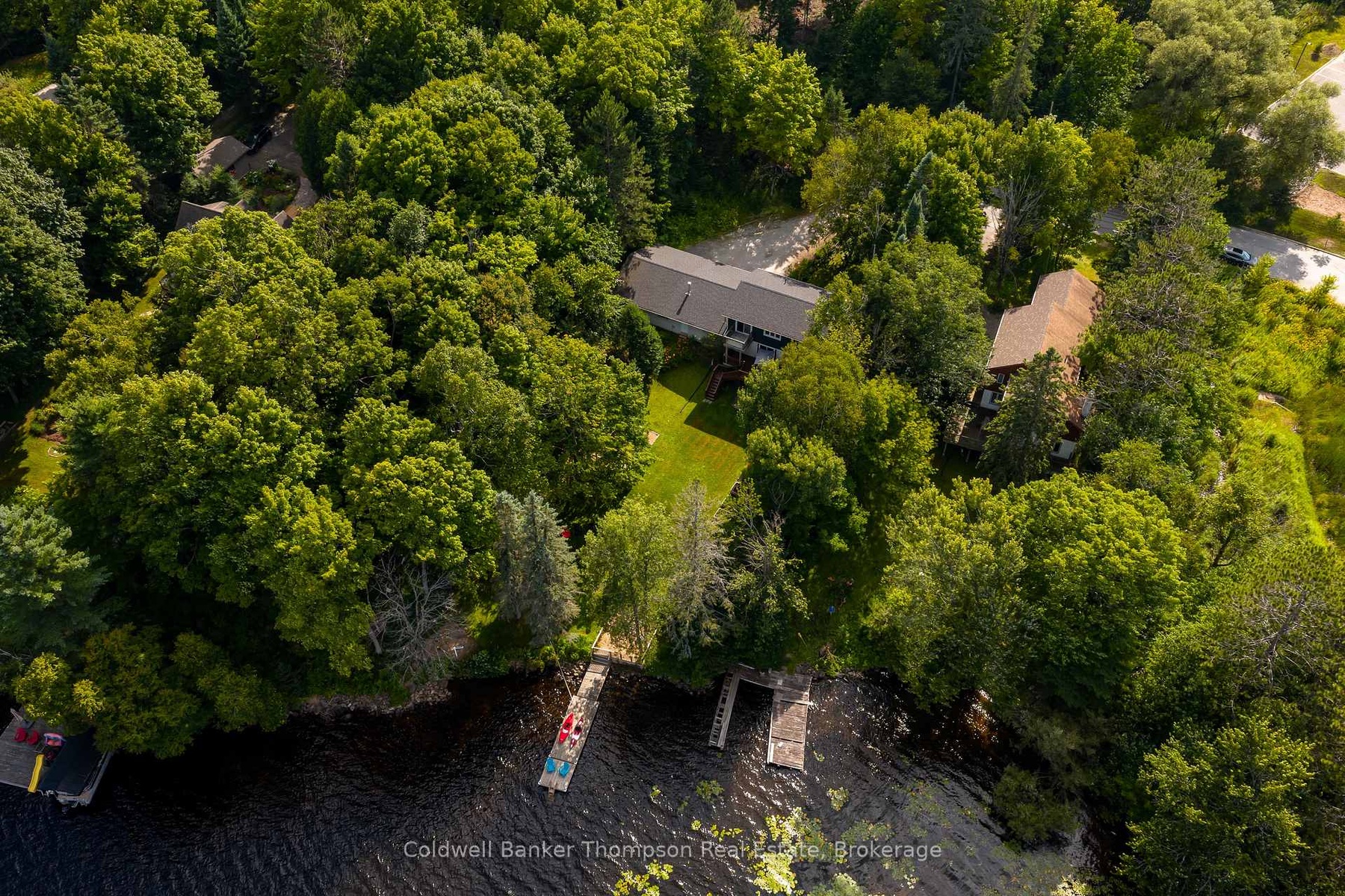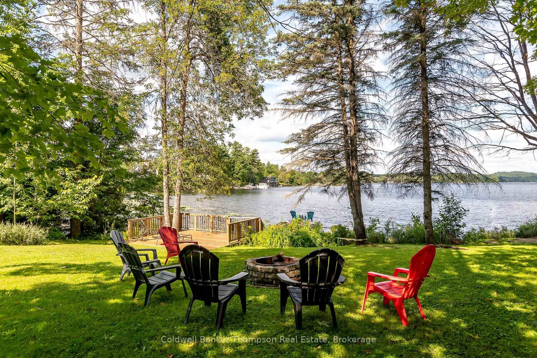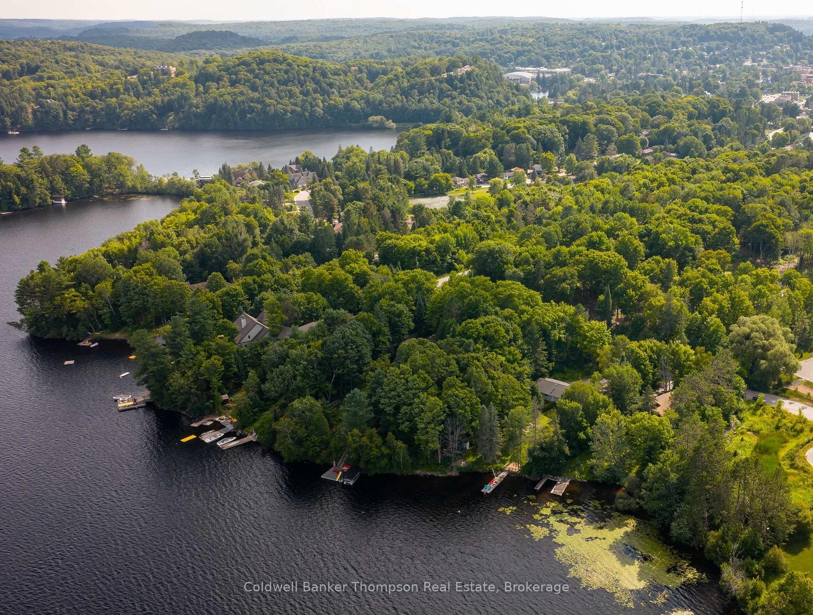 A rare offering on the shores of Fairy Lake, this beautifully upgraded 4-bedroom, 4-bathroom home or cottage offers the ultimate waterfront lifestyle on a completely level lot. Level land at the waters edge is an uncommon and valuable find, providing ease of access for all ages and making outdoor enjoyment, from lawn games to lakeside lounging, effortless and safe. Tucked on a quiet one-way street with minimal traffic, this location offers a peaceful setting just minutes from downtown Huntsville. Enjoy the convenience of full municipal services, including natural gas, water, sewer, and curbside garbage/recycling, a true luxury for a waterfront property. Inside, the home offers over 3,000 sq ft of stylish and functional space. The main floor is bright and open, with a modernized layout featuring a cozy wood stove, natural gas fireplace, and walkouts to a lakeside deck perfect for entertaining. Upstairs, four bedrooms which include three large guest bedrooms share a charming 4-pc bath with a freestanding clawfoot tub. The primary suite offers privacy and comfort with its own 3-pc ensuite, walk-in closet, and private balcony overlooking the lake. The walkout lower level is ideal for family fun and relaxation, featuring a rec room, gas fireplace, wet bar, two dens or offices, and a 3-pc bath. Recent upgrades include: opened main floor (2015), attic re-insulated (R4), sewer connection (2018), full basement reno with upgraded panel (2020), and new shingles (2022). Swim, paddle, or boat from your shoreline with access to over 40 miles of connected waterways. With a four-car garage, ample parking, and walking distance to shops, the LCBO, and Starbucks, this property blends lakeside serenity with in-town convenience. Whether you're seeking a full-time residence or a seasonal getaway, this flat, fully serviced property on Fairy Lake is an exceptional place to make lasting memories.