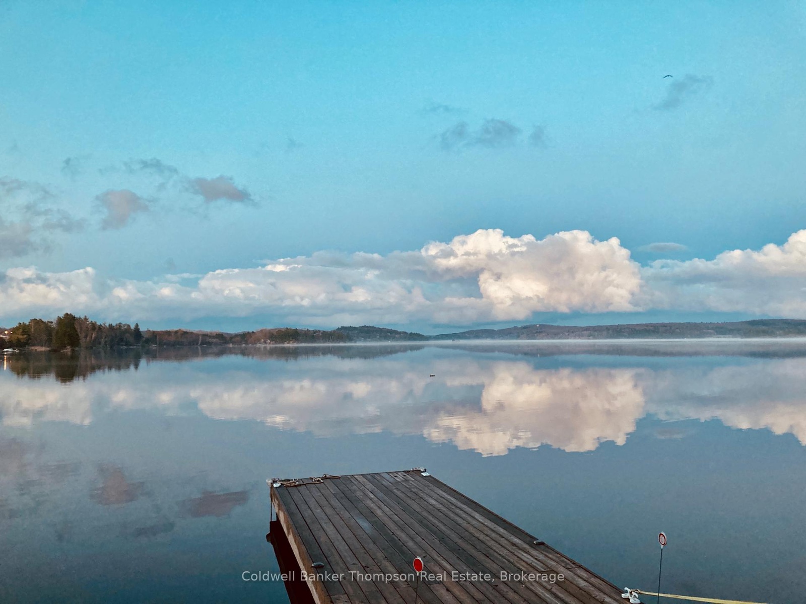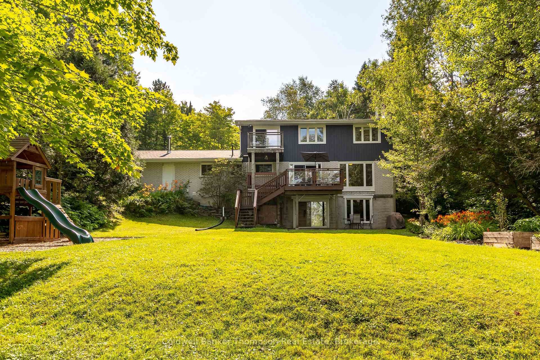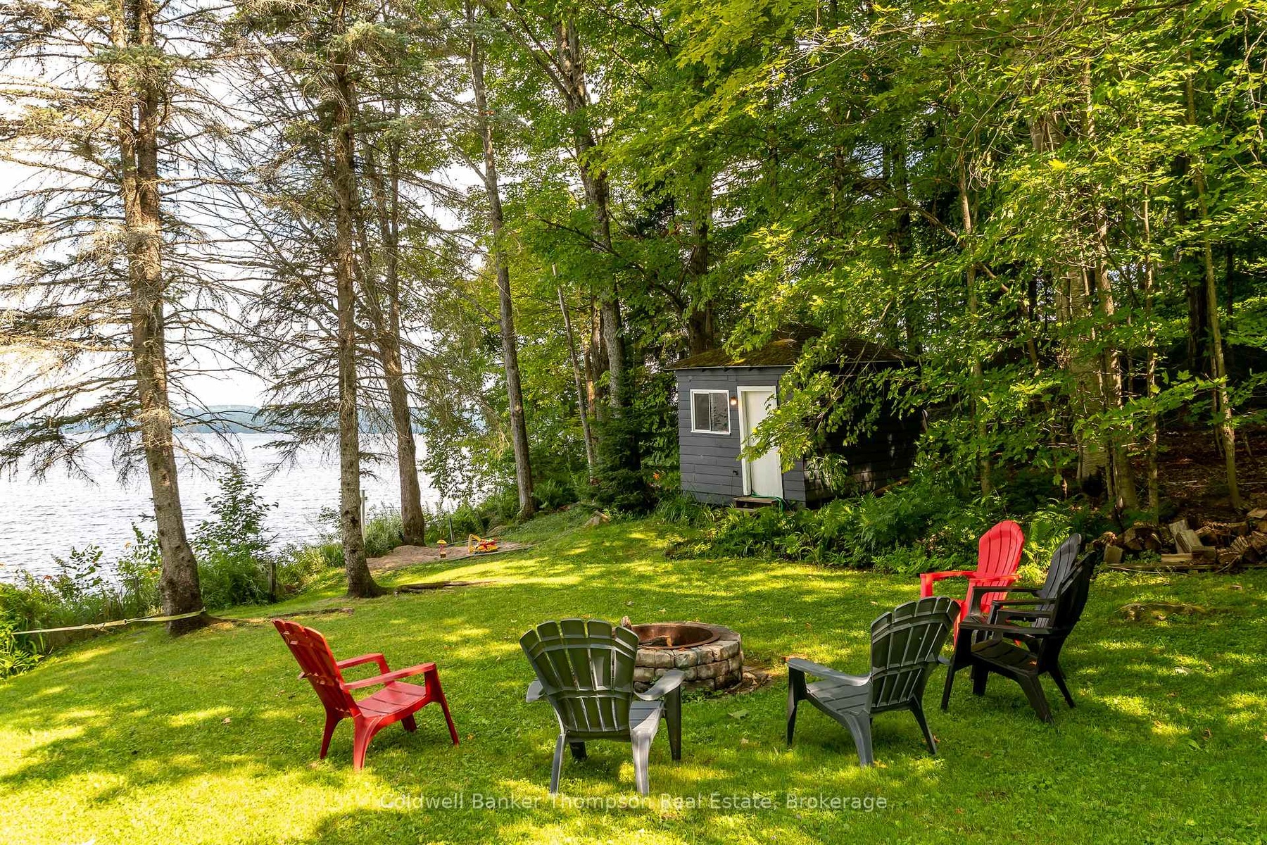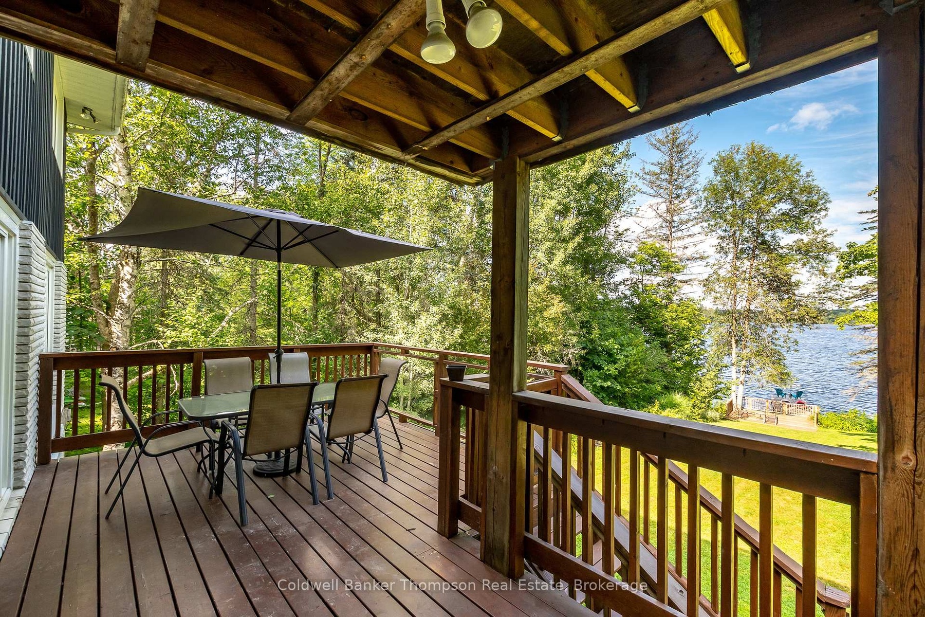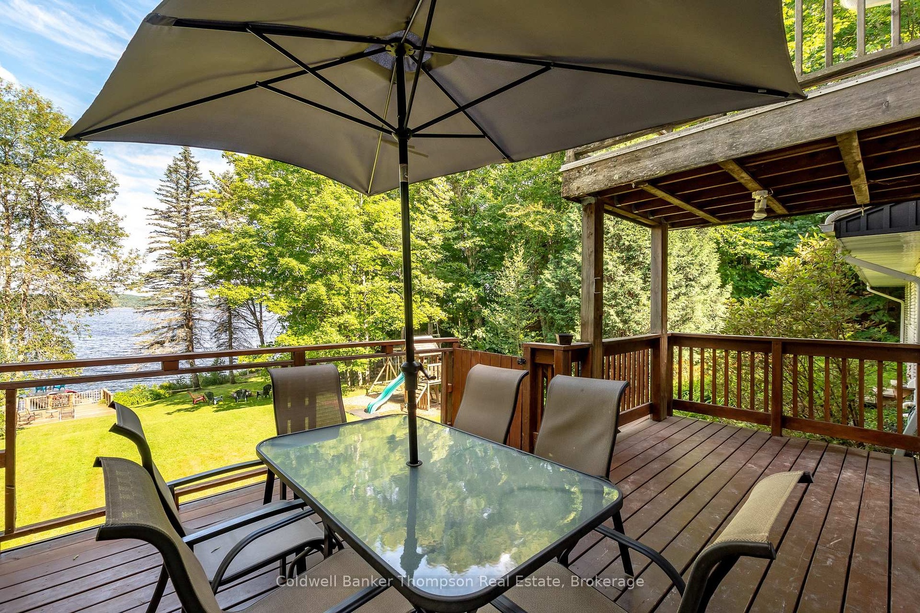 A rare offering on the shores of Fairy Lake, this beautifully upgraded 4-bedroom, 4-bathroom home or cottage offers the ultimate waterfront lifestyle on a completely level lot. Level land at the waters edge is an uncommon and valuable find, providing ease of access for all ages and making outdoor enjoyment, from lawn games to lakeside lounging, effortless and safe. Tucked on a quiet one-way street with minimal traffic, this location offers a peaceful setting just minutes from downtown Huntsville. Enjoy the convenience of full municipal services, including natural gas, water, sewer, and curbside garbage/recycling, a true luxury for a waterfront property. Inside, the home offers over 3,000 sq ft of stylish and functional space. The main floor is bright and open, with a modernized layout featuring a cozy wood stove, natural gas fireplace, and walkouts to a lakeside deck perfect for entertaining. Upstairs, four bedrooms which include three large guest bedrooms share a charming 4-pc bath with a freestanding clawfoot tub. The primary suite offers privacy and comfort with its own 3-pc ensuite, walk-in closet, and private balcony overlooking the lake. The walkout lower level is ideal for family fun and relaxation, featuring a rec room, gas fireplace, wet bar, two dens or offices, and a 3-pc bath. Recent upgrades include: opened main floor (2015), attic re-insulated (R4), sewer connection (2018), full basement reno with upgraded panel (2020), and new shingles (2022). Swim, paddle, or boat from your shoreline with access to over 40 miles of connected waterways. With a four-car garage, ample parking, and walking distance to shops, the LCBO, and Starbucks, this property blends lakeside serenity with in-town convenience. Whether you're seeking a full-time residence or a seasonal getaway, this flat, fully serviced property on Fairy Lake is an exceptional place to make lasting memories.