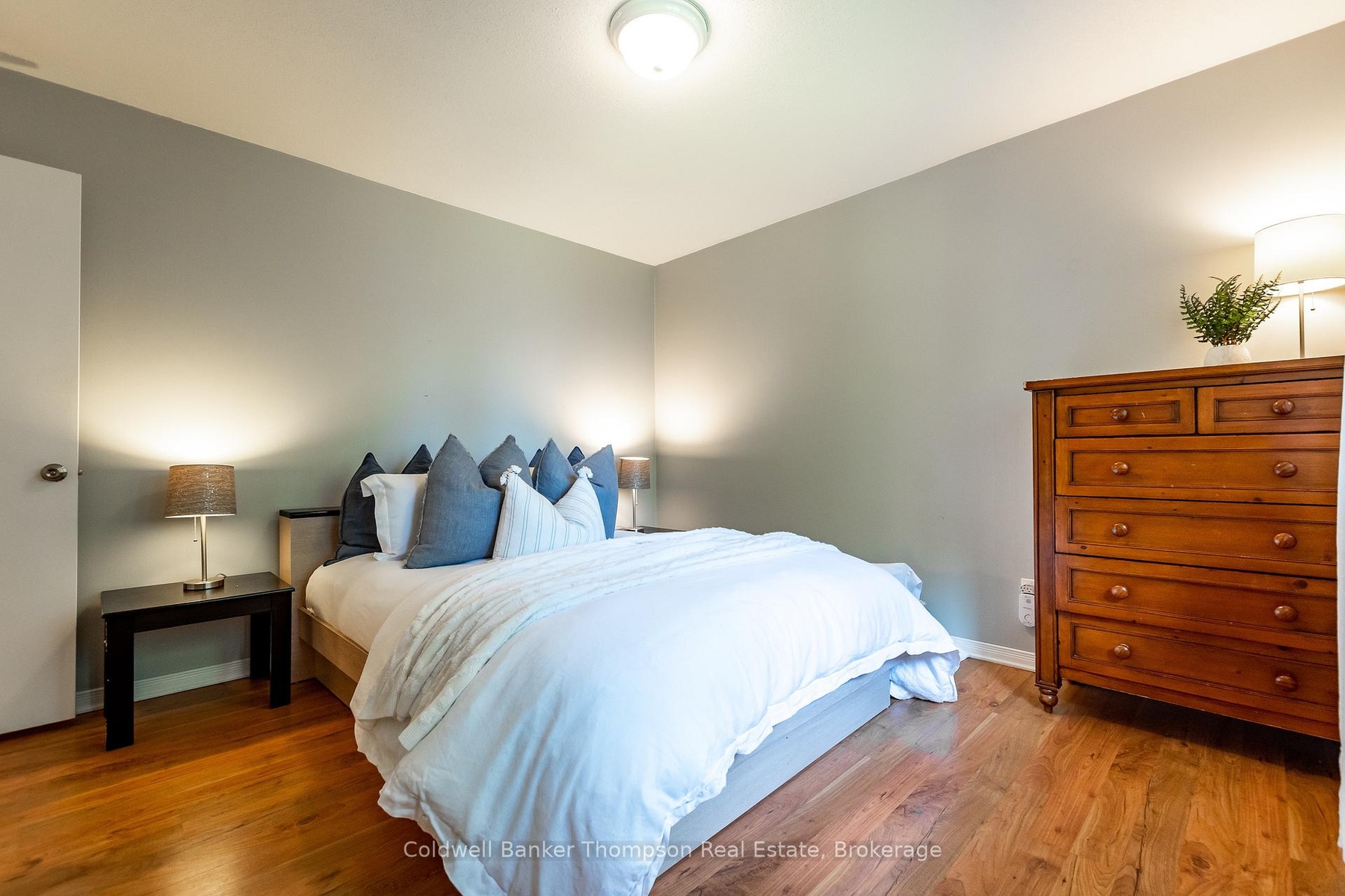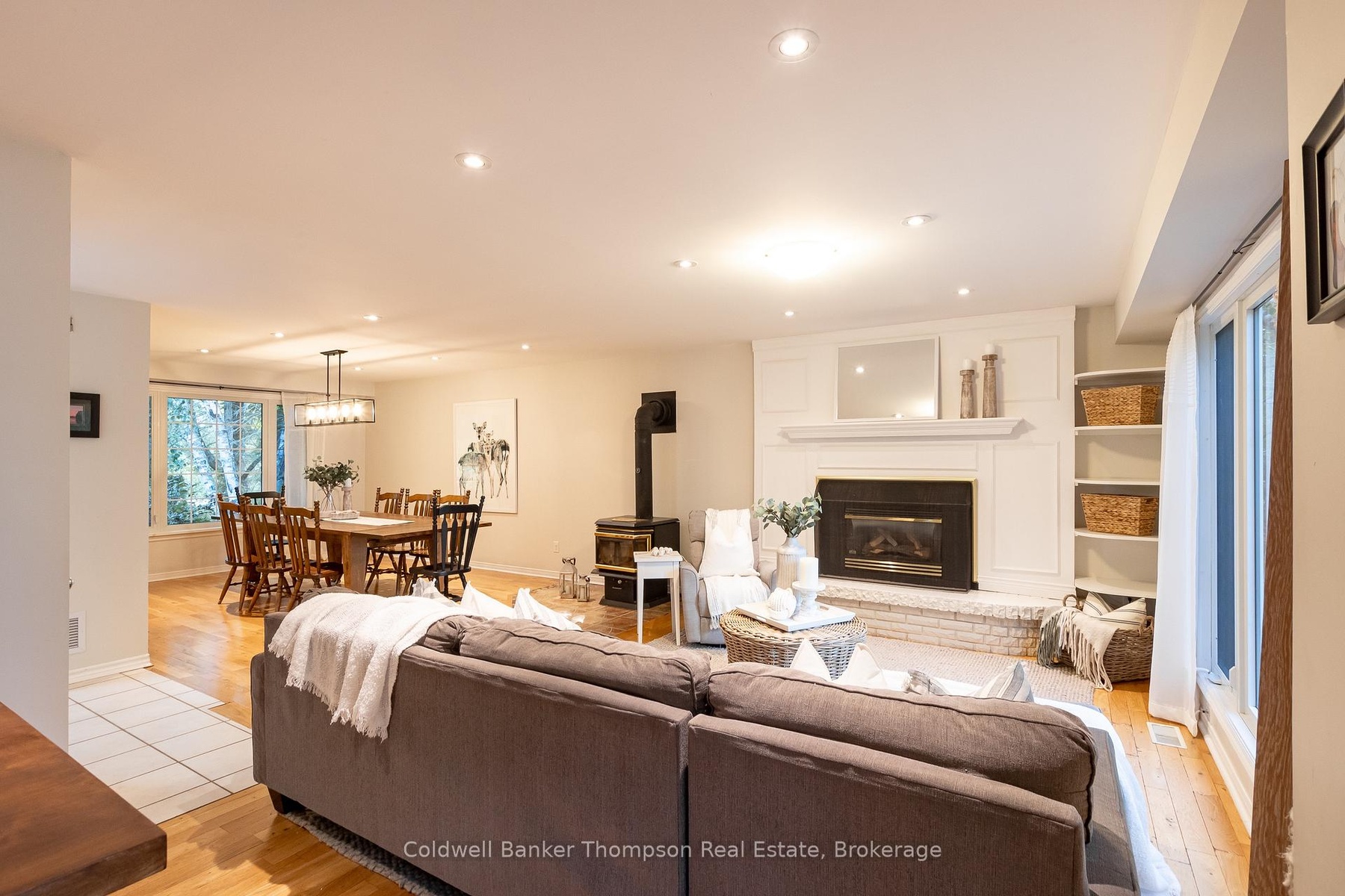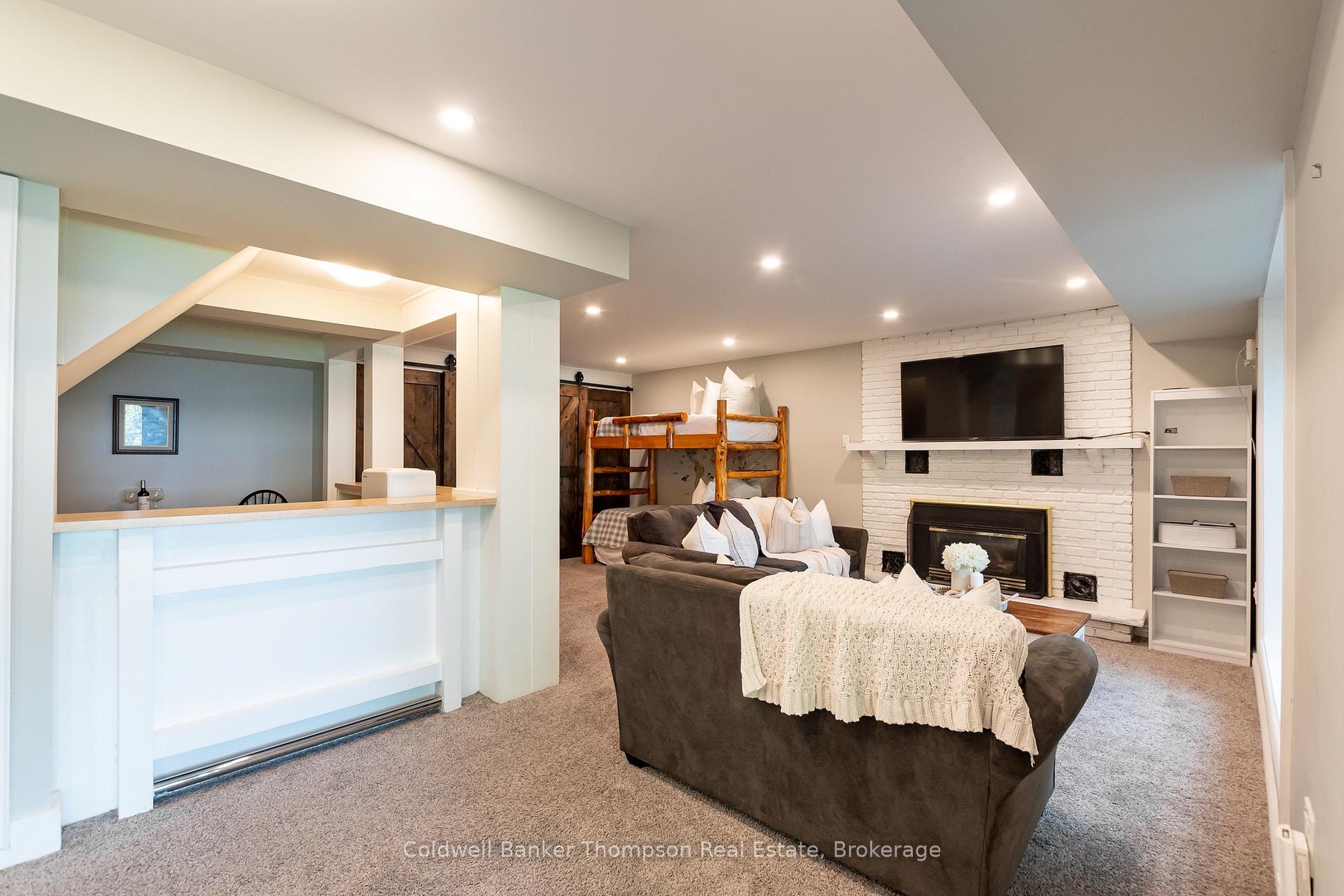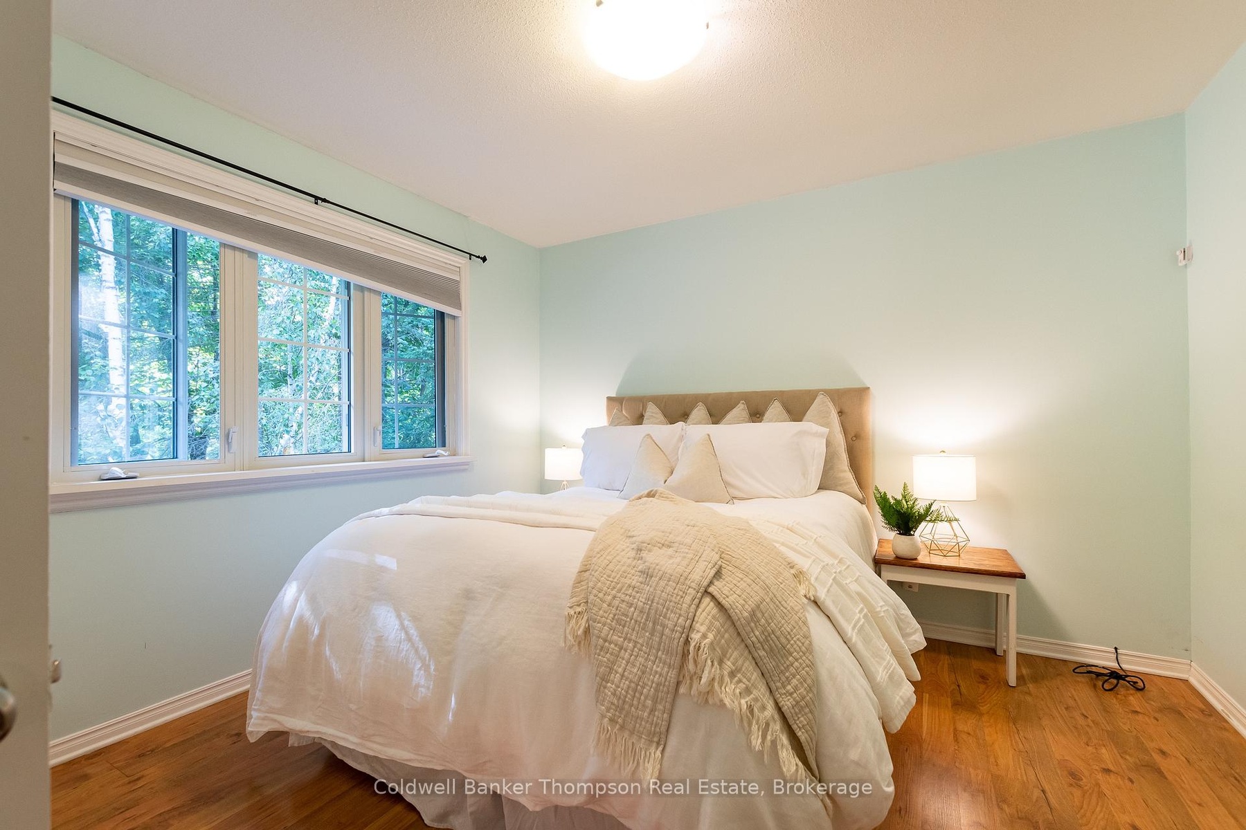 A rare offering on the shores of Fairy Lake, this beautifully upgraded 4-bedroom, 4-bathroom home or cottage offers the ultimate waterfront lifestyle on a completely level lot. Level land at the waters edge is an uncommon and valuable find, providing ease of access for all ages and making outdoor enjoyment, from lawn games to lakeside lounging, effortless and safe. Tucked on a quiet one-way street with minimal traffic, this location offers a peaceful setting just minutes from downtown Huntsville. Enjoy the convenience of full municipal services, including natural gas, water, sewer, and curbside garbage/recycling, a true luxury for a waterfront property. Inside, the home offers over 3,000 sq ft of stylish and functional space. The main floor is bright and open, with a modernized layout featuring a cozy wood stove, natural gas fireplace, and walkouts to a lakeside deck perfect for entertaining. Upstairs, four bedrooms which include three large guest bedrooms share a charming 4-pc bath with a freestanding clawfoot tub. The primary suite offers privacy and comfort with its own 3-pc ensuite, walk-in closet, and private balcony overlooking the lake. The walkout lower level is ideal for family fun and relaxation, featuring a rec room, gas fireplace, wet bar, two dens or offices, and a 3-pc bath. Recent upgrades include: opened main floor (2015), attic re-insulated (R4), sewer connection (2018), full basement reno with upgraded panel (2020), and new shingles (2022). Swim, paddle, or boat from your shoreline with access to over 40 miles of connected waterways. With a four-car garage, ample parking, and walking distance to shops, the LCBO, and Starbucks, this property blends lakeside serenity with in-town convenience. Whether you're seeking a full-time residence or a seasonal getaway, this flat, fully serviced property on Fairy Lake is an exceptional place to make lasting memories.