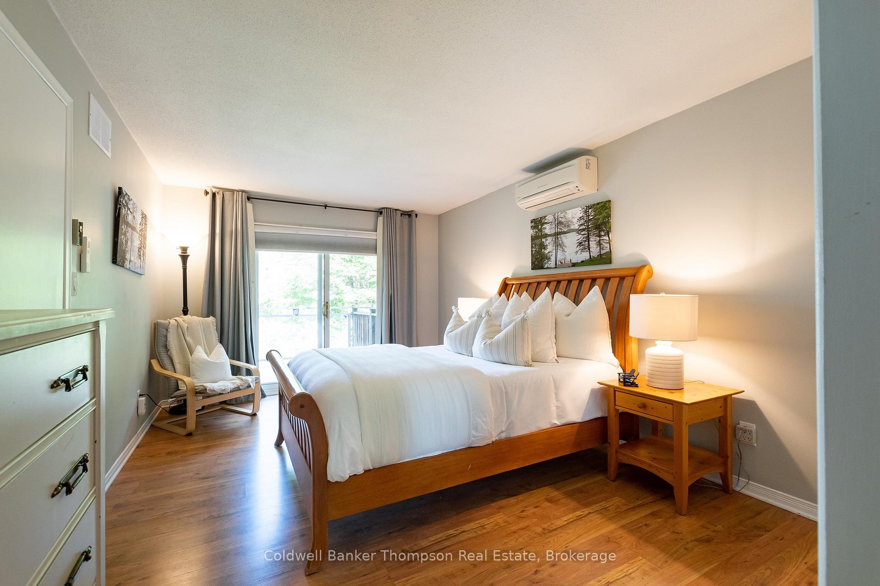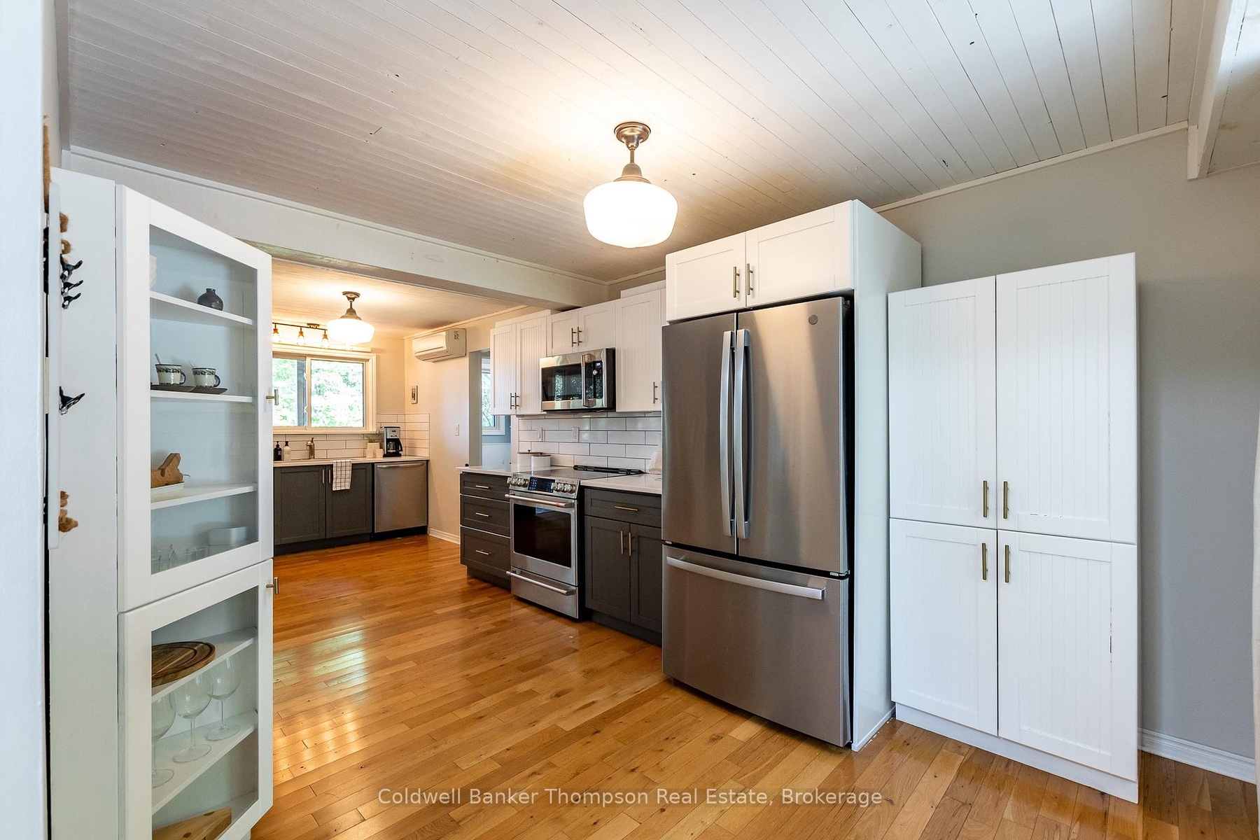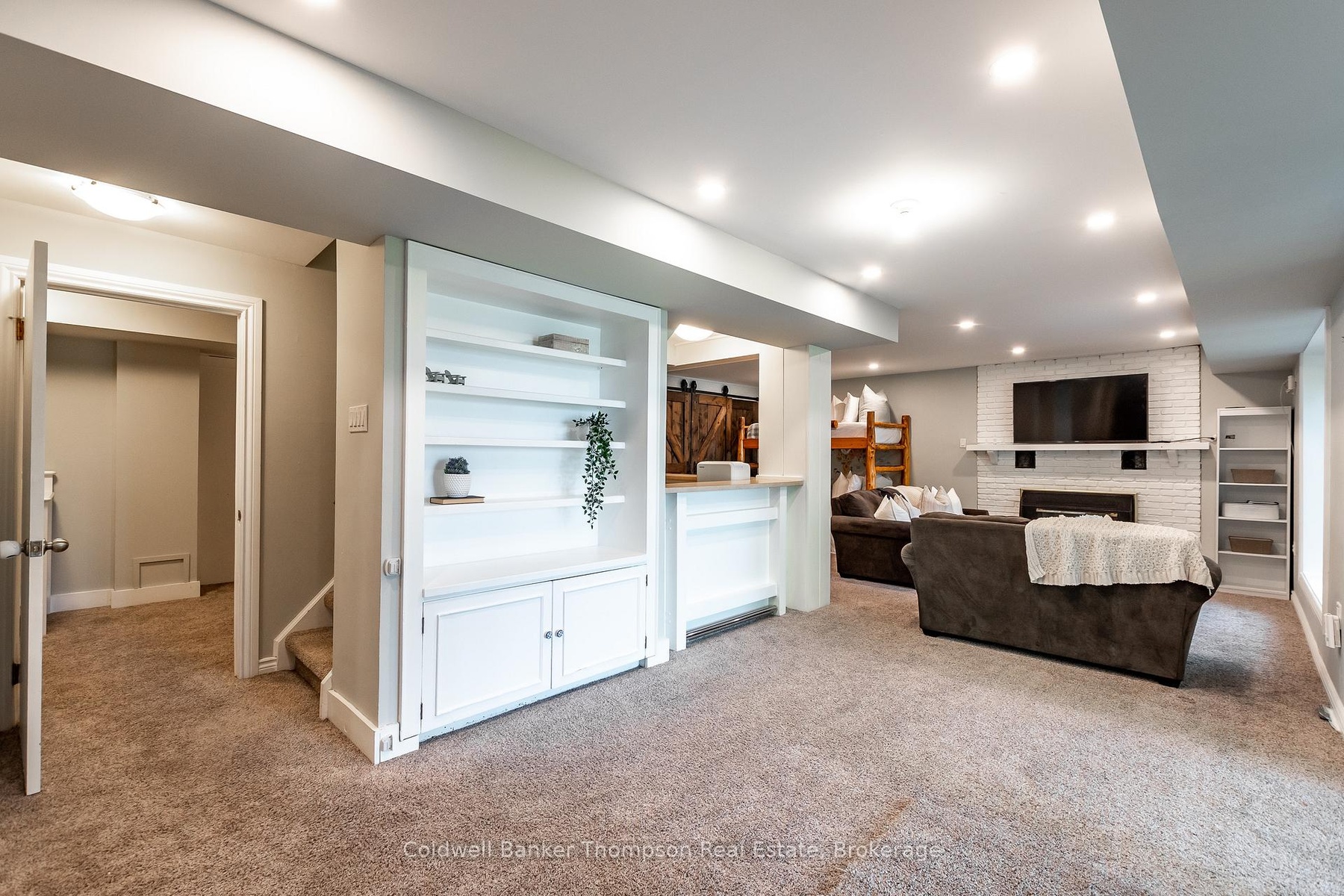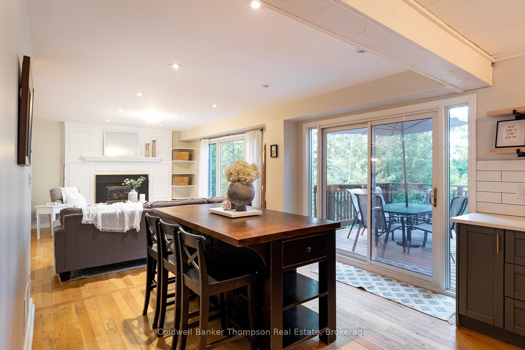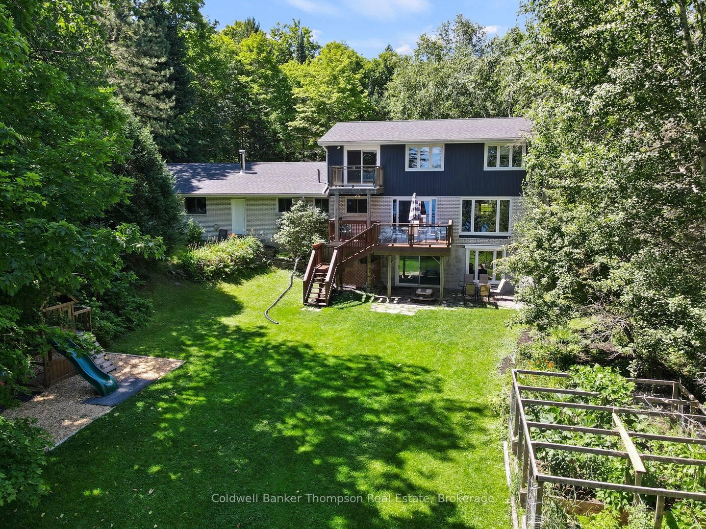 A rare offering on the shores of Fairy Lake, this beautifully upgraded 4-bedroom, 4-bathroom home or cottage offers the ultimate waterfront lifestyle on a completely level lot. Level land at the waters edge is an uncommon and valuable find, providing ease of access for all ages and making outdoor enjoyment, from lawn games to lakeside lounging, effortless and safe. Tucked on a quiet one-way street with minimal traffic, this location offers a peaceful setting just minutes from downtown Huntsville. Enjoy the convenience of full municipal services, including natural gas, water, sewer, and curbside garbage/recycling, a true luxury for a waterfront property. Inside, the home offers over 3,000 sq ft of stylish and functional space. The main floor is bright and open, with a modernized layout featuring a cozy wood stove, natural gas fireplace, and walkouts to a lakeside deck perfect for entertaining. Upstairs, four bedrooms which include three large guest bedrooms share a charming 4-pc bath with a freestanding clawfoot tub. The primary suite offers privacy and comfort with its own 3-pc ensuite, walk-in closet, and private balcony overlooking the lake. The walkout lower level is ideal for family fun and relaxation, featuring a rec room, gas fireplace, wet bar, two dens or offices, and a 3-pc bath. Recent upgrades include: opened main floor (2015), attic re-insulated (R4), sewer connection (2018), full basement reno with upgraded panel (2020), and new shingles (2022). Swim, paddle, or boat from your shoreline with access to over 40 miles of connected waterways. With a four-car garage, ample parking, and walking distance to shops, the LCBO, and Starbucks, this property blends lakeside serenity with in-town convenience. Whether you're seeking a full-time residence or a seasonal getaway, this flat, fully serviced property on Fairy Lake is an exceptional place to make lasting memories.