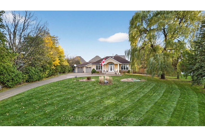 Executive bungalow on nearly an acre in town ! Welcome to unparalleled luxury in this custom stone and stucco bungalow boasting over 5000 sq ft of total finished living space on a rare, almost one acre lot right in town ! The main floor features an impressive foyer leading to an open concept layout. The gourmet kitchen is an entertainers dream, featuring a breakfast bar, pot and pendant lighting, a cozy window seat with hidden storage, pullout shelves in pantry, and a cleverly hidden TV. The space flows seamlessly into the living room, highlighted by a four sided gas fireplace and beautiful hardwood flooring. The primary suite is a private retreat with a walkout to the side yard, a large walk in closet & stunning ensuite with heated floors. A separate walk-down from the mudroom leads to the fully finished lower level, which features a possible in-law setup. It includes 2 bedrooms 1 & 1/2 bathrooms, a second kitchen and a huge rec room with unique colour changing in-ceiling rope lighting & pot lights. The basement also includes an additional hookup for laundry + 3 cold cellars. This home is equipped with an oversized triple attached garage with entrance to the home. Recent mechanical updates include 2 new furnaces (2021), 2 new AC (2021) and a UV air filtration system as well as leaf gutter protection (2021) with lifetime transferrable warranty. A spacious, fully fenced backyard gives privacy and outdoor enjoyment! This truly unique and stunning property offers space, luxury and convenience that is second to none !
