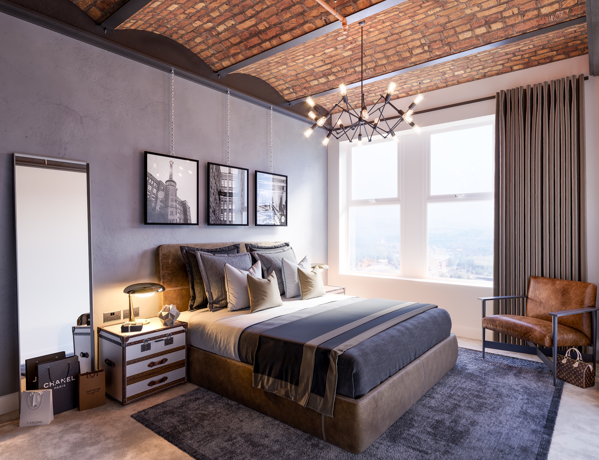 Each apartment has been sympathetically designed to complement the building’s original features, including exposed brickwork, timber detailing, and large multi-paned windows that flood interiors with natural light and showcase panoramic views across Manchester and its suburbs.