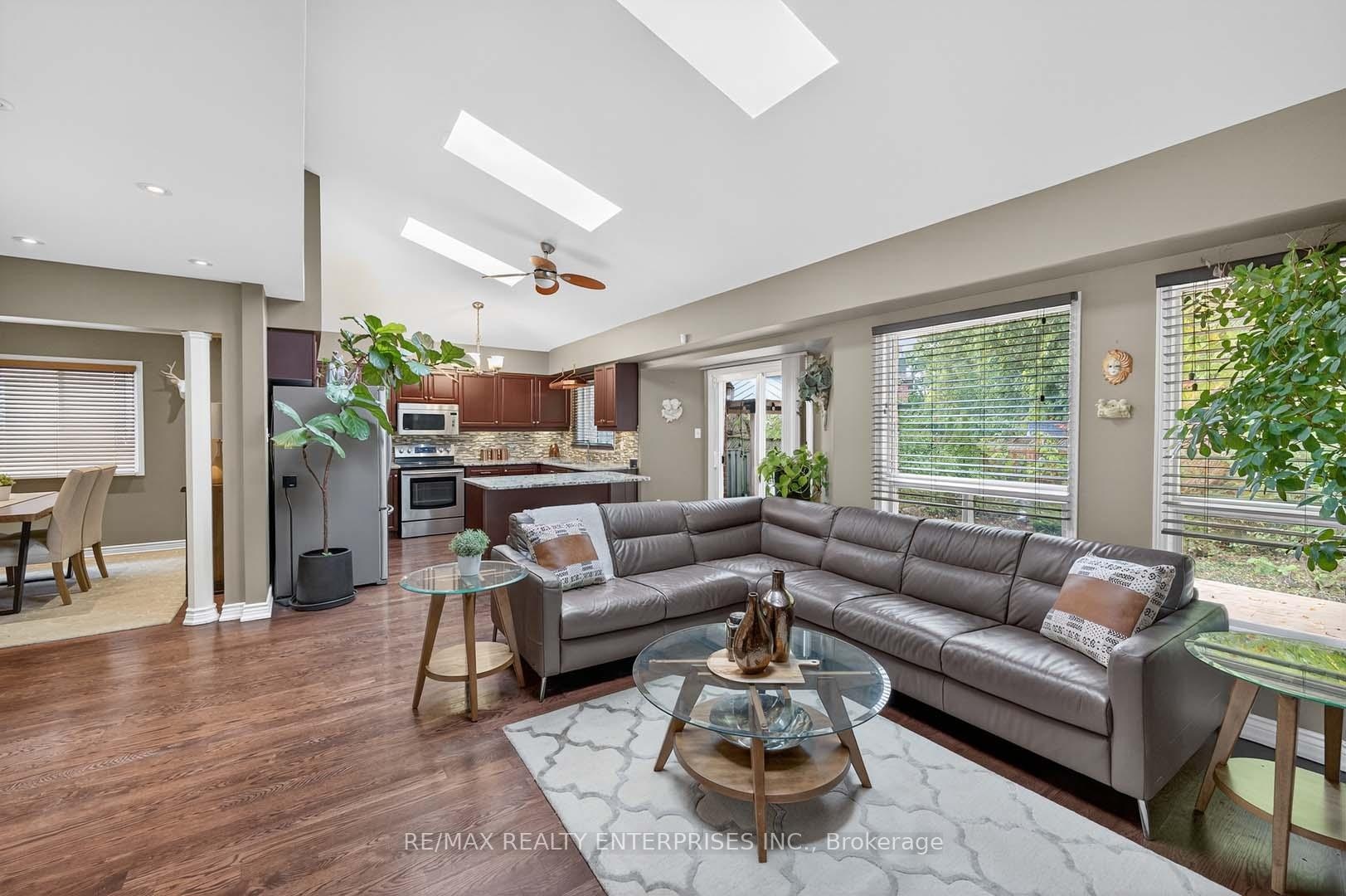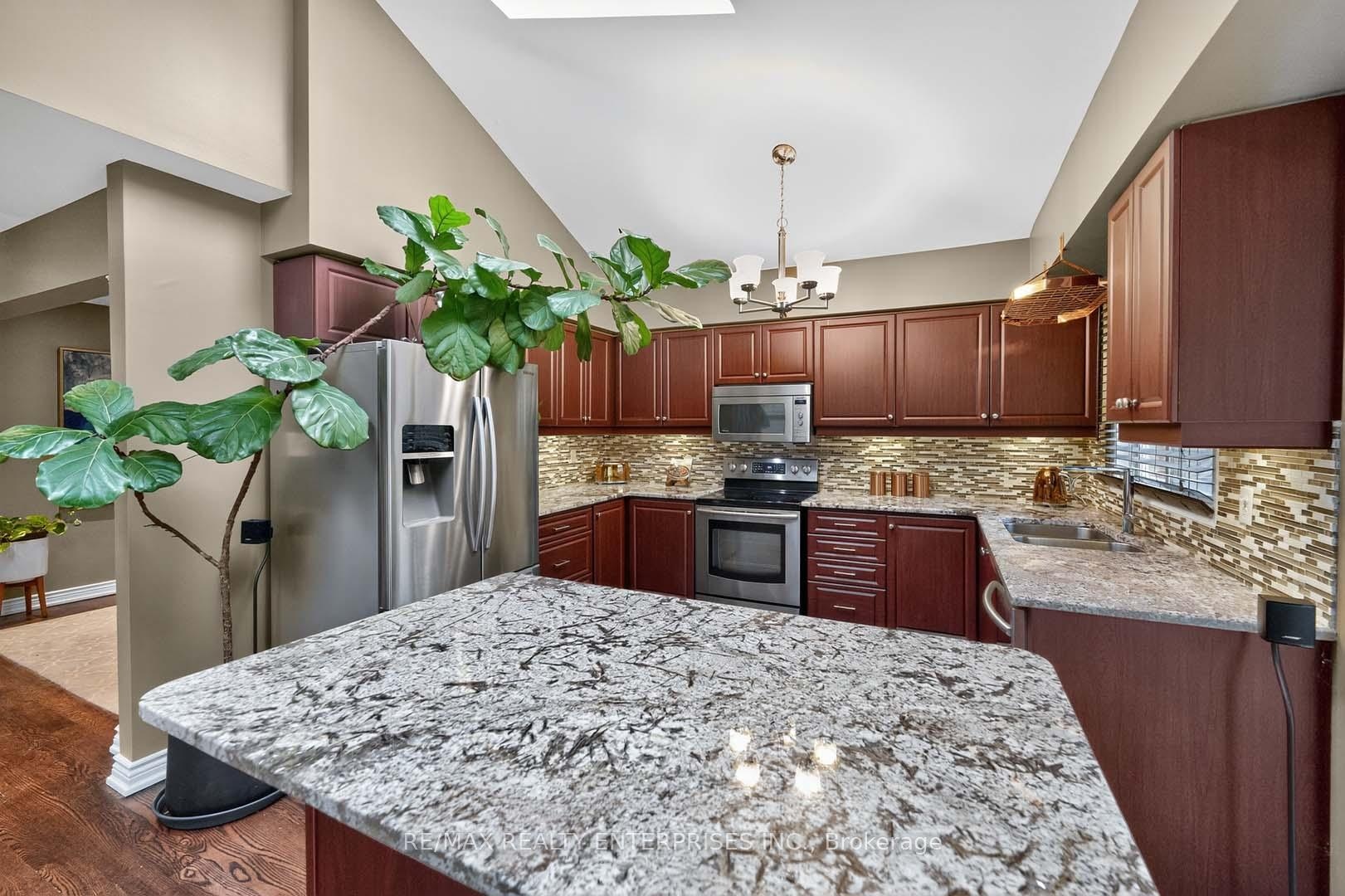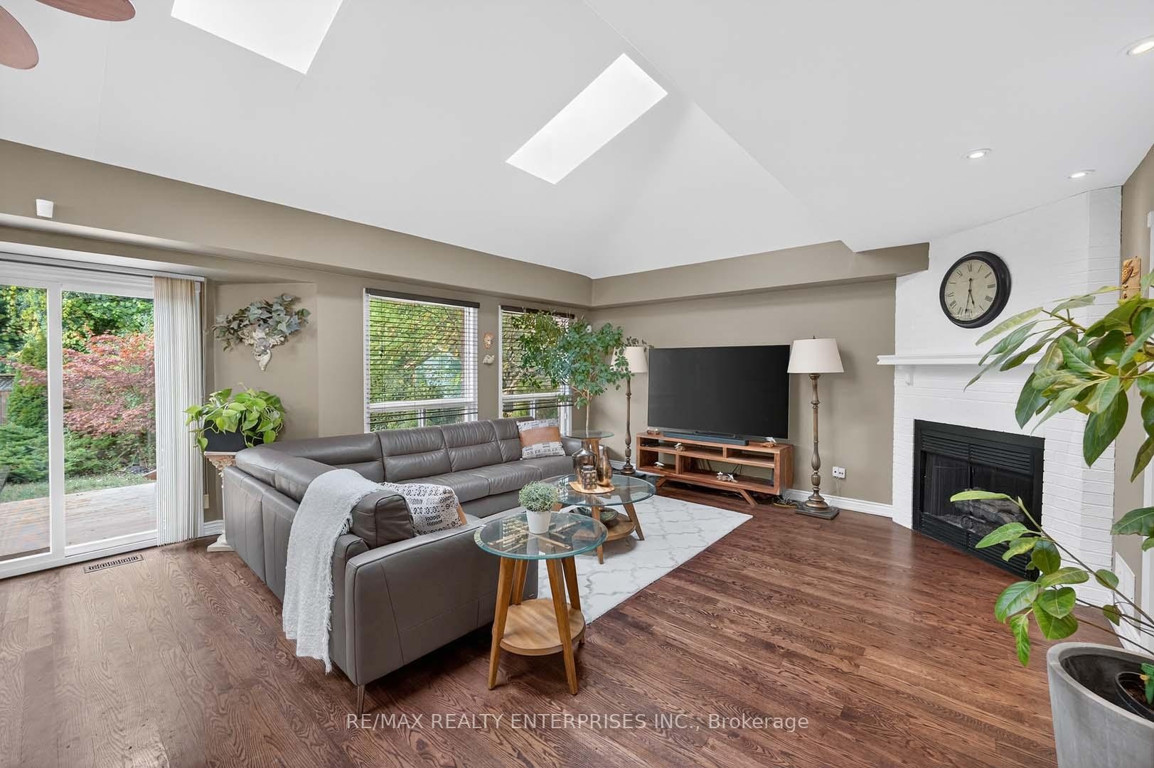 This unique 3+1 bedroom, 3-bath detached home offers nearly 1,900 sq.ft. above grade and a thoughtful blend of comfort, character, and functionality. A truly special home tucked within sought-after Fletcher's West. The heart of the home is the beautifully updated kitchen featuring granite countertops, a breakfast bar, stainless steel appliances, and generous storage - perfect for both everyday meals and effortless entertaining. The main floor showcases hardwood flooring, pot lights, and an inviting family room with a gas fireplace and dramatic vaulted ceilings with skylights that fill the space with natural light. Convenience continues with main floor laundry and direct garage access. Upstairs, the spacious primary suite offers a walk-in closet and a renovated ensuite, complemented by two additional bedrooms and a stylishly updated main bath.The finished basement expands your living space with a large recreation area, dry bar, and a 4th bedroom or flexible office/gym setup. Outside, the backyard feels like a private retreat - backing onto greenspace with a large deck and gazebo (2023) for relaxing or entertaining. Major updates include roof (2022), chimney siding (2019), exterior pot lights (2019), and a new double driveway (2024), enhancing both curb appeal and peace of mind. A rare find combining modern upgrades, timeless charm, and a tranquil natural backdrop - all in a family-friendly neighbourhood close to parks, schools, and every convenience.