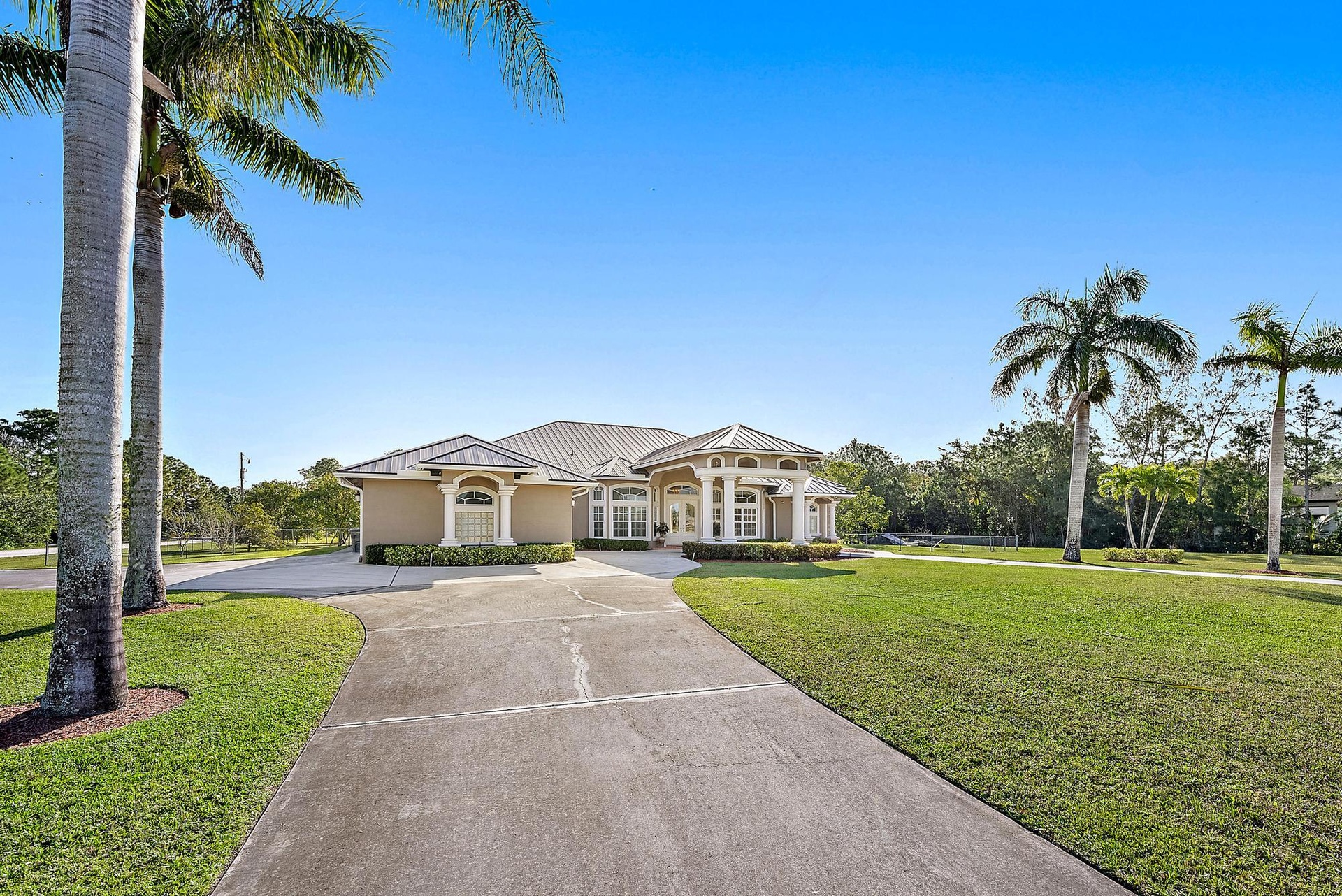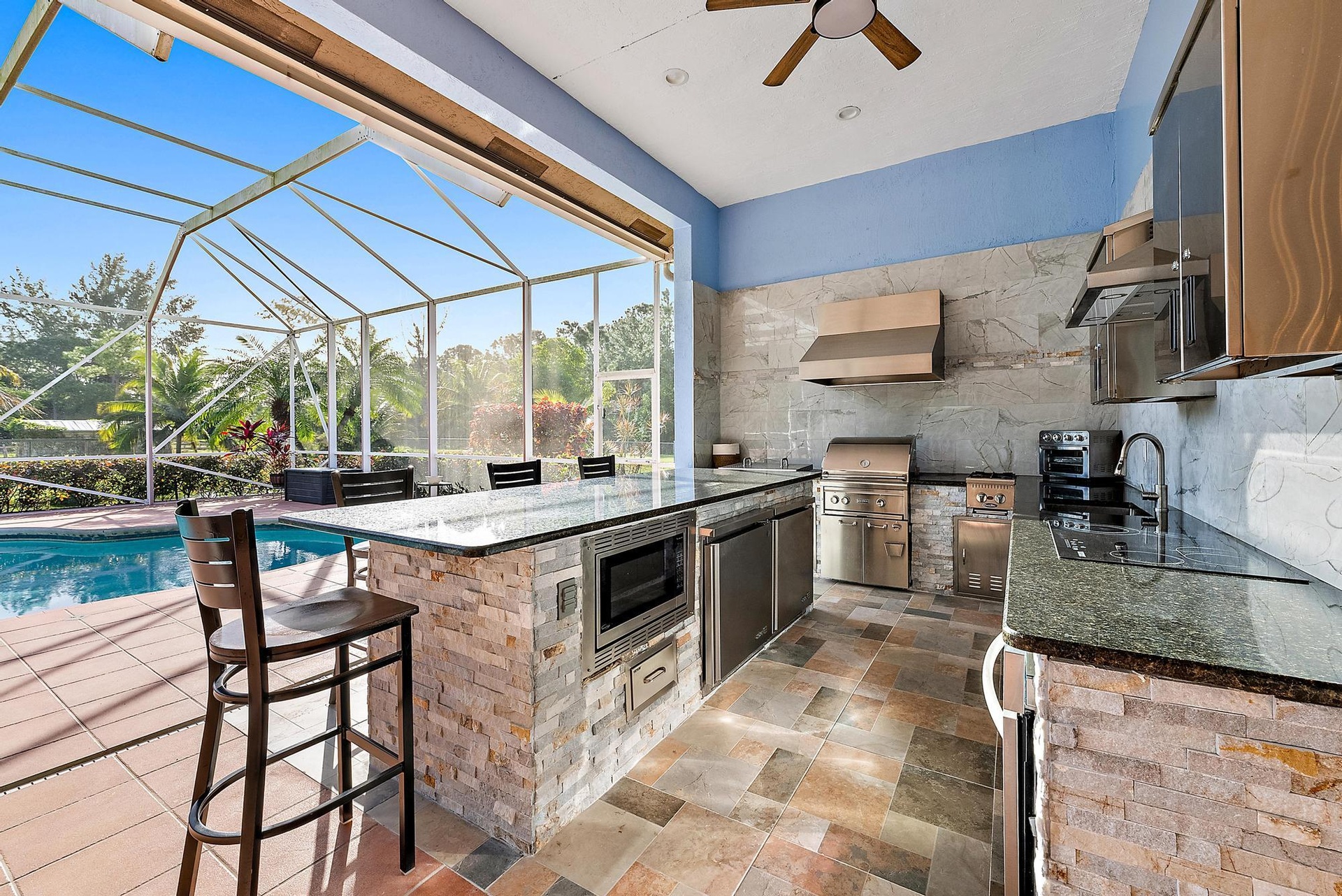 Nestled on 2.5 private acres, this beautifully updated estate blends modern comfort with peaceful outdoor living. The roof was replaced (2023), 4-car garage, & three driveways offer style & convenience. Inside, you'll find 4 spacious bedrooms, a flex room/office, & a luxurious primary suite with coffered ceilings, wood floors, dual sinks, a massive dual-entry shower, & a freestanding tub. The chef's kitchen, remodeled in 2021, features Quartzite counters, a large island, wine bar, steam oven, built-in coffee maker, & stainless-steel appliances. Step outside to your entertainer's paradise -- a screened-in pool (new pump installed - 2022), covered lounge, & a fully equipped outdoor kitchen with multiple grills, cooktops, sink, refrigerator, freezer & microwave.