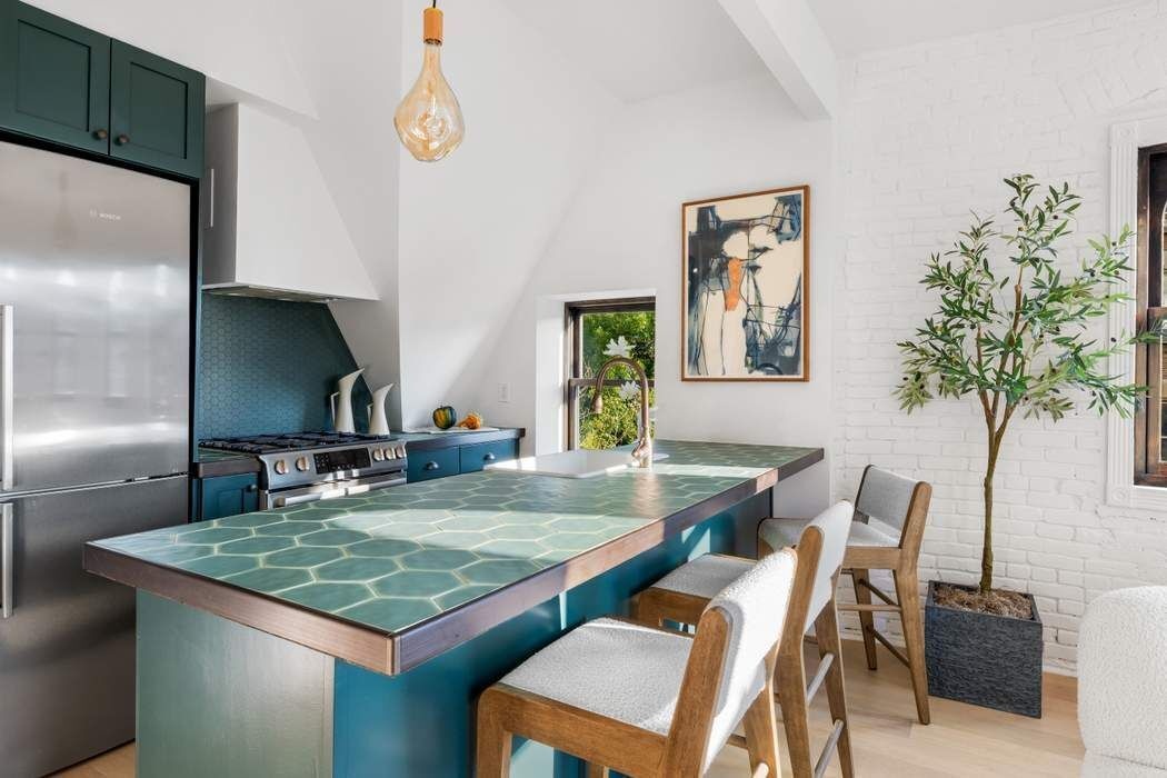 Sunlight floods the grand rotunda living room, wrapped in seven curved windows with south, east, and north exposures, and framed by exposed brick walls that whisper of the home’s storied past. Beyond, glimpses of the Midtown skyline shimmer above the neighborhood rooftops, while the open kitchen and dining area extend the space for effortless entertaining. The kitchen features Bosch appliances—including a five-burner range with a vented hood—and distinctive hexagonal tile counters that blend artistry with function.
