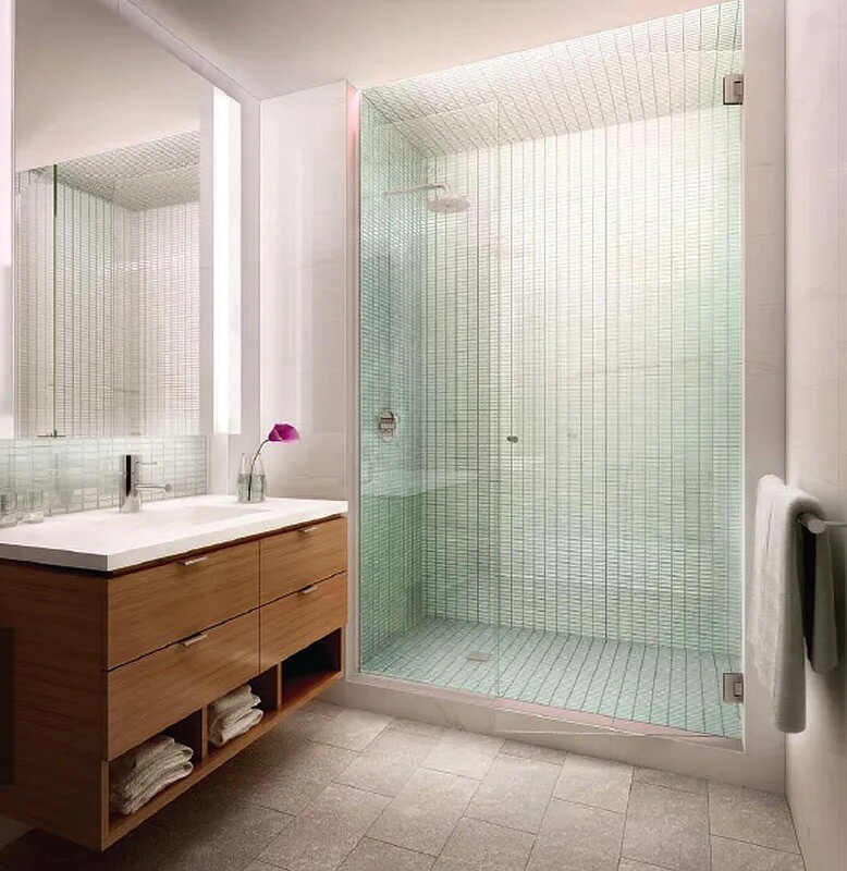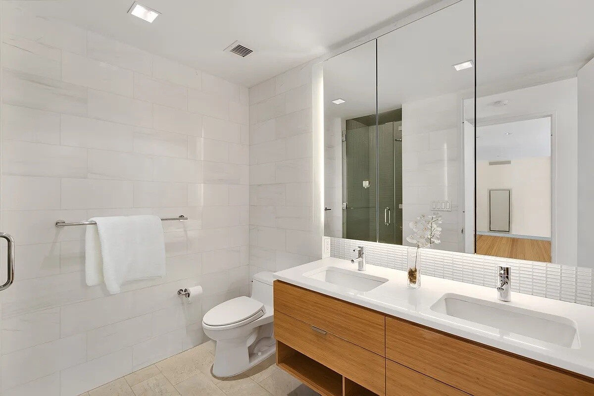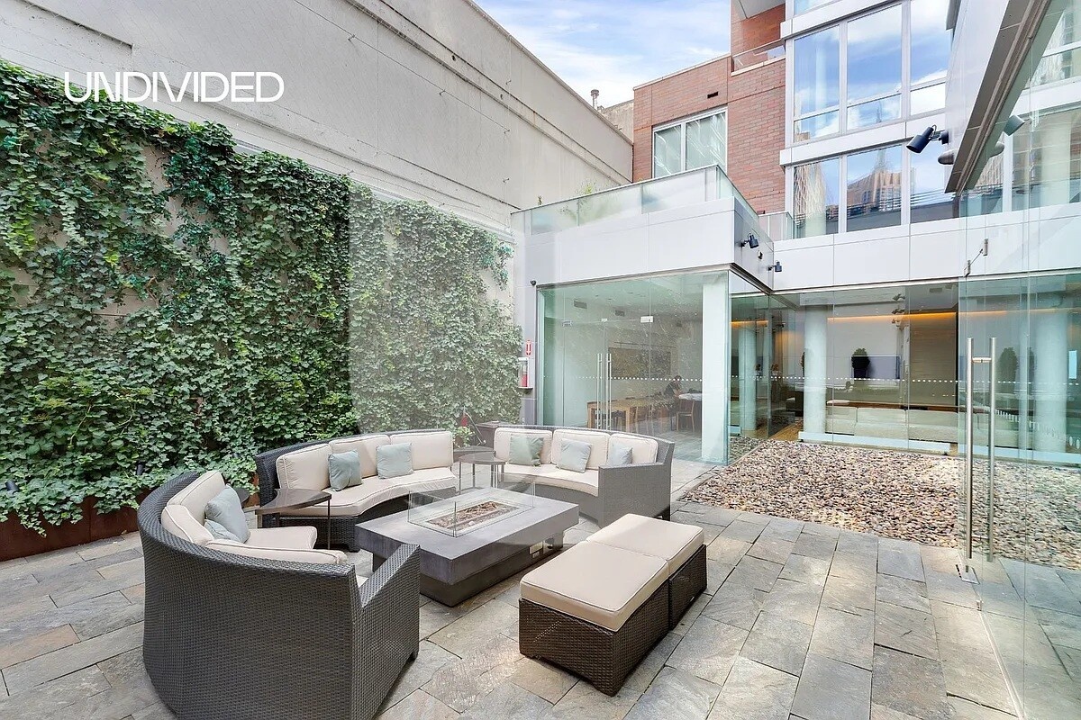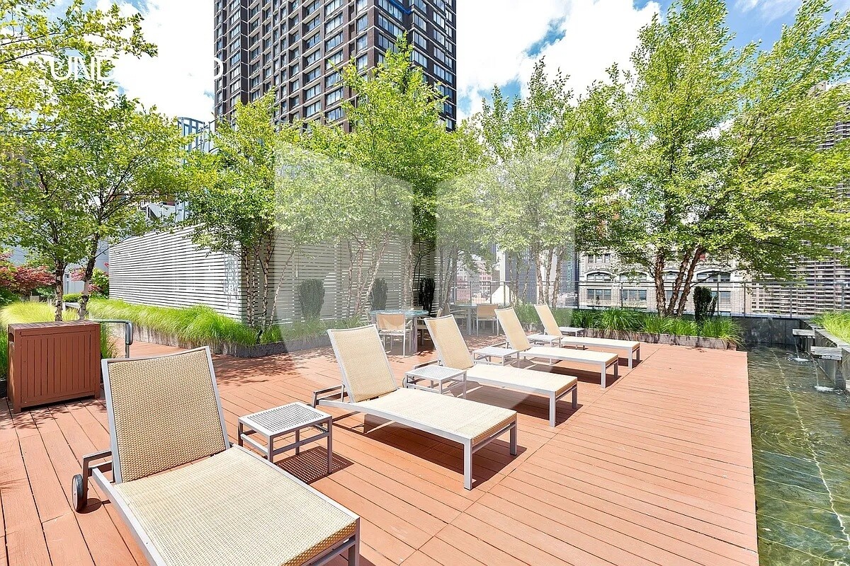 The four-piece master bathroom has a double vanity sink, a separate stall shower, and a deep soaking tub. The bathroom interiors feature Bianco Dolomiti marble walls, sparkling quartzite tile floors, beautiful glass mosaic tiles, and Kohler and Grohe fixtures. Enjoy warm summer evenings on your own private terrace. Measuring over 180 sf, this private terrace is spacious enough to comfortably host friends and family. Residents gain exclusive access to amenities that include a 24-hr concierge, resident lounge with an entertainment area, Exterior garden courtyard with a working fireplace. In the basement is a bike room, a fitness room, and a large laundry room. Also, there is an approx. 5,000 square foot rooftop garden on the 12th floor is perfect for lounging on the sun deck and catching views of the East River. Take in panoramic views of the city overlooking the Chrysler Building and Empire State Building. The recreational area provides a barbecue grill and an area for playing mini-golf.