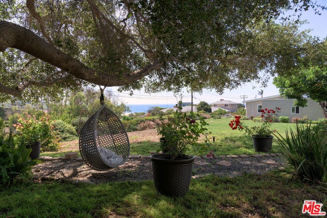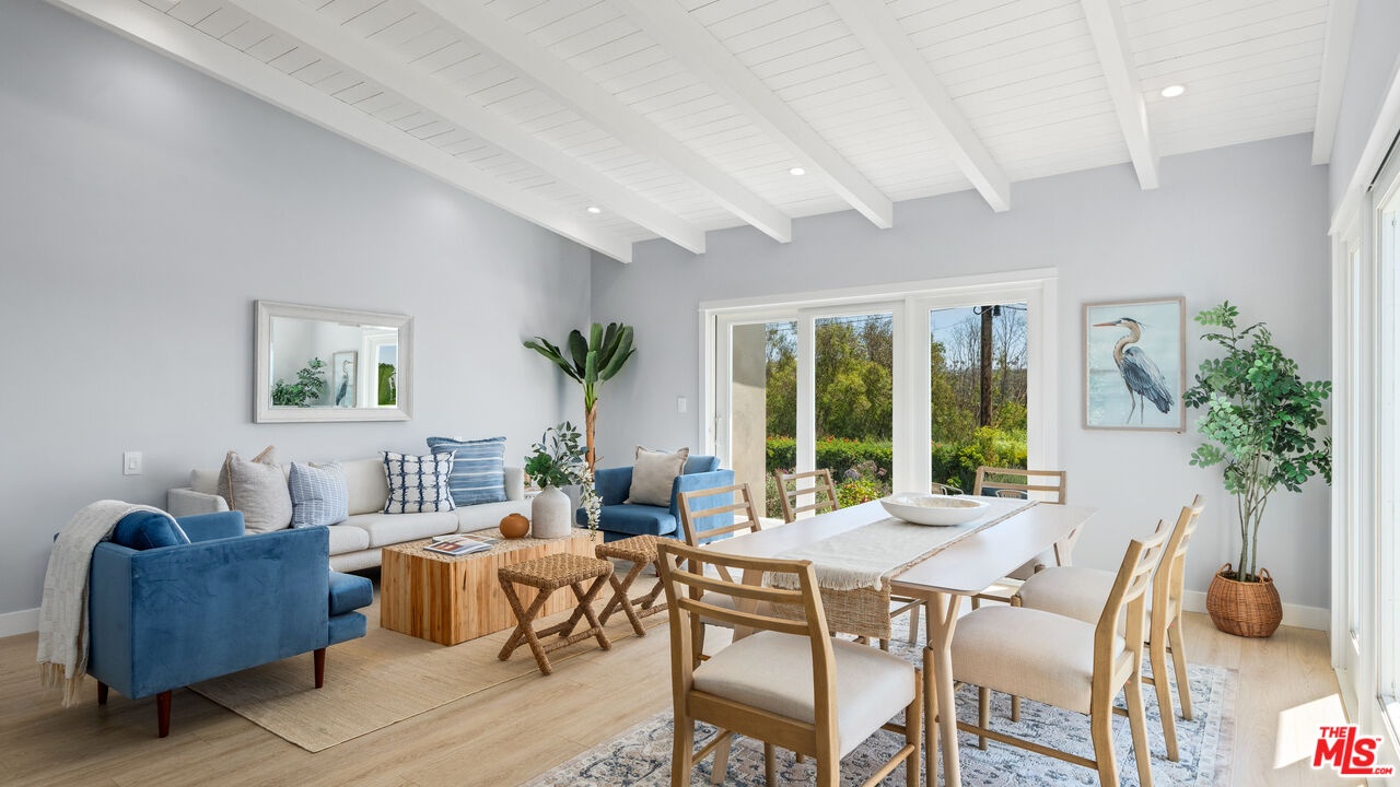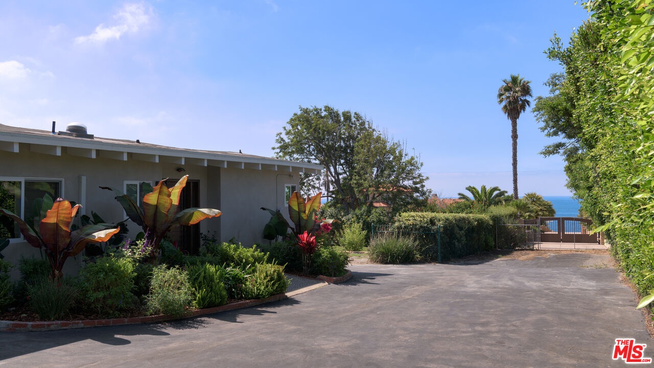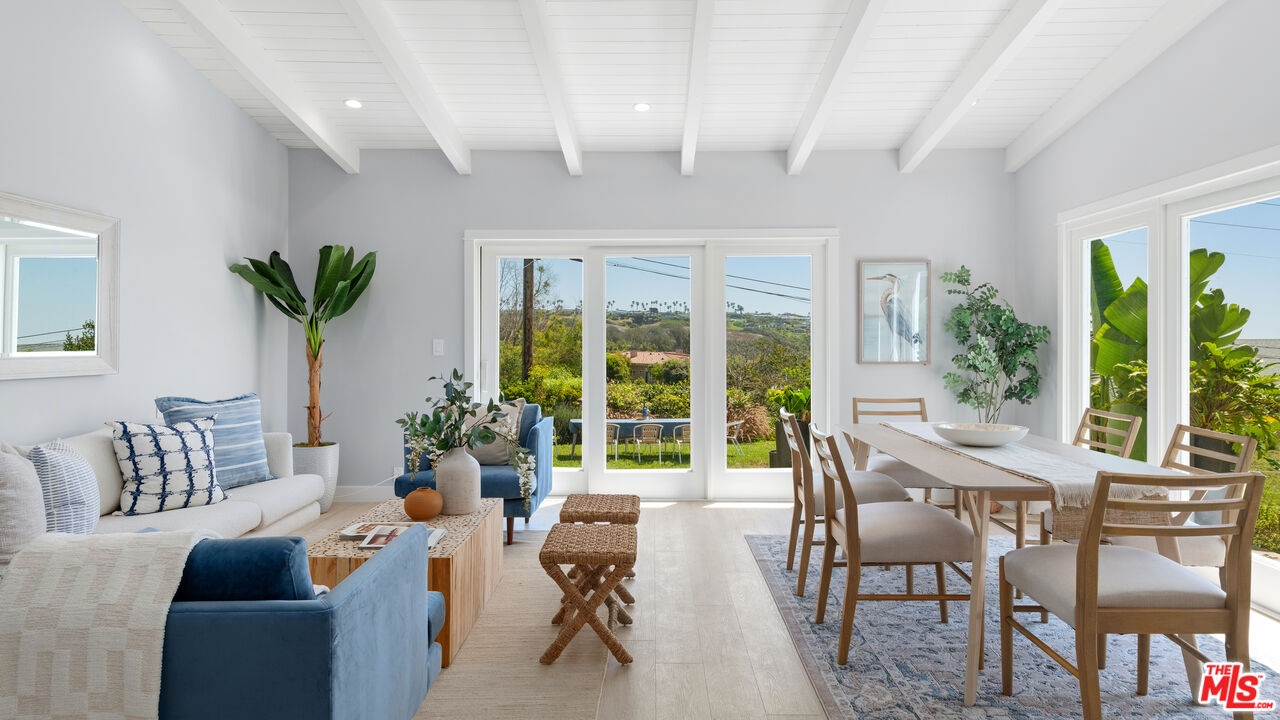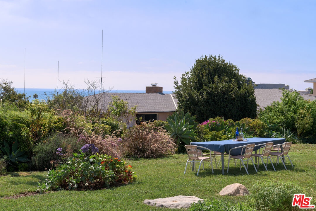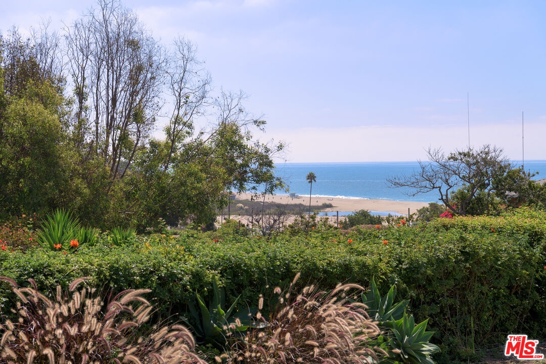Nestled in a prestigious community in western Malibu with close proximity to the high school, this luxury residence invites you in with its meticulously landscaped and gated yard on approximately 0.8 acres. Enter into a stunning foyer, where wood-beamed ceilings and rich vinyl floors set a warm and welcoming tone. Bathed in natural light, the home offers an ideal blend of classic charm and modern convenience.The living room, adorned with wood-beamed ceilings and sleek vinyl floors, features sliding glass doors that open to the expansive backyard, making it a perfect space for indoor-outdoor living. Just off the living room, the kitchen is a culinary dream, featuring quartzite countertops, a large stone island with a hood fan above a five-burner range, and top-of-the-line Viking and Bosch appliances. The kitchen offers breathtaking ocean and Point Dume views, creating a serene backdrop for cooking and entertaining.The primary suite offers a peaceful retreat with ocean views, a cozy reading nook, and a walk-in closet. Its high, wood-beamed ceilings and bay window enhance the room's airy, tranquil atmosphere. Outside, the sprawling backyard offers lush grass lawns and views of both the ocean and surrounding mountains. With ample parking, this home combines luxury, comfort, and natural beauty in one exquisite package.