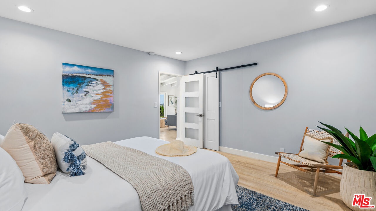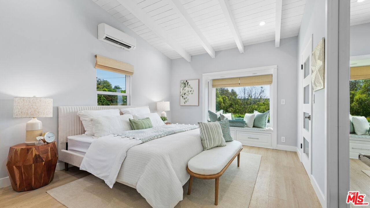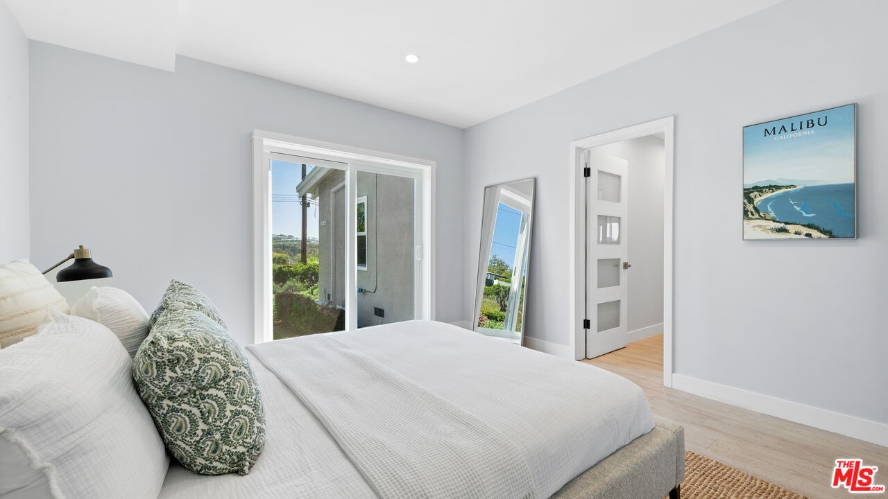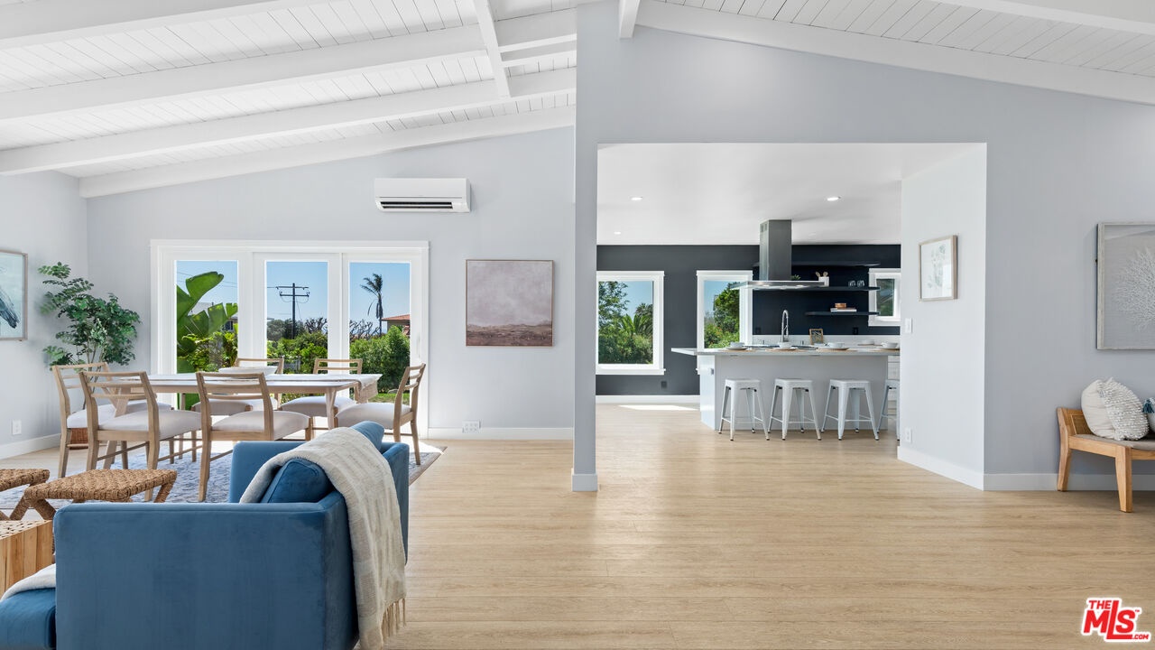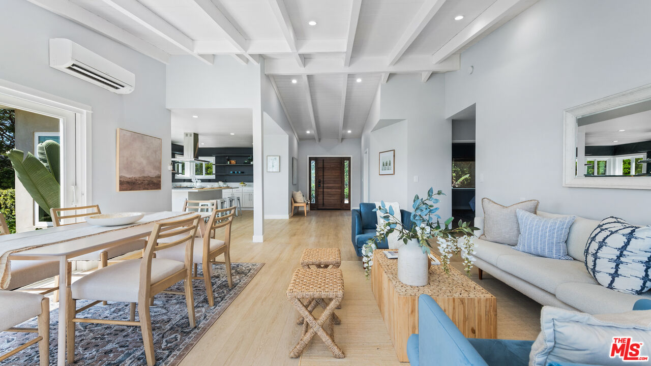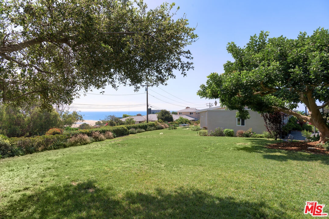 Nestled in a prestigious community in western Malibu with close proximity to the high school, this luxury residence invites you in with its meticulously landscaped and gated yard on approximately 0.8 acres. Enter into a stunning foyer, where wood-beamed ceilings and rich vinyl floors set a warm and welcoming tone. Bathed in natural light, the home offers an ideal blend of classic charm and modern convenience.The living room, adorned with wood-beamed ceilings and sleek vinyl floors, features sliding glass doors that open to the expansive backyard, making it a perfect space for indoor-outdoor living. Just off the living room, the kitchen is a culinary dream, featuring quartzite countertops, a large stone island with a hood fan above a five-burner range, and top-of-the-line Viking and Bosch appliances. The kitchen offers breathtaking ocean and Point Dume views, creating a serene backdrop for cooking and entertaining.The primary suite offers a peaceful retreat with ocean views, a cozy reading nook, and a walk-in closet. Its high, wood-beamed ceilings and bay window enhance the room's airy, tranquil atmosphere. Outside, the sprawling backyard offers lush grass lawns and views of both the ocean and surrounding mountains. With ample parking, this home combines luxury, comfort, and natural beauty in one exquisite package.