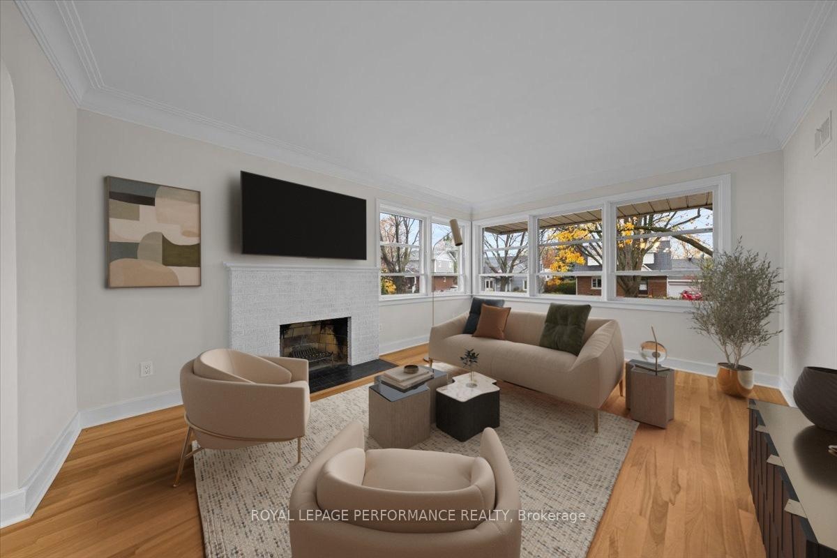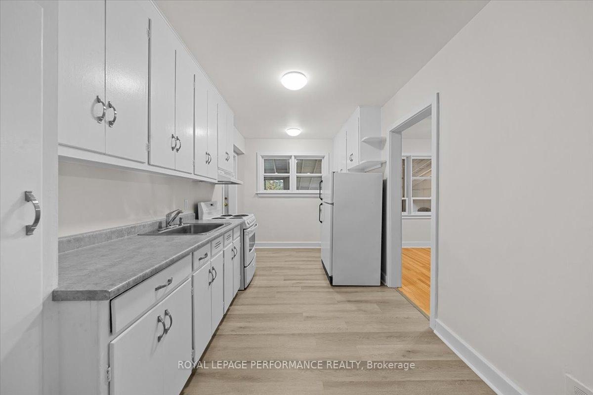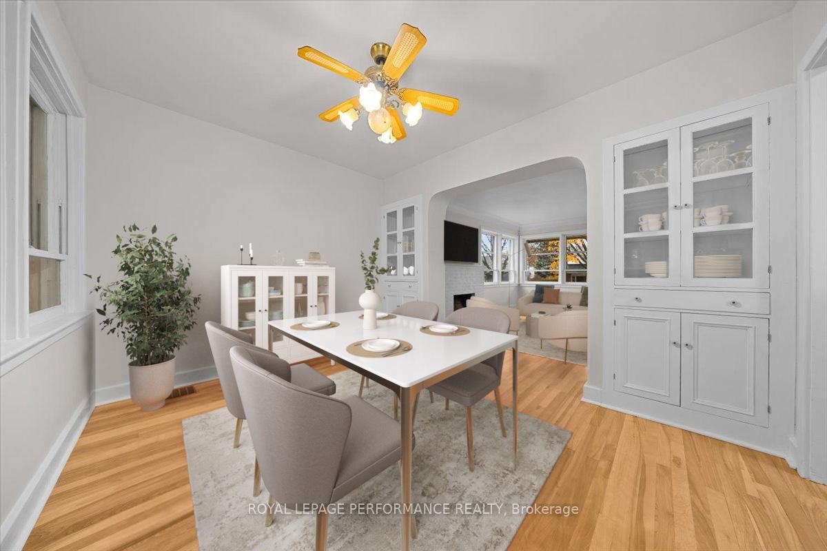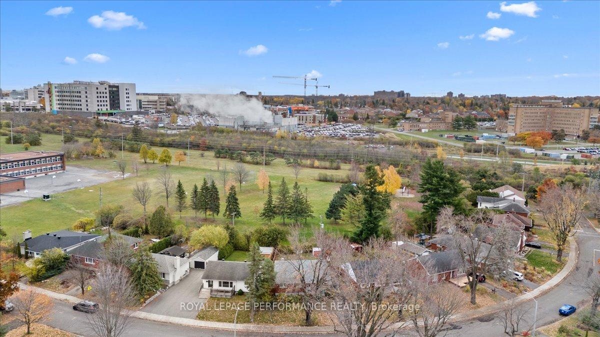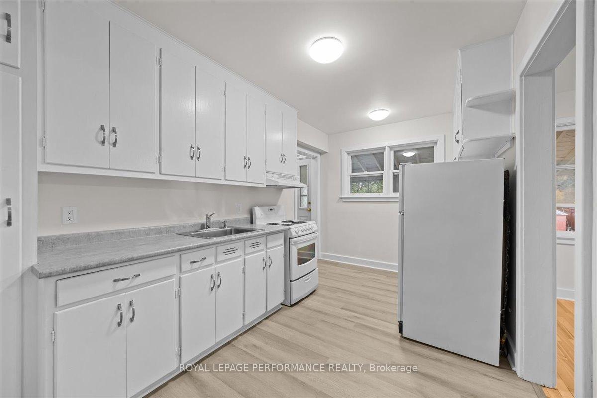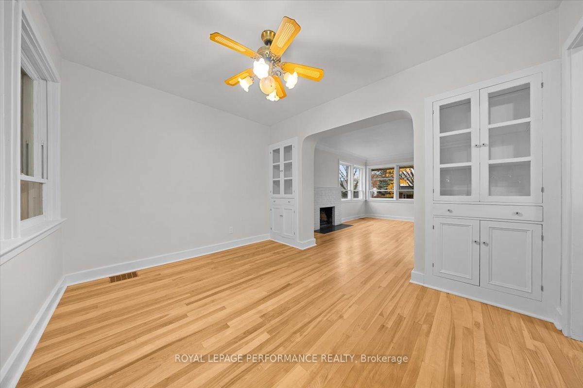 Bright 3-bedroom bungalow in a sought-after, family-friendly neighbourhood in the heart of Riverview Park. Cozy living room is complimented with a wood-burning fireplace plus corner windows allowing natural light to come through. The eat-in kitchen offers a new countertop, sink, and vinyl flooring. Separate dining room off the kitchen with built-in glassed shelves. Original hardwood floors throughout were cleaned, sanded and refinished. Recent repairs/maintenance include: painting throughout (walls, ceilings, doors and cupboard), kitchen ceiling re-drywalled and new lighting fixtures installed, new cabinet and vinyl flooring in bathroom, replaced switches and outlets, installed GFI outlets near sinks. Basement was cleaned up and is ready for potential for a secondary dwelling or in-law suite or large recreation room (wallboards, framing and flooring removed; dividing walls in centre of basement and laundry area removed; stairway carpet removed, steps and stairwell repaired and painted; new vinyl flooring and cabinet installed in bathroom). Enjoy the private setting backing onto Riverview Park from the covered porch and beautiful fenced backyard. This home is ideal for families or investors alike! Convenient walking path to Ottawa General Hospital, CHEO, NDMC and Oak Park Seniors Residence. Situated just minutes from the Trainyards Shopping District, transit routes, parks, schools, public transit and downtown.