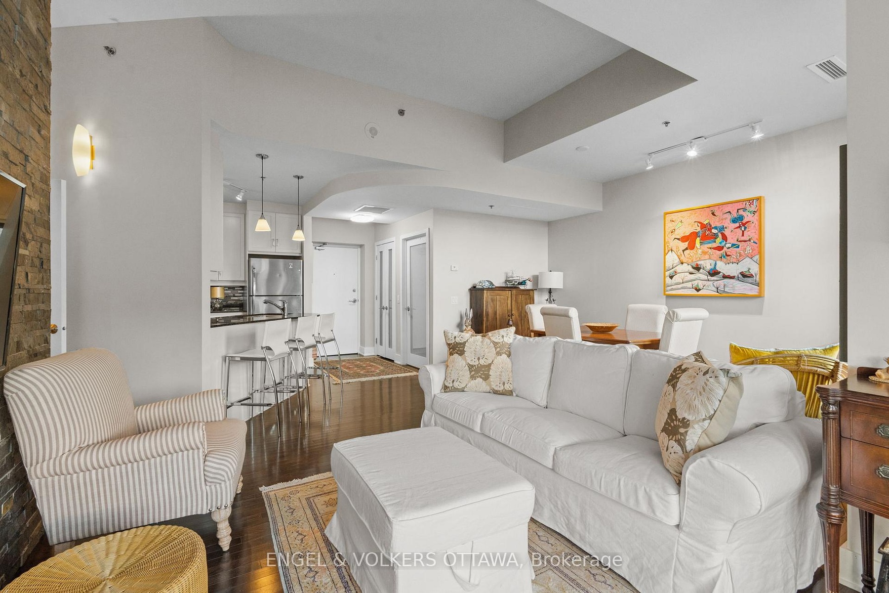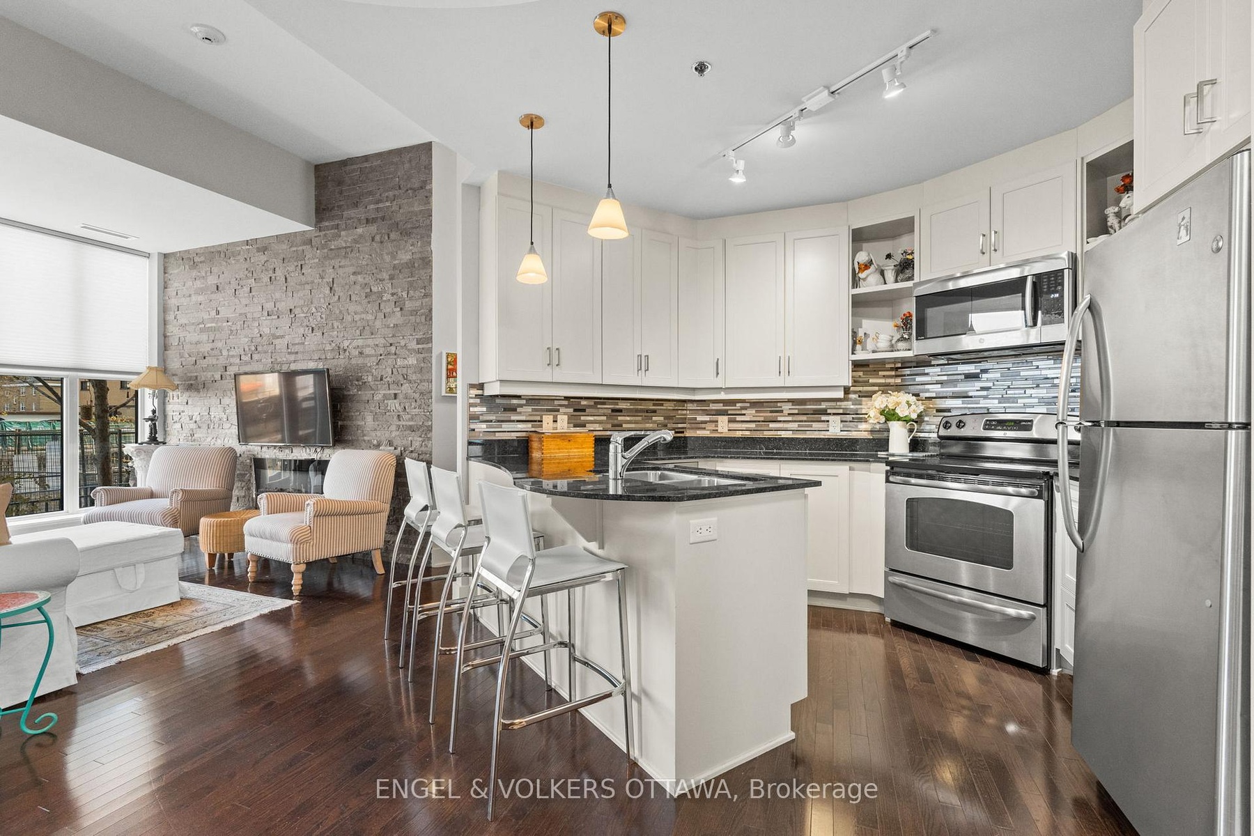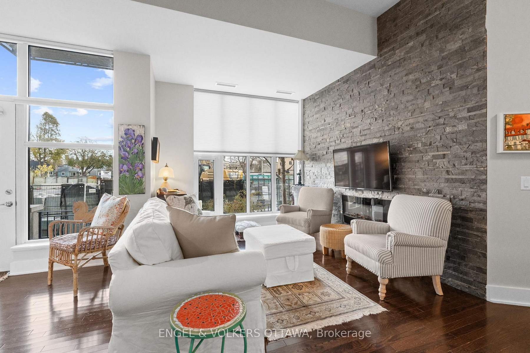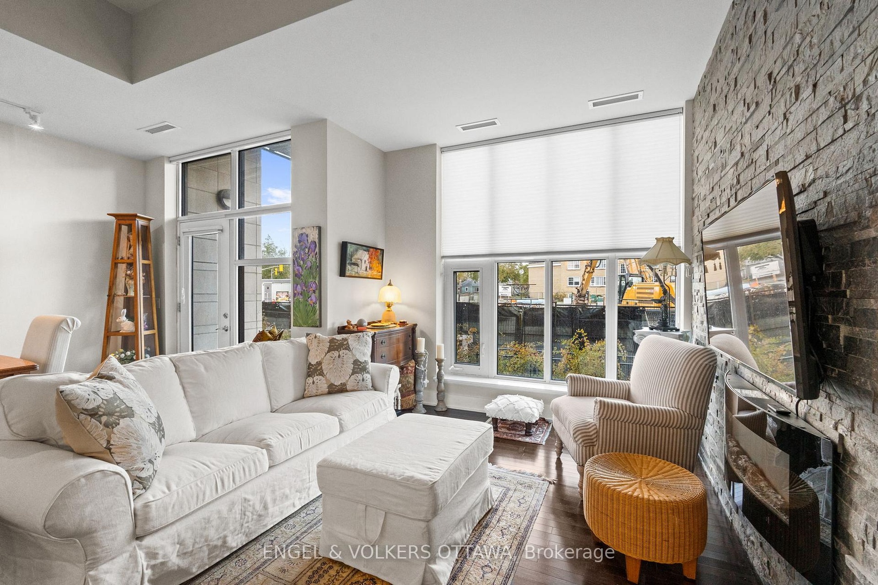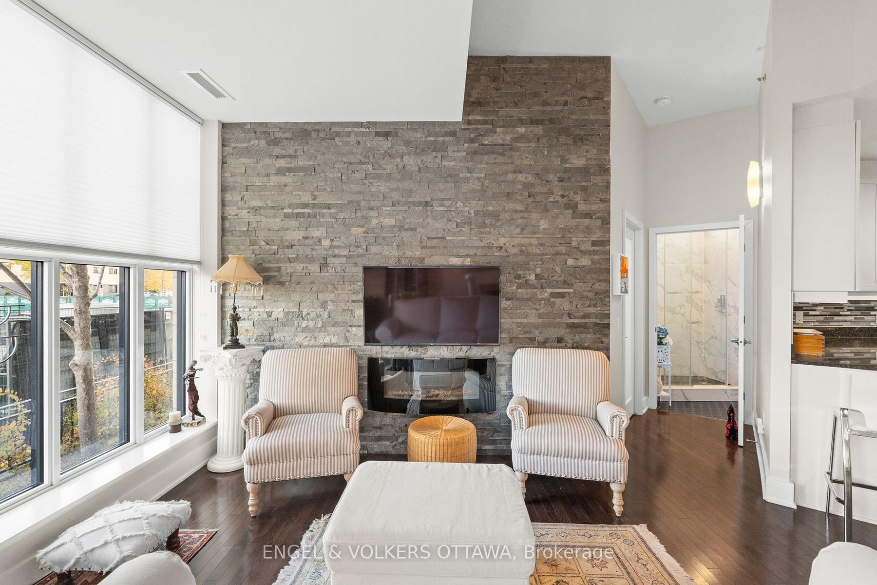 Welcome to The Continental by Charlesfort, a highly sought-after building in one of Ottawa's premier locations along the river and steps to transit, pathways, cafés, and Westboro amenities. This spacious one-bedroom, one-bath condo offers approximately 800 sq. ft. of stylish living space, highlighted by soaring ceilings and floor-to-ceiling windows that fill the suite with natural light. The open-concept design features hardwood flooring, a striking stone feature wall with electric fireplace, and a beautifully updated kitchen with granite countertops, newer stainless steel appliances, and excellent storage. Recently refreshed with new paint, this home feels elevated and move-in ready. The generously sized bedroom offers ample closet space, and the renovated bathroom adds a spa-like touch. A rare bonus- a private ground-level terrace, providing your own outdoor space for morning coffee or evening relaxation. Additional conveniences include in-unit laundry, owned underground parking equipped with an EV charger, and an owned storage locker. Residents enjoy exceptional amenities such as an exercise room, a rooftop patio with stunning Ottawa River views, and a stylish games/party room. Offering design, comfort, lifestyle, and an unbeatable location!