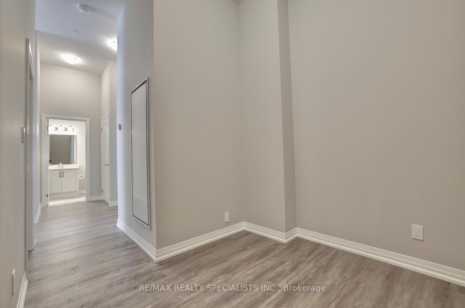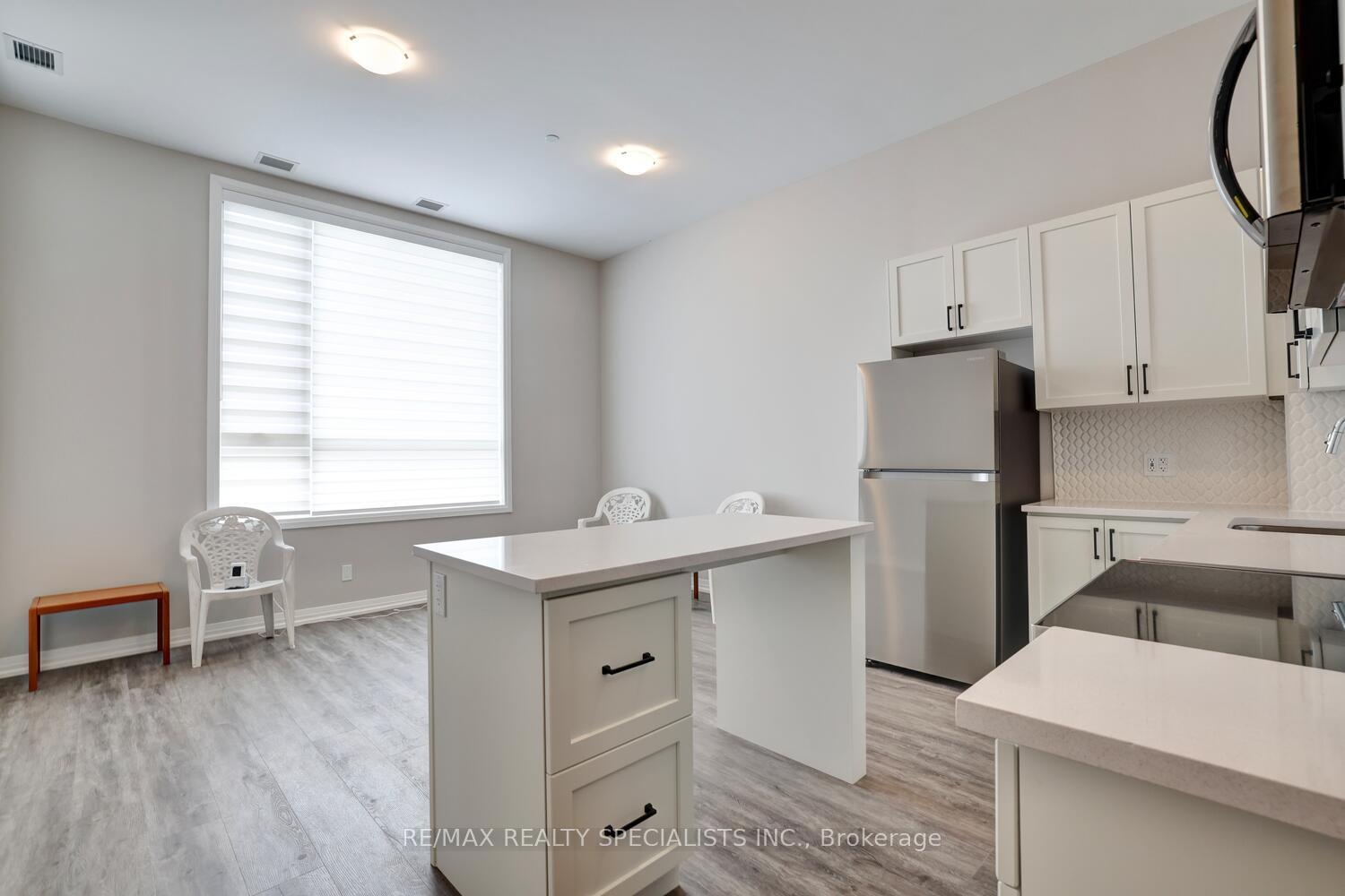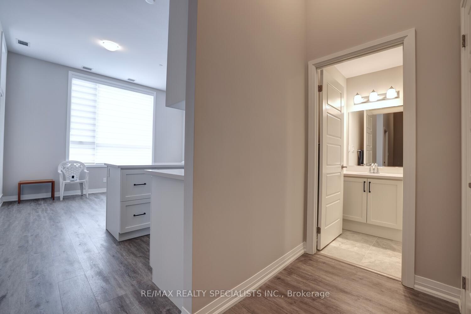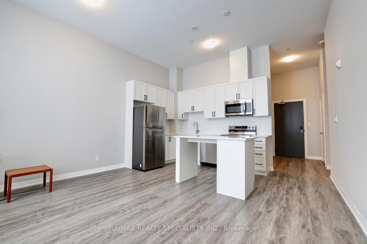 Gorgeous ground floor Mattamy built apartment with thousands spent on upgrades and located in the sought after community of "Preserve". Premium location with walk-out to covered porch area overlooking "Charles Fay Pond" and an outside lounge area. Modern open concept design with 11 foot ceilings throughout. Spacious living/dining room area with vinyl plank floors. Modern kitchen with stainless steel appliances, centre island with breakfast area, quartz counter tops, ceramic backsplash, under mount sink, soft closing cabinetry and drawers. Convenient separate den area with open concept storage/closet space. Primary bedroom retreat with vinyl floors and large double closet. Stunning 3 piece main bathroom with walk-in glass shower. Lots of natural light with towering windows and remote blinds. Apartment comes with an extra large parking spot and locker. Fantastic building facilities with security concierge, keyless entry, high speed internet, roof top party room and fitness area. Just minutes away to shopping, trails, hospital, transit, and highways.