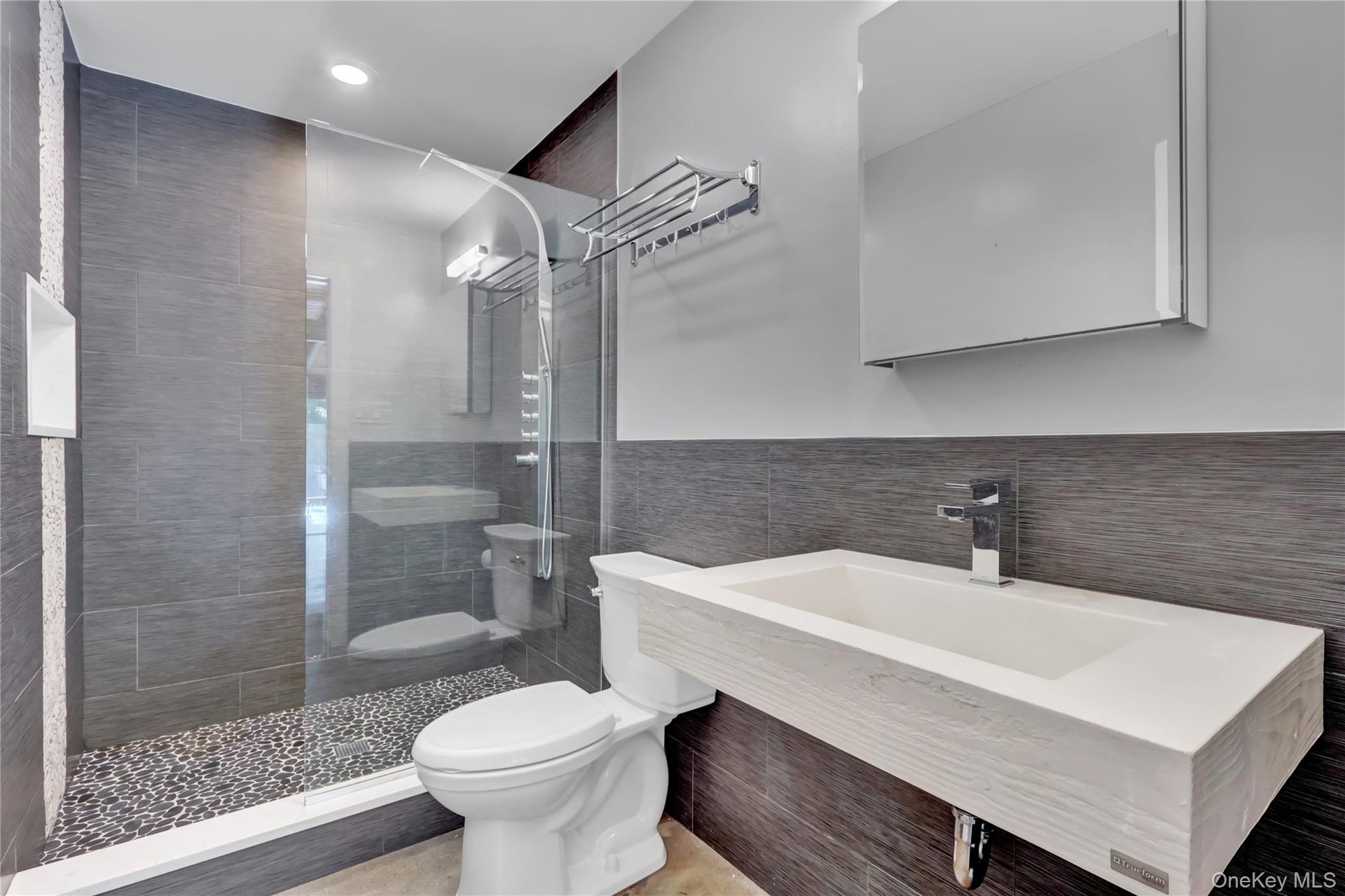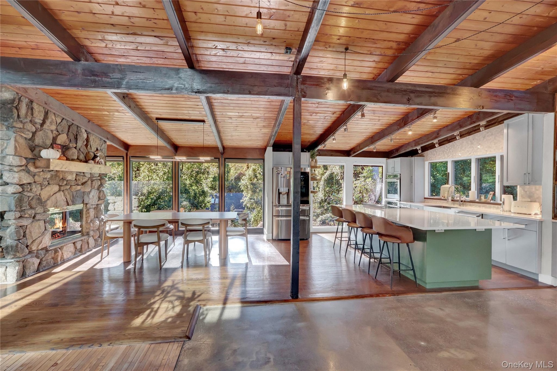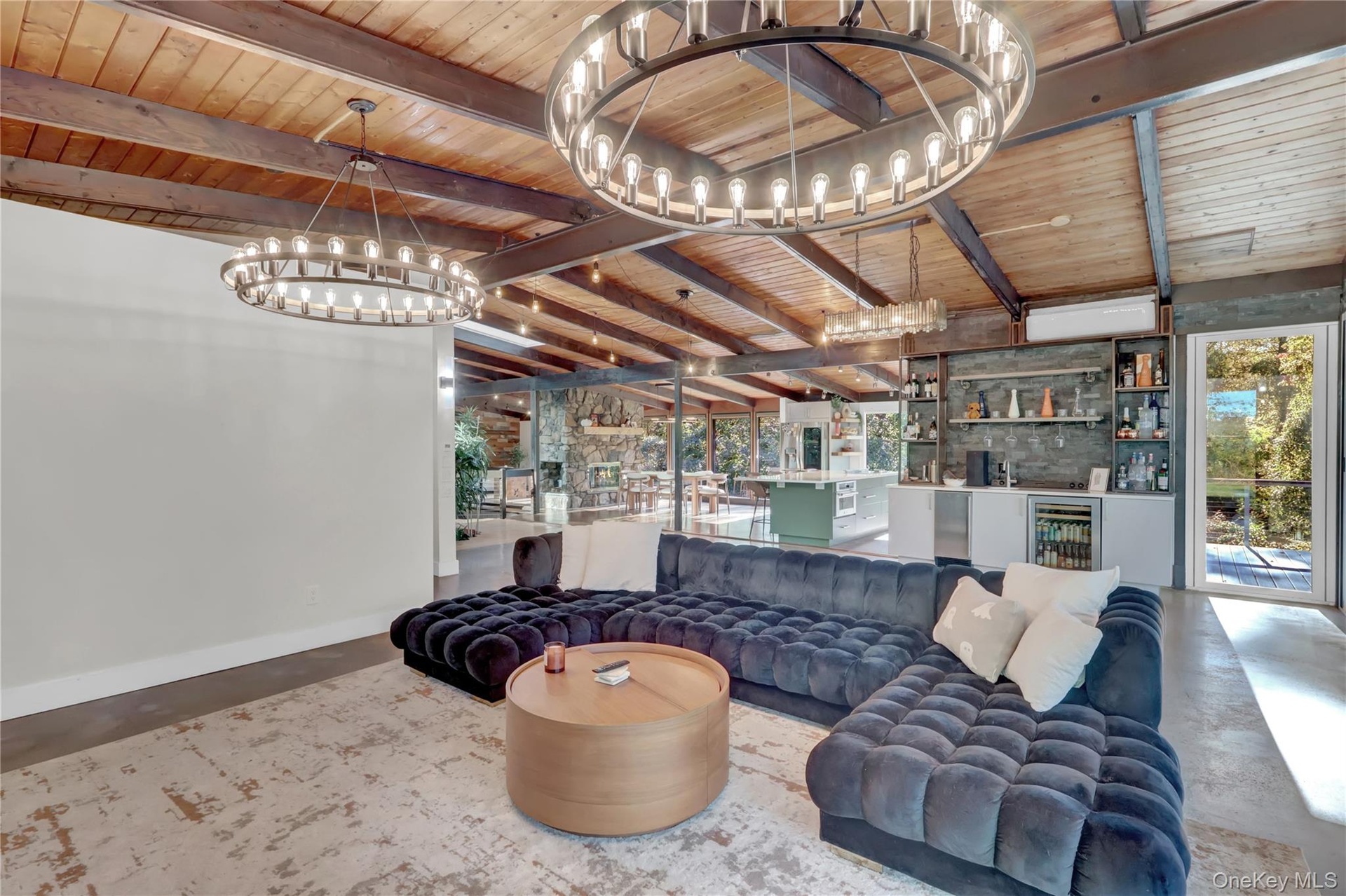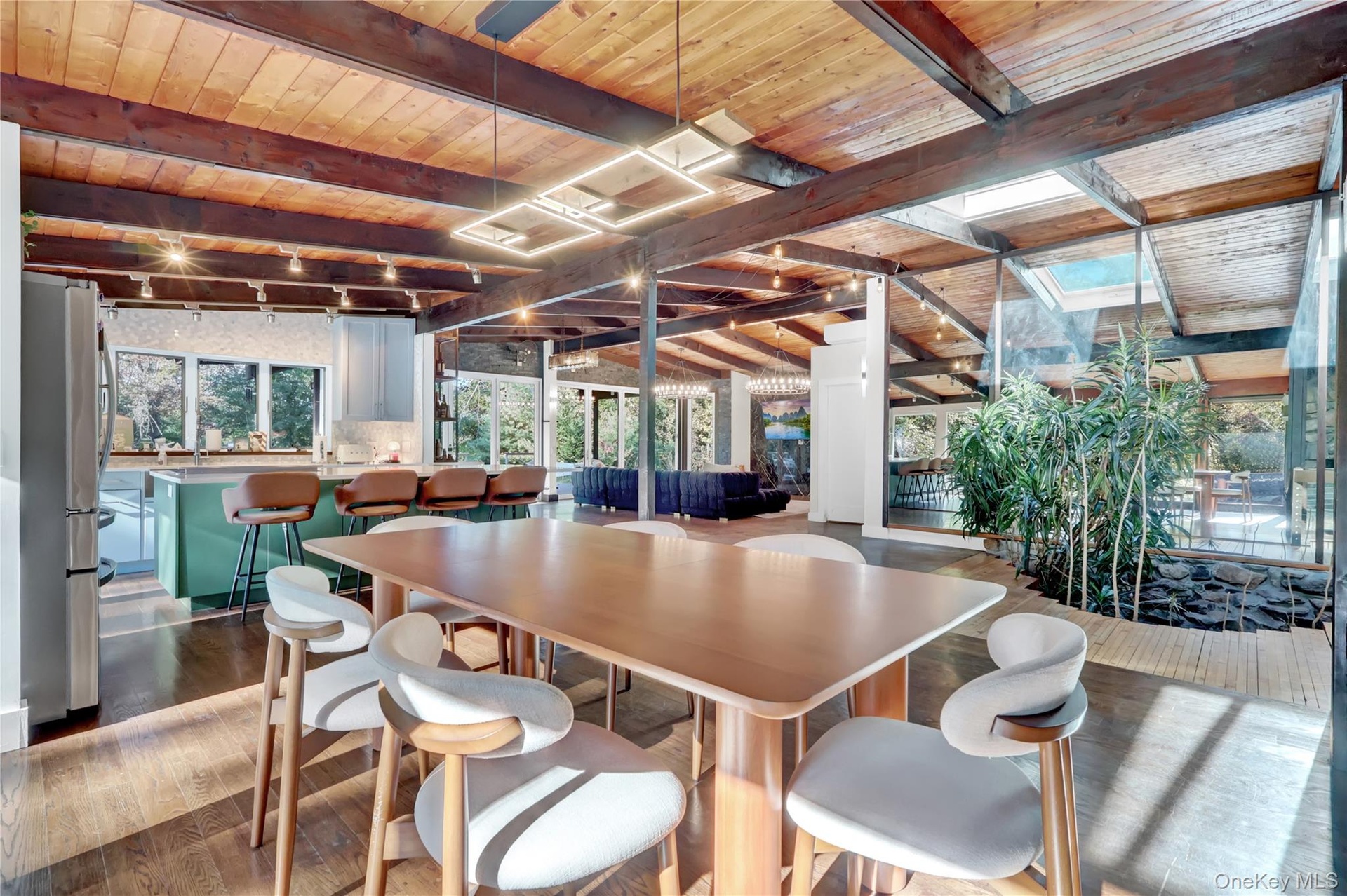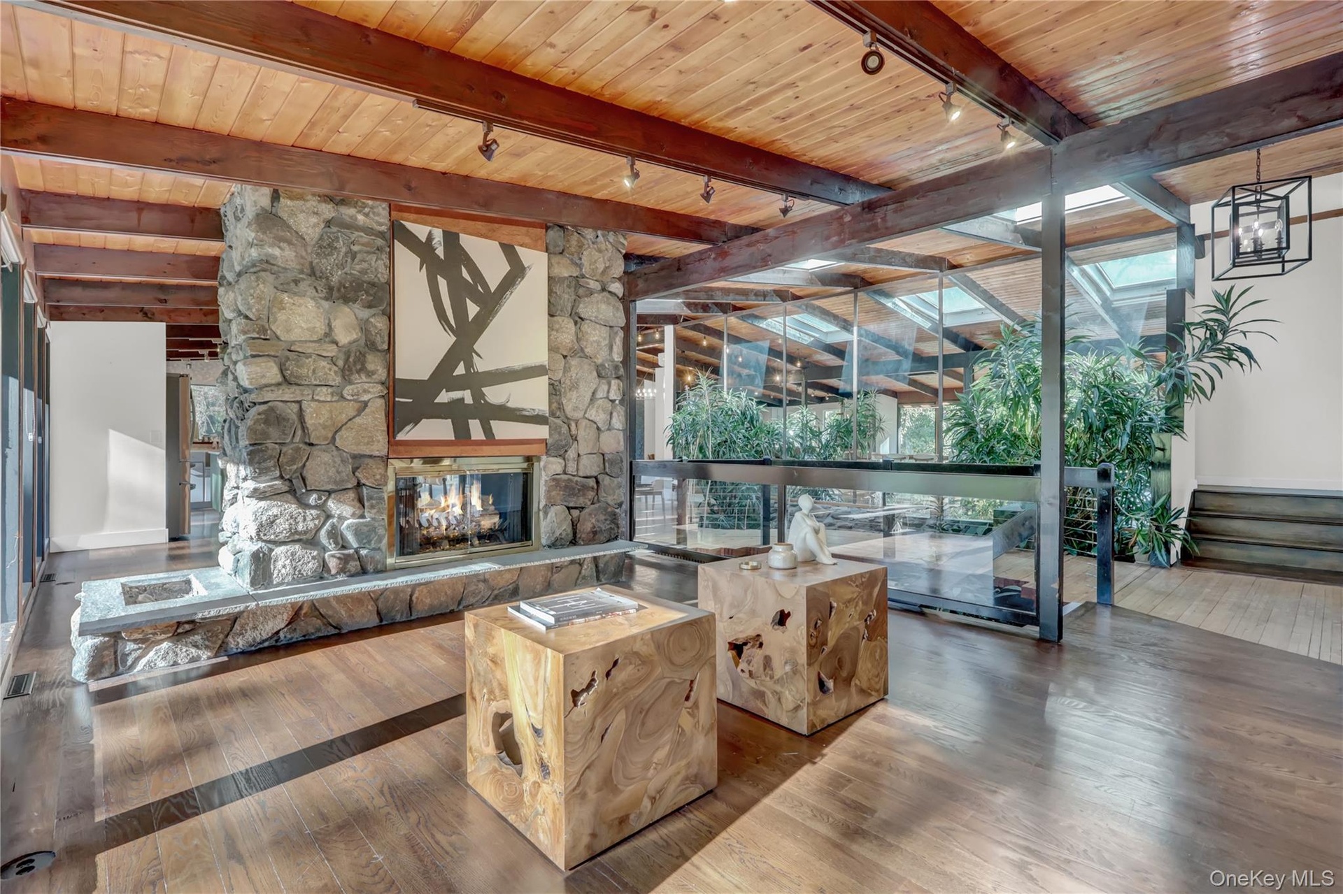 Perched atop a scenic hill in one of Smithtown’s most prestigious enclaves, this architecturally distinctive ranch-style home offers an unmatched combination of total privacy, eco-conscious design, and serene natural beauty. Located within the award-winning Smithtown School District and surrounded by lush woodlands near the Nissequogue River, this exceptional home is a true retreat for those who value tranquility, style, and effortless indoor-outdoor living. From the moment you arrive, the home’s striking exterior, expansive setting, and custom design features signal that this is no ordinary residence. Inside, the open-concept layout is both inviting and impressive, with a peaceful, zen vibe and a bridge over a one-of-a-kind custom koi pond. Soaring vaulted ceilings and radiant heated floors run through the main living areas. Walls of oversized sliding glass doors flood the interior with natural light and seamlessly connect the indoors to a sprawling Trex deck—perfect for entertaining on any scale. Cleverly hidden solar panels provide electricity at almost no monthly cost. At the heart of the home lies a beautifully appointed, modern kitchen featuring quartz countertops, an oversized center island, and sleek custom cabinetry. The space flows effortlessly into the expansive great room, creating a bright and airy living experience that feels both refined and relaxed. A two-sided fireplace enhances both the living and dining rooms. Step outside and discover a true entertainer’s dream: a brand-new resort-style pool with a shallow sun bed lounge area, custom stone fire pit, and a vast deck ideal for hosting gatherings or simply enjoying peaceful mornings. A thoughtfully designed lower level includes a private guest suite with its own full bath and separate above-grade entrance—ideal for extended stays or multi-generational living. A fully equipped gym completes the lower level, with a ton of closets for storage. Propane generator. Unique in every sense, this residence is a rare find—a perfectly curated blend of modern comfort and natural serenity.