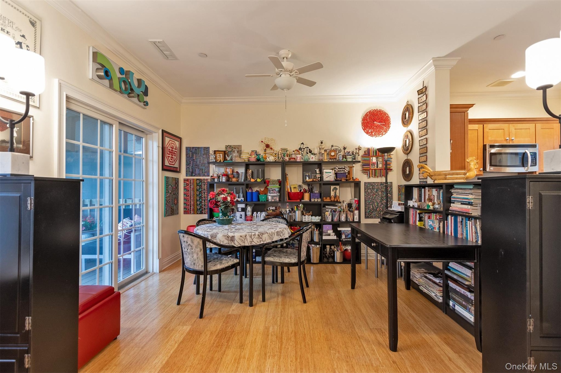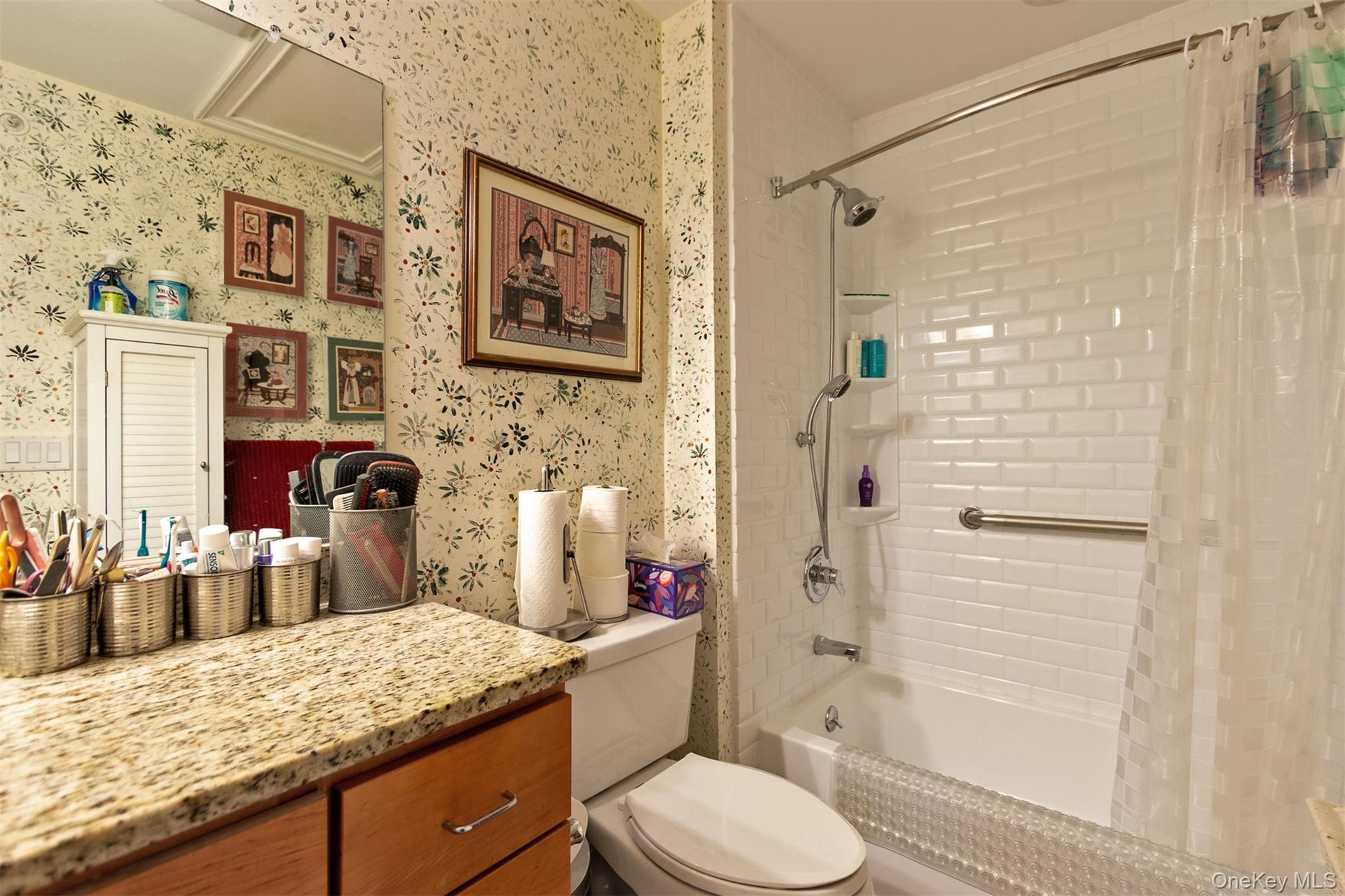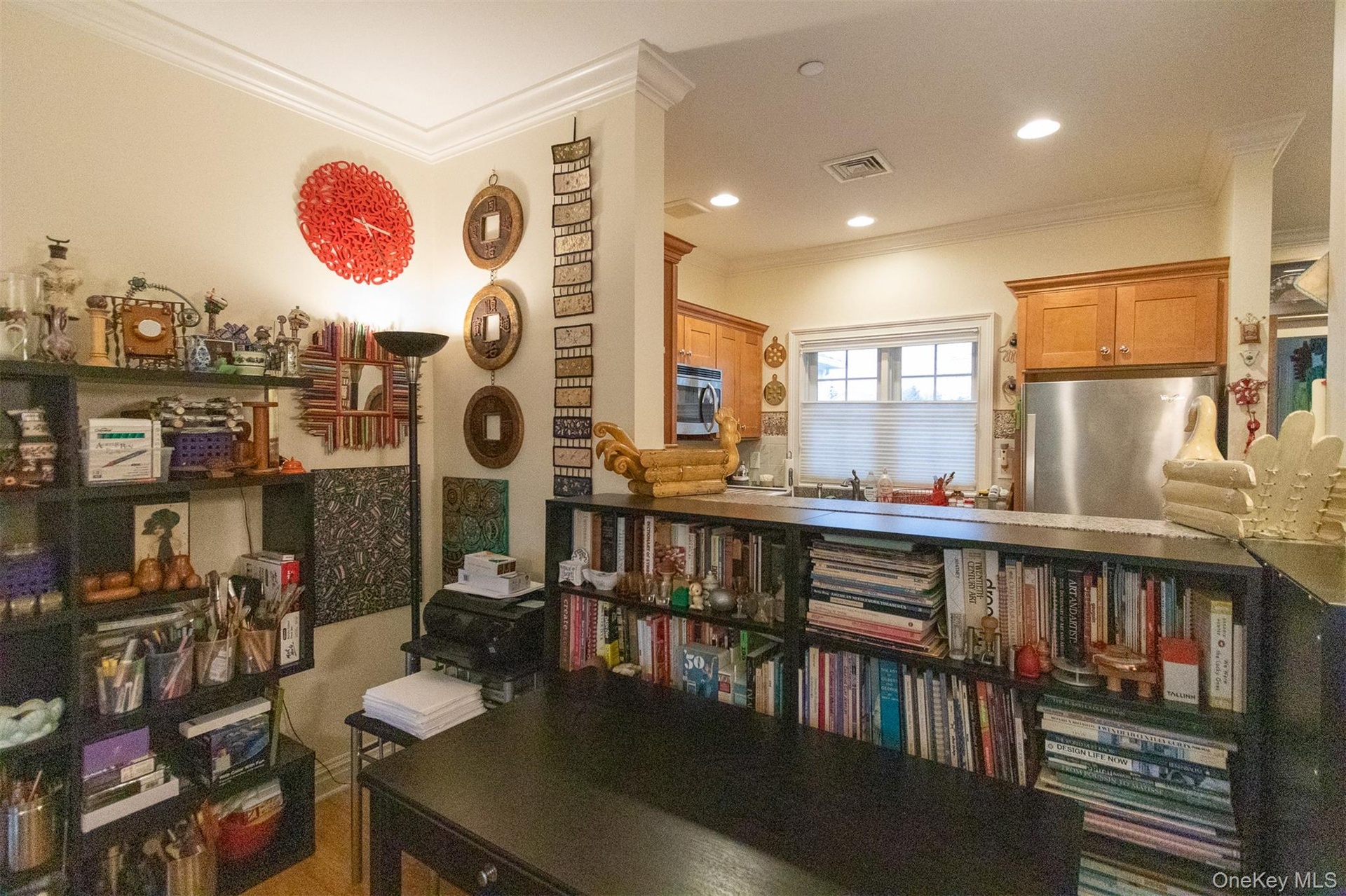 This one-bedroom home with a den and two full baths offers a thoughtfully updated interior. The kitchen features new granite countertops, a large rectangular sink, sleek, designer, cabinetry, and new stainless-steel appliances. A convenient pass-through opens to the living room for easy serving and conversation.