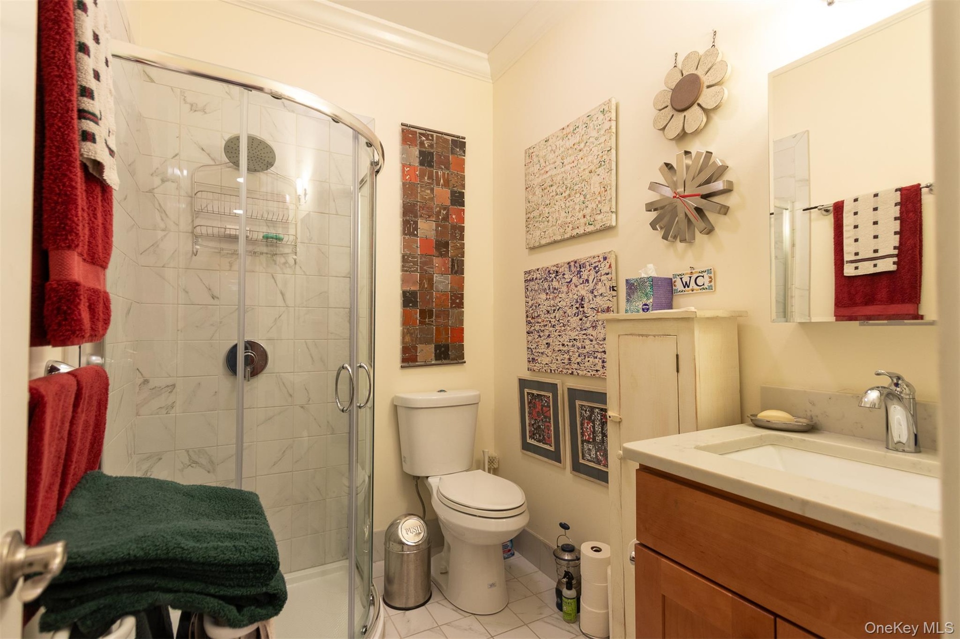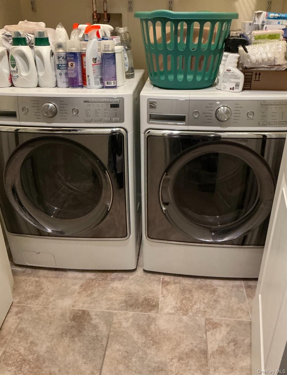 The first floor includes the kitchen, dining area, living room, coat closet, and a renovated full bath featuring a new rectangular sink, new vanity, new tile flooring, and a circular shower. A large-capacity washer and dryer are also located on this level. Hardwood floors throughout the first floor are in excellent condition.