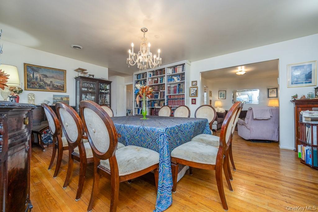 - Dining area with hardwood / wood-style flooring and a chandelier