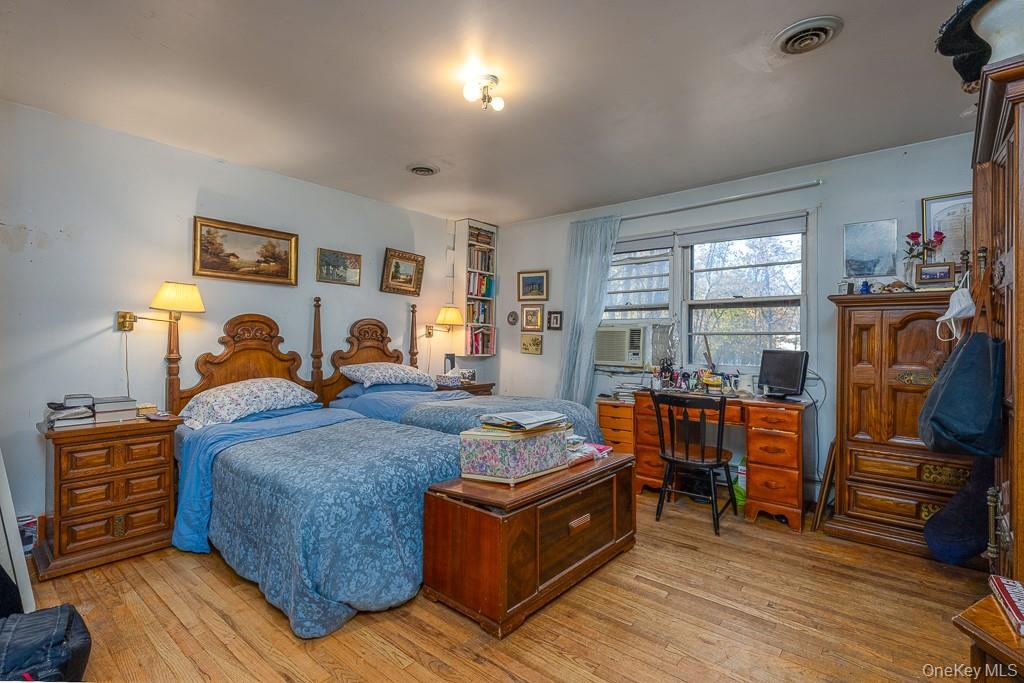 - Bedroom featuring light wood finished floors, an office area, and cooling unit