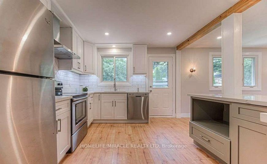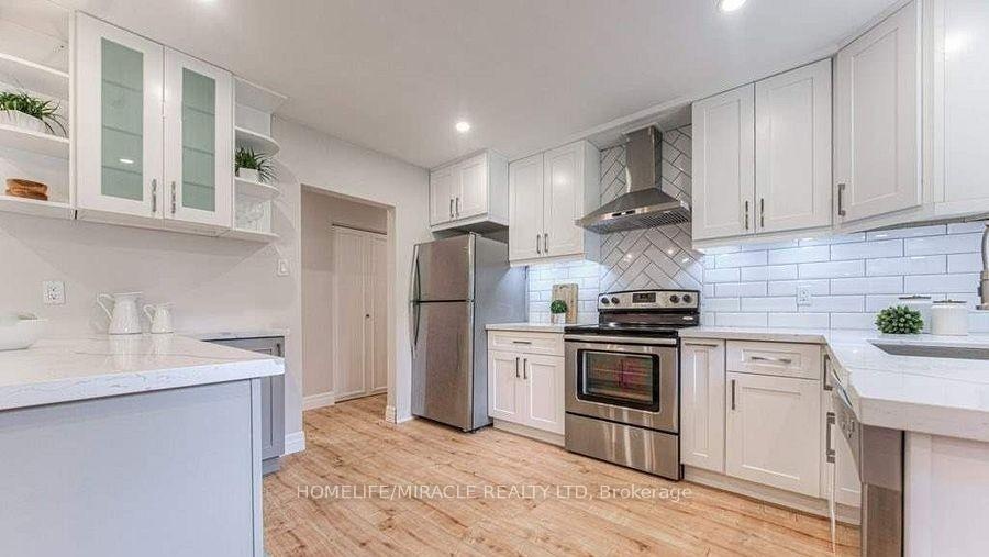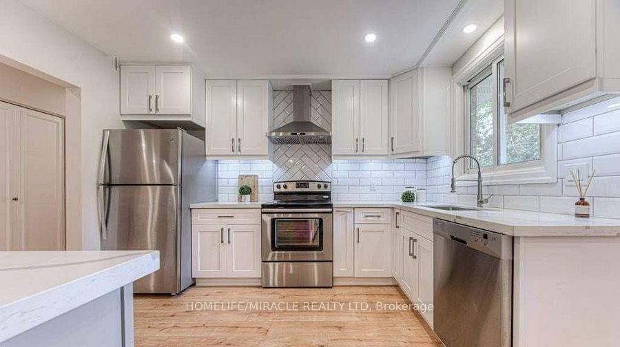 Raised Bungalow in Kitchener, Main and Upper floor (No Basement), Fully Renovated Home Features Spectacular Finishes And Upgrades, Including New Flooring Throughout, Fresh Paint Inside And Out And A Custom Railing. Bright And Airy Foyer Leading Up The Open Concept Living/Dining Rooms Offer Customized Millwork Overlooking Kitchen With Custom Solid Wood Cabinetry, Impressive Breakfast Bar, Quartz Countertops, Luxury Backsplash And Elegant Lighting Fixtures.