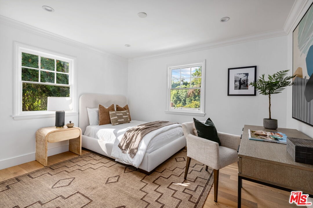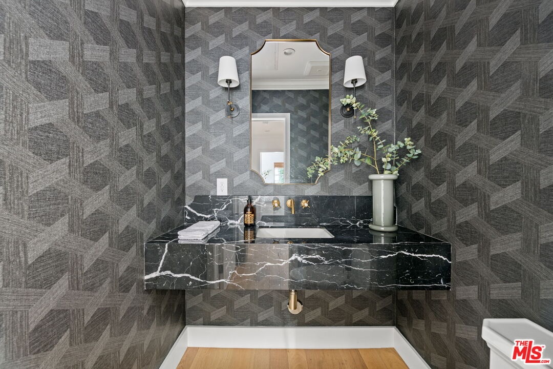 Here is a stunning, recently remodeled four-bedroom, four-bath Traditional located on a verdant, tree-lined street in the picturesque enclave known as Westwood Hills. Originally built in the 1930s, the renovation retains the rich, original architectural stylings of the past evident in the beautifully framed fireplaces, intricate dentil crown moldings and much more. Updated to today's luxury standards with its fine use of materials and finishes which include custom cabinetry, exquisite countertops, fabulous wallpaper, splendid tiling, tasteful light fixtures and warm wood floors throughout. This lovingly restored property welcomes those seeking a forever home. Outdoors, the front and backyards offer multiple terraces, covered and uncovered, all inviting spaces for al fresco entertainment and relaxation. Meticulously landscaped utilizing stone, decomposed granite and gravel framed by hedges, grassy yards and mature trees for privacy. This home is in the highly sought-after Warner Avenue School District and in close proximity to UCLA and Westwood Village. The location is truly central, providing easy access to the major freeways and all the amenities the area has to offer. This residence embodies a timeless elegance with modern conveniences and is ready to welcome you home. One downstairs bedroom does not have a closet within the room but does have one just outside it. Garage may not fit two cars.