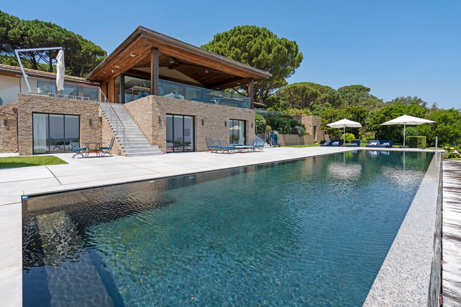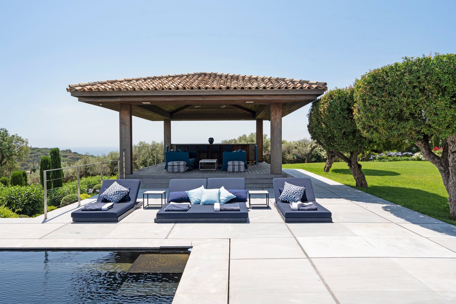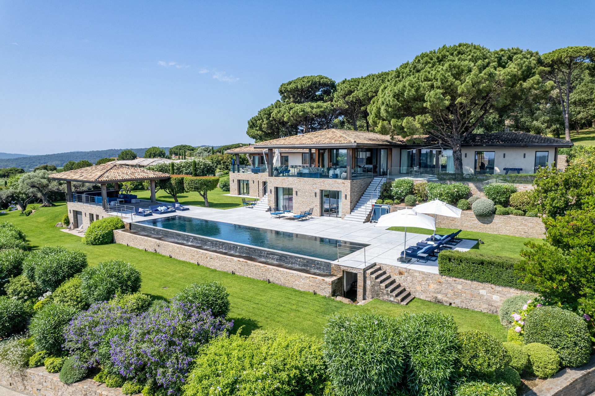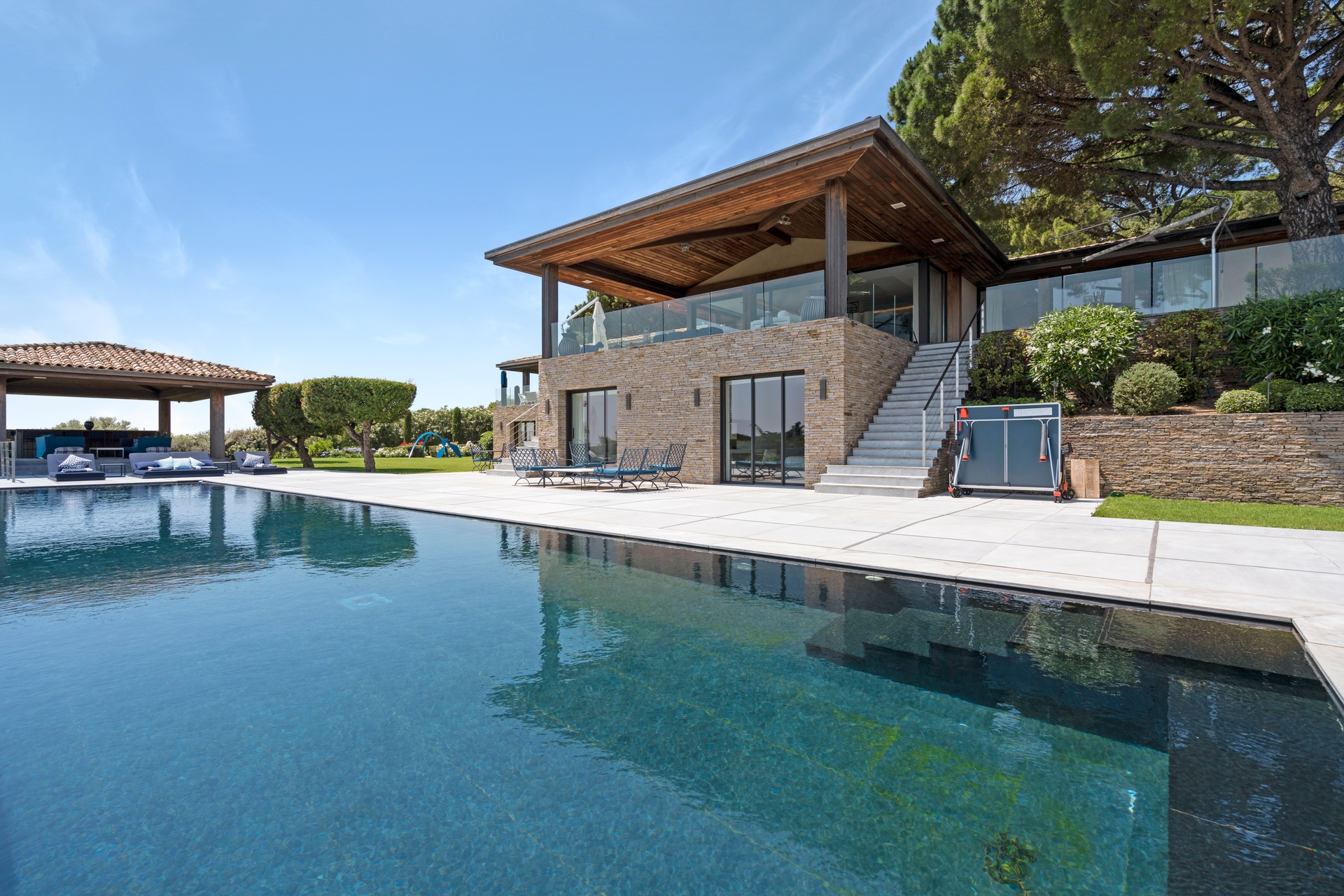 You can also relax in the sunshine by the heated swimming pool, surrounded by sunbathing areas and lounges. Your sunny lunches can take place there, in the pool house with kitchen, bar and lounge. Afternoons may take you to the mythical beaches of Pampelonne in Ramatuelle, but the large landscaped garden planted with umbrella pines and century-old olive trees may convince you to spend your days making the most of Villa Abysse and its unique setting. Young and old alike can enjoy themselves around the ping pong table, in the pool, at the table... Everything is designed to offer you a cocoon of well-being and pleasure.