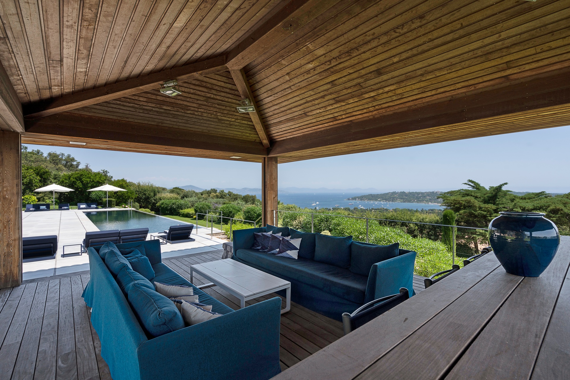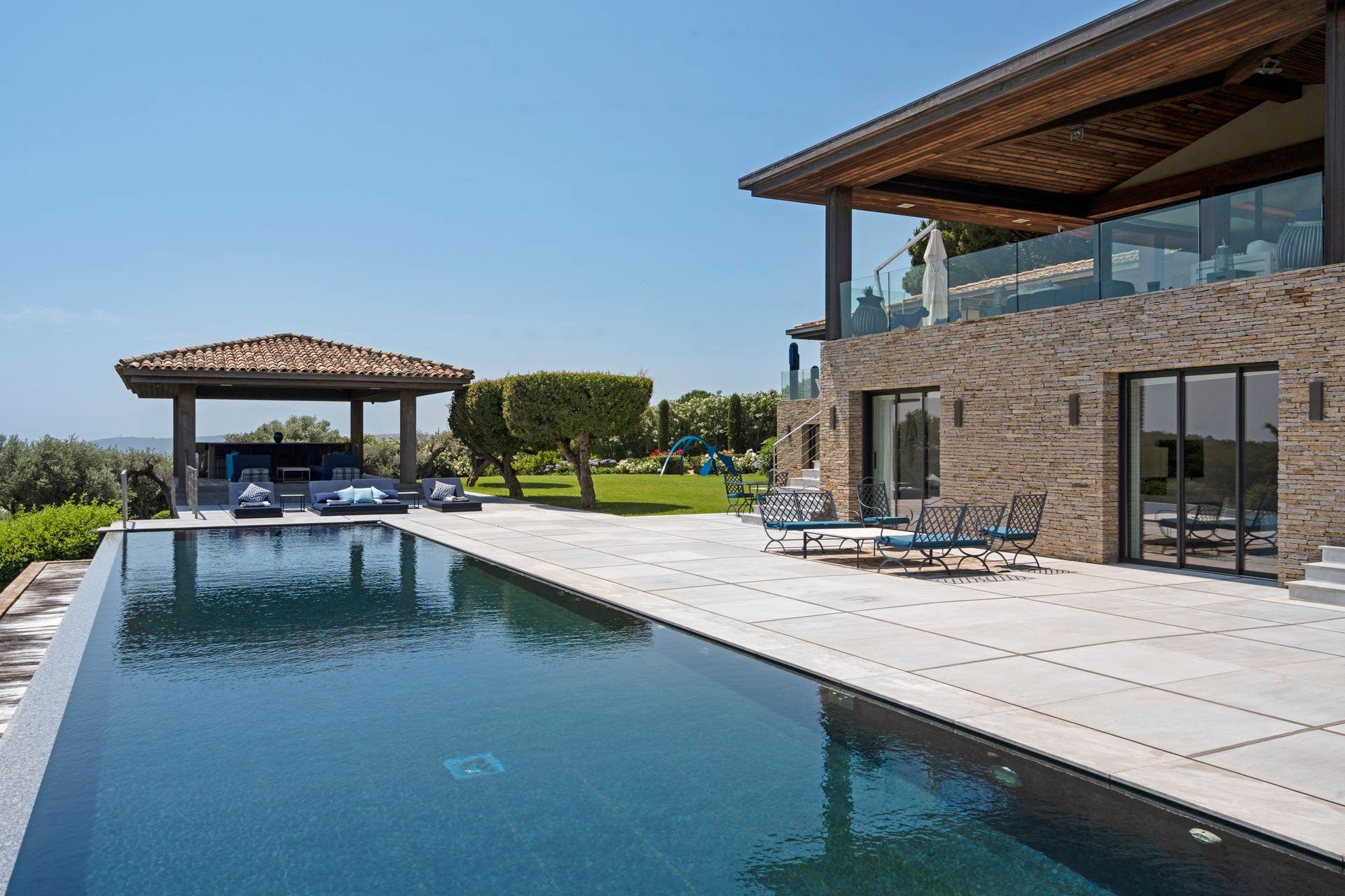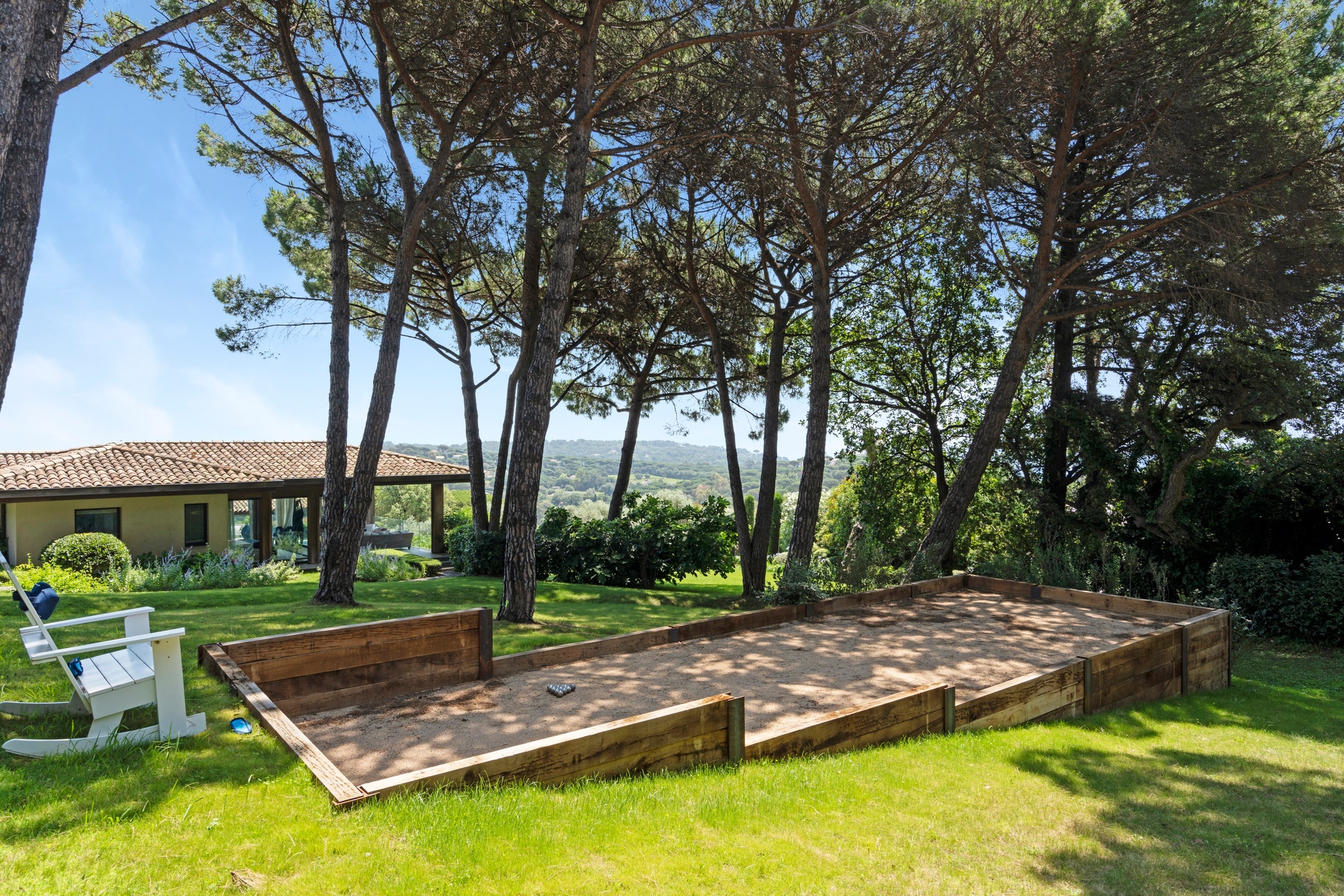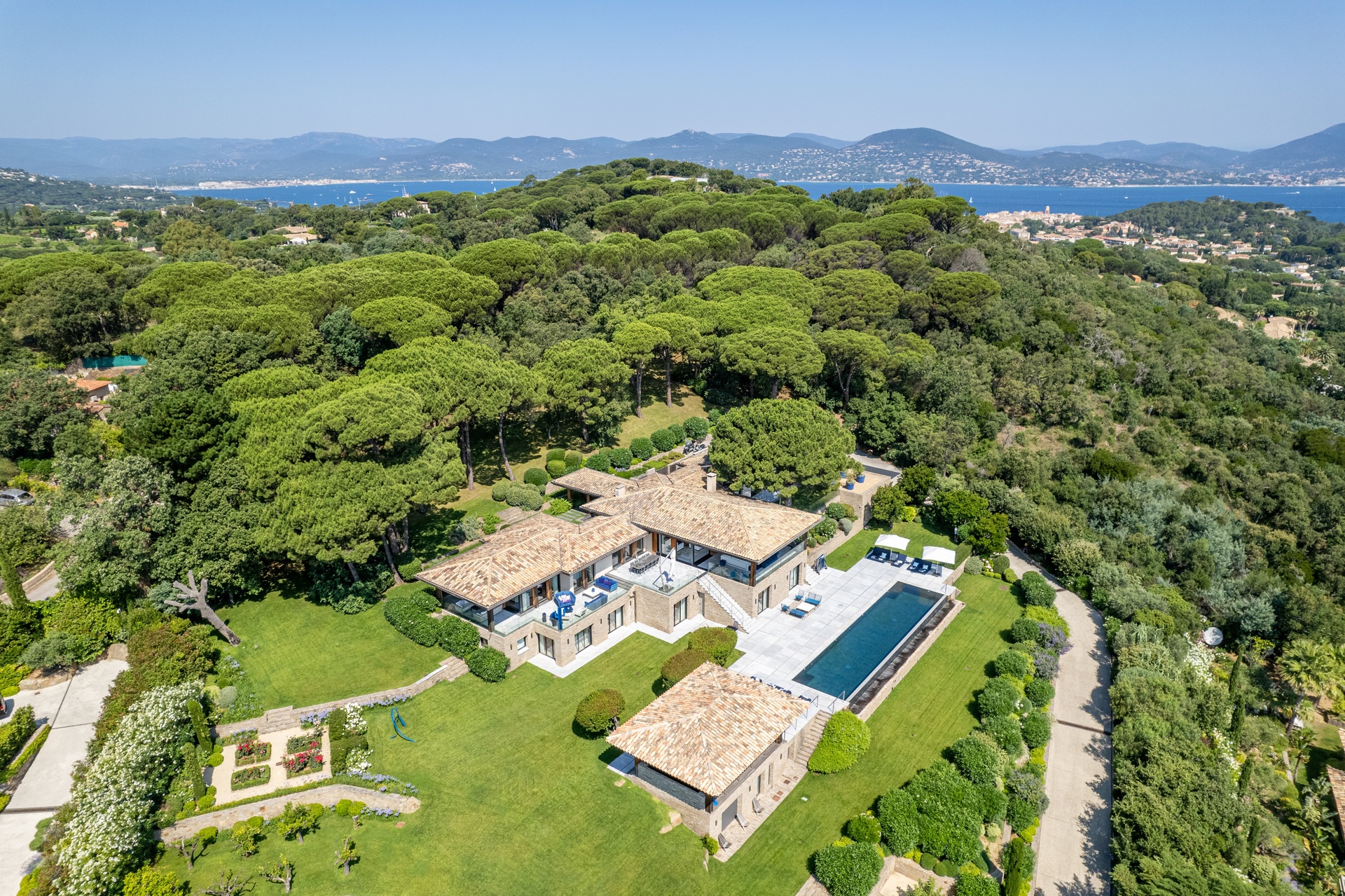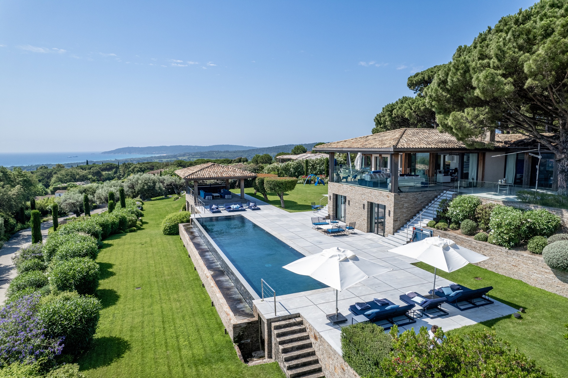 You can also relax in the sunshine by the heated swimming pool, surrounded by sunbathing areas and lounges. Your sunny lunches can take place there, in the pool house with kitchen, bar and lounge. Afternoons may take you to the mythical beaches of Pampelonne in Ramatuelle, but the large landscaped garden planted with umbrella pines and century-old olive trees may convince you to spend your days making the most of Villa Abysse and its unique setting. Young and old alike can enjoy themselves around the ping pong table, in the pool, at the table... Everything is designed to offer you a cocoon of well-being and pleasure.