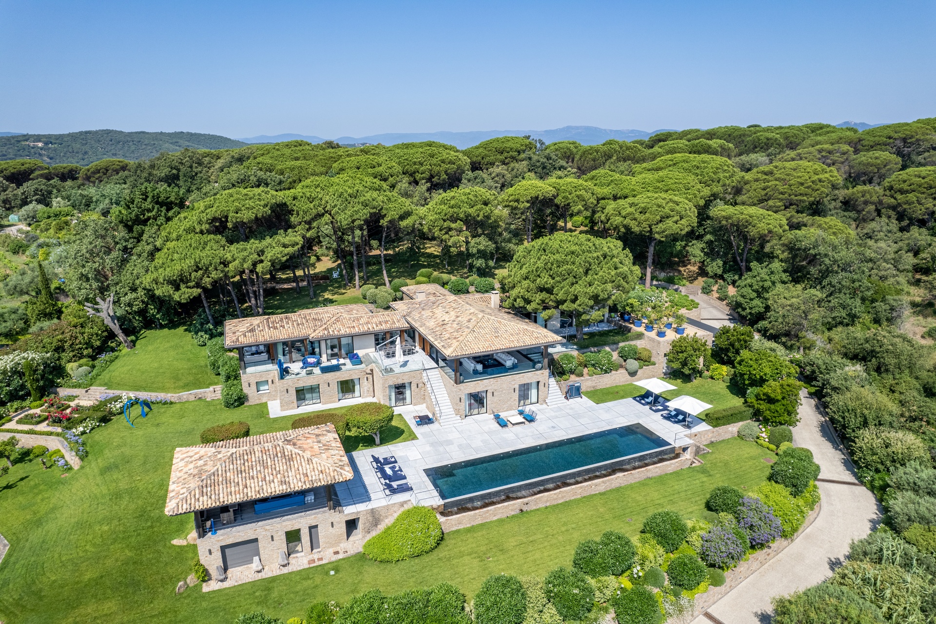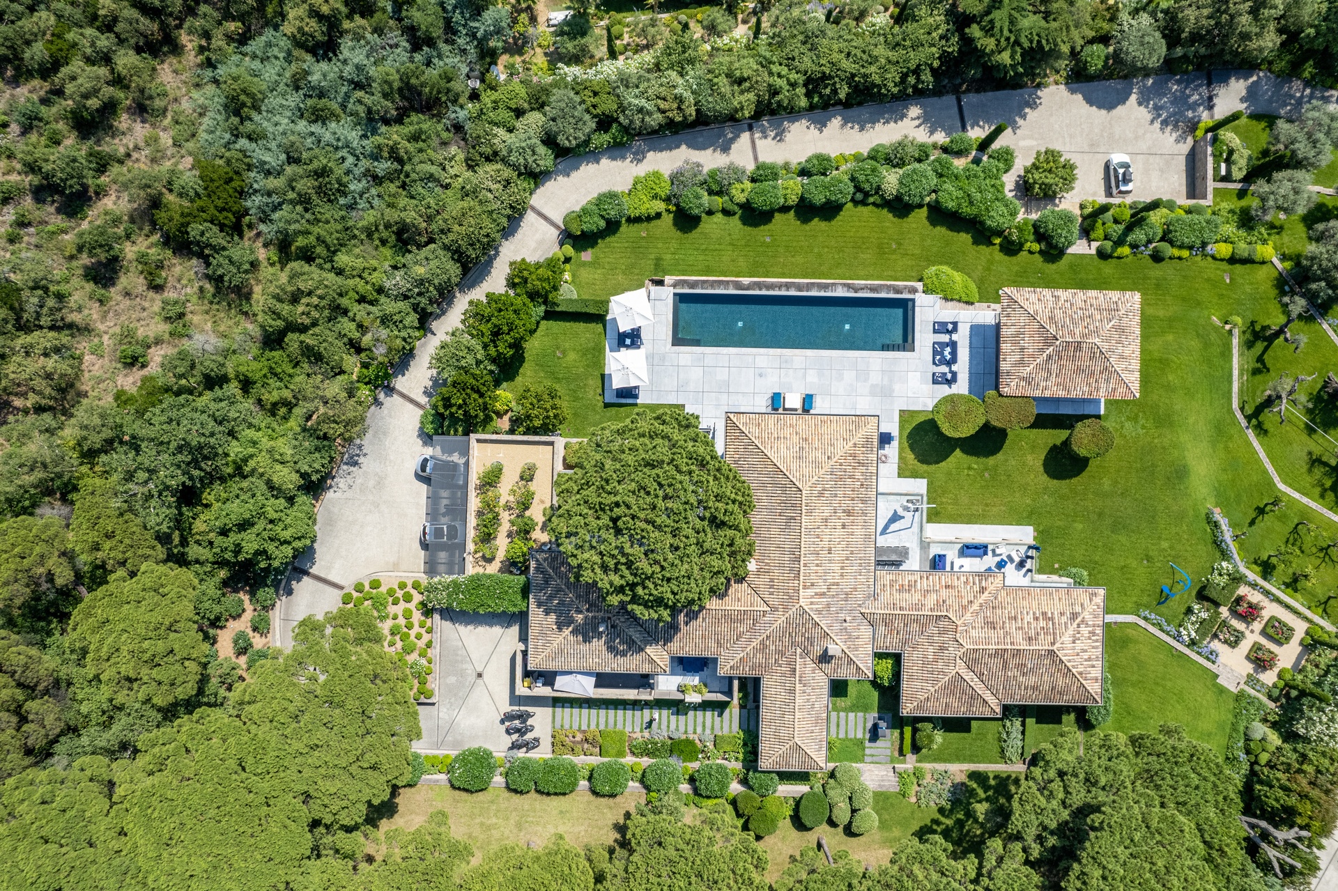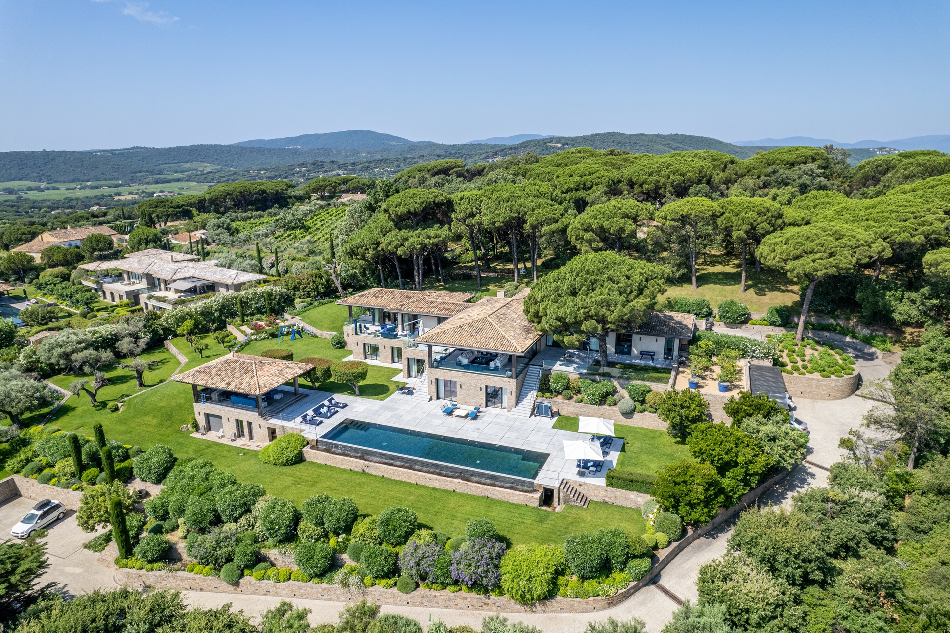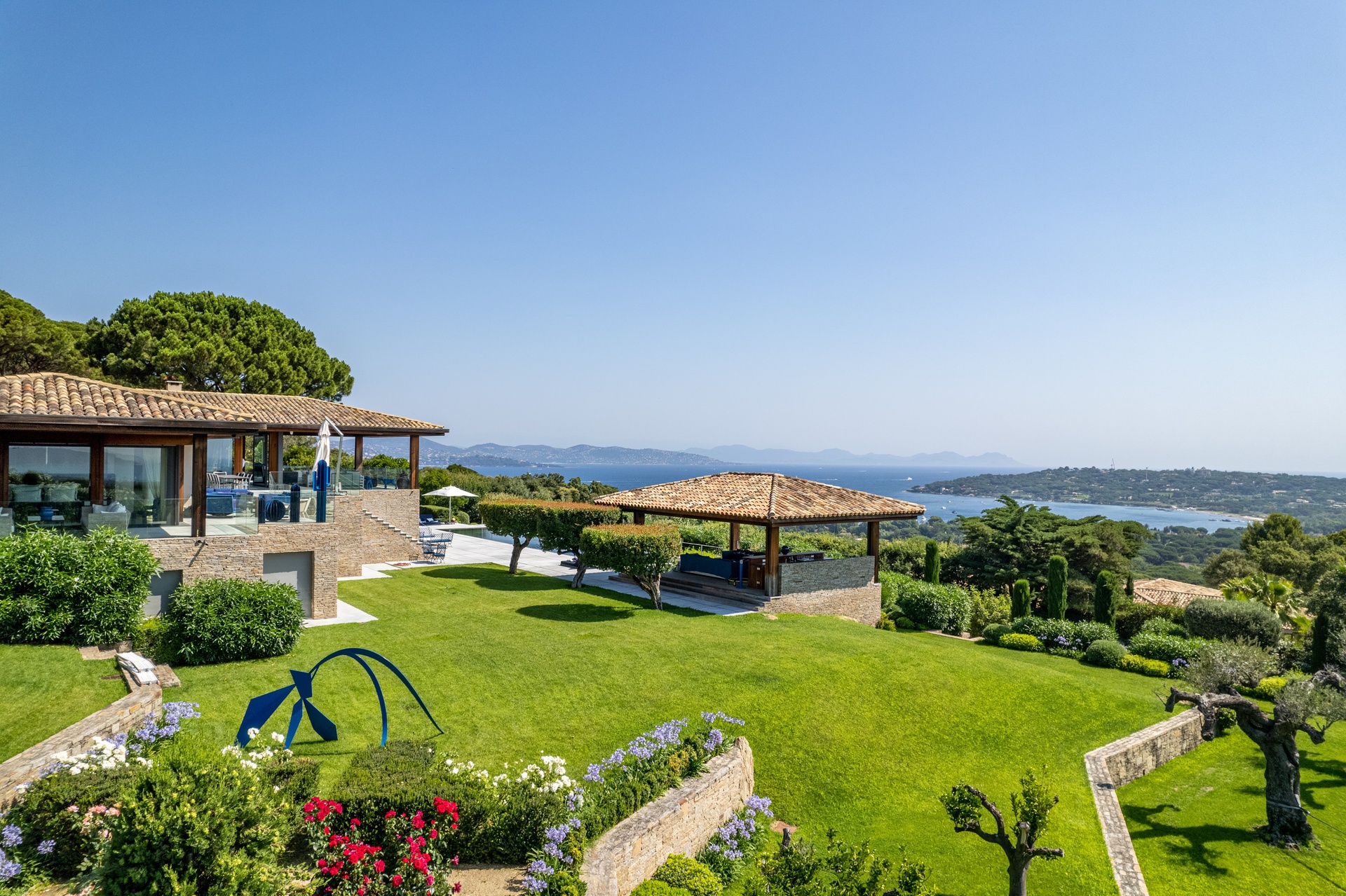 You can also relax in the sunshine by the heated swimming pool, surrounded by sunbathing areas and lounges. Your sunny lunches can take place there, in the pool house with kitchen, bar and lounge. Afternoons may take you to the mythical beaches of Pampelonne in Ramatuelle, but the large landscaped garden planted with umbrella pines and century-old olive trees may convince you to spend your days making the most of Villa Abysse and its unique setting. Young and old alike can enjoy themselves around the ping pong table, in the pool, at the table... Everything is designed to offer you a cocoon of well-being and pleasure.