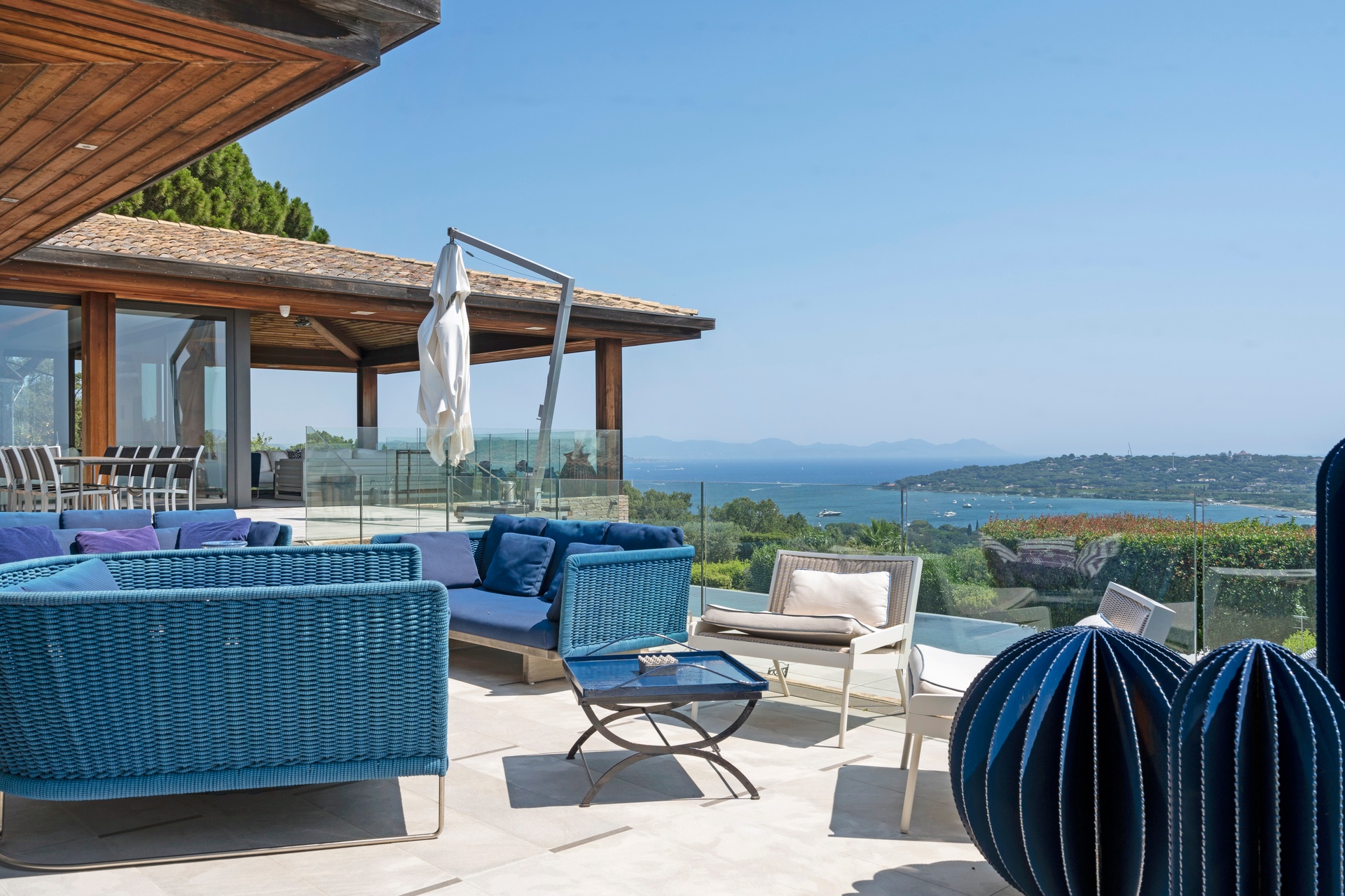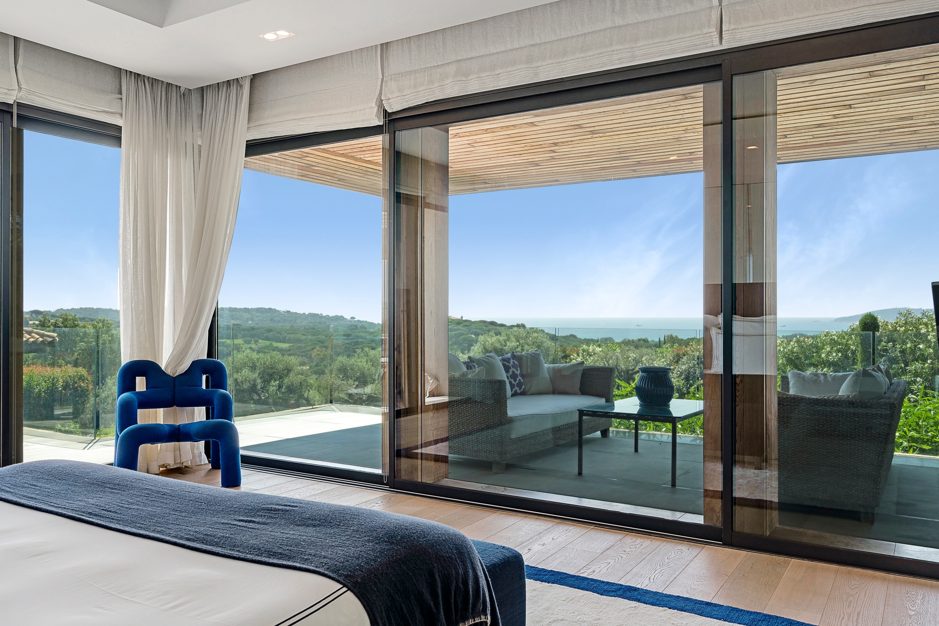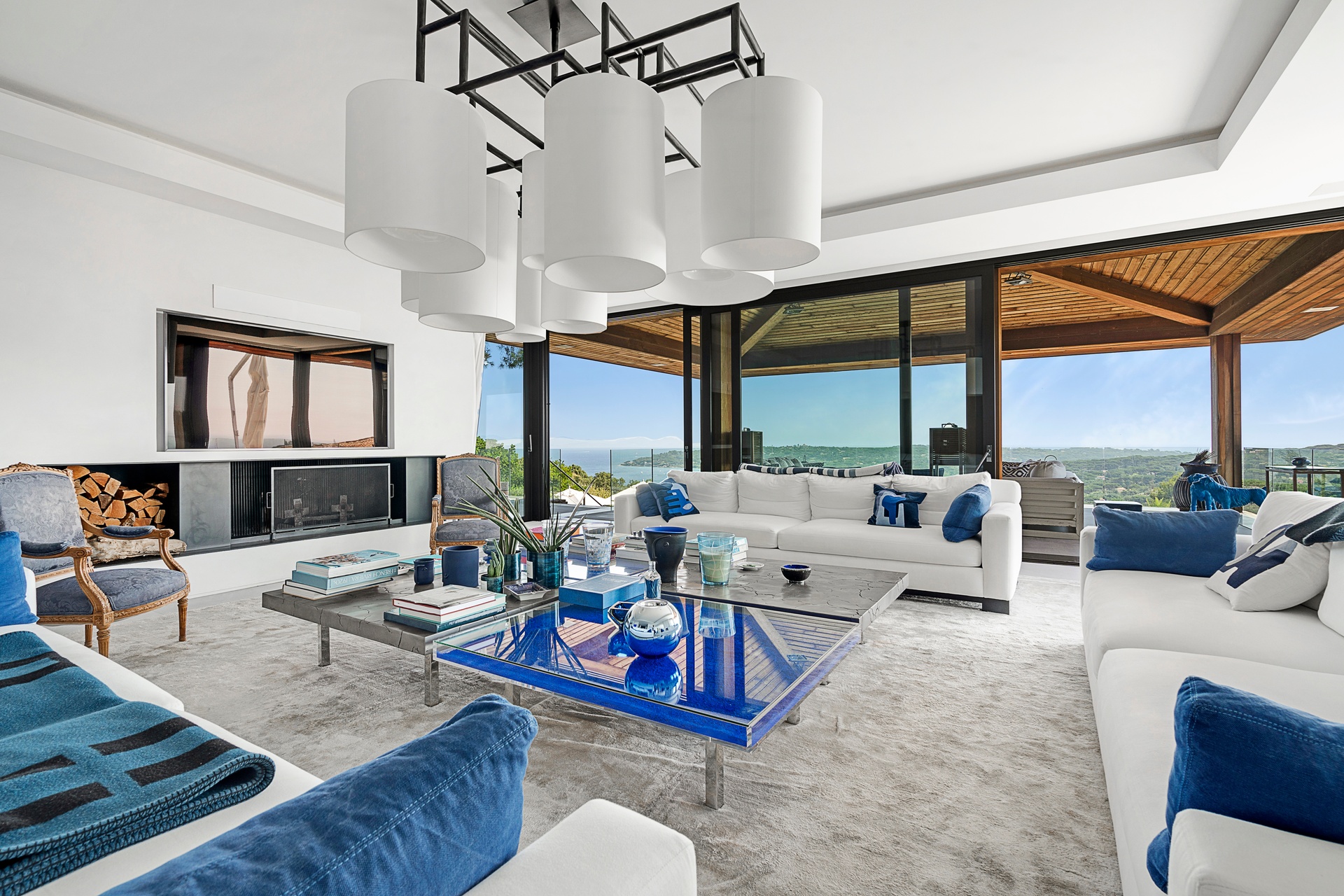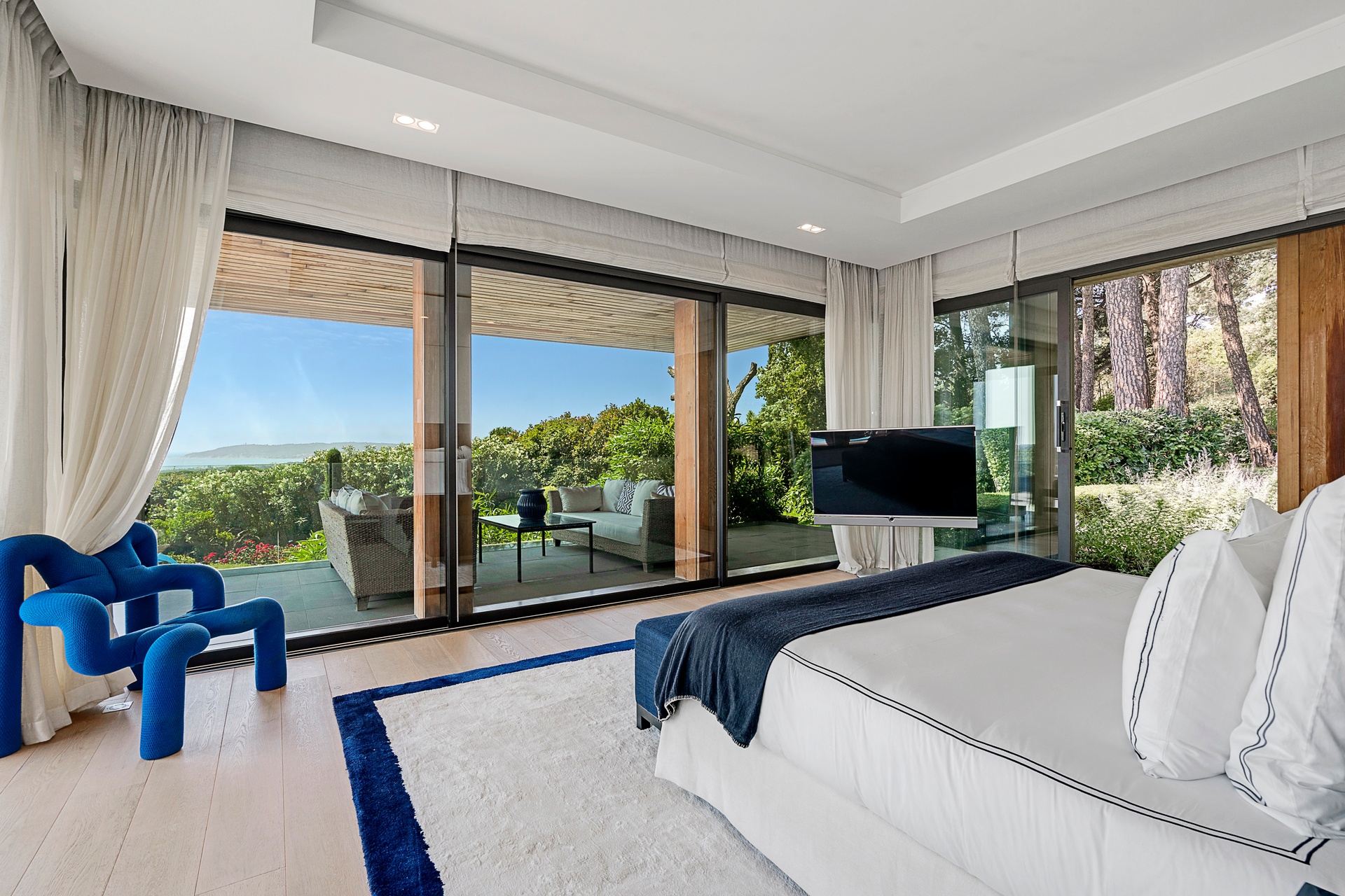 The living areas are an invitation to spend time together, encouraging moments of conviviality. The large, immaculate living room with its fireplace, whose openings let in exceptional light, offers unequalled comfort. The same goes for the generous dining room, ideal for formal dinners for 12. As for the sublime, fully equipped klein blue kitchen, it invites you to spend time cooking Mediterranean specialities or to invite a private chef to introduce you to the best local recipes.
