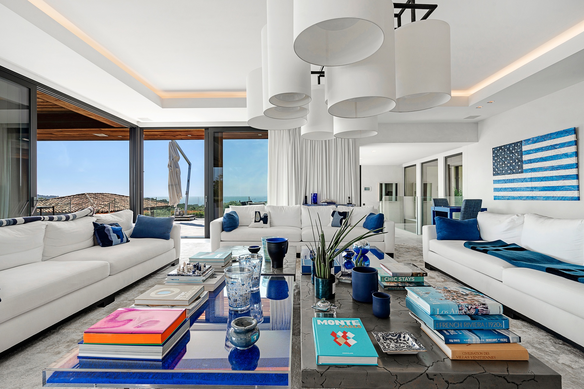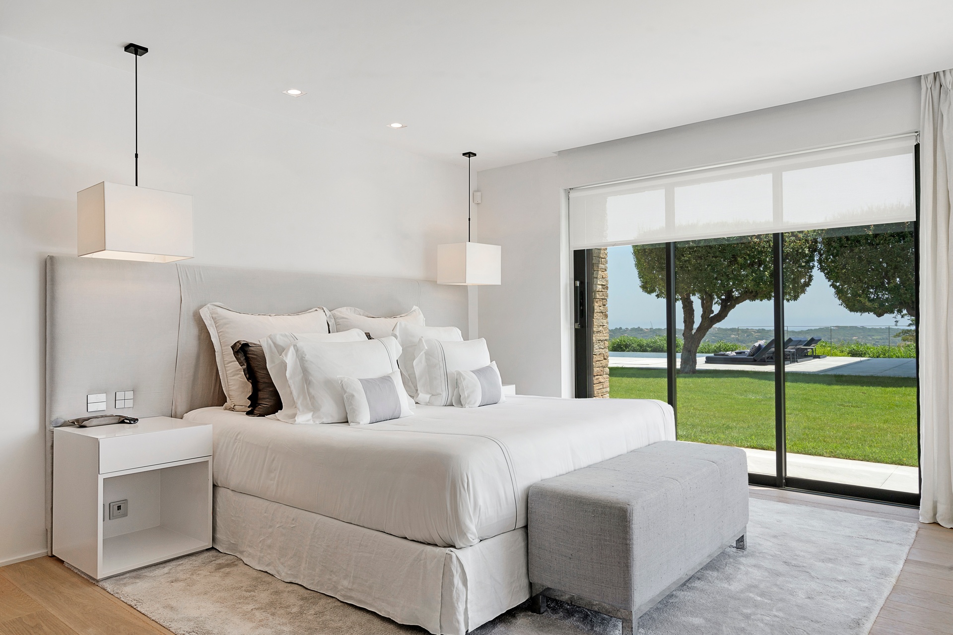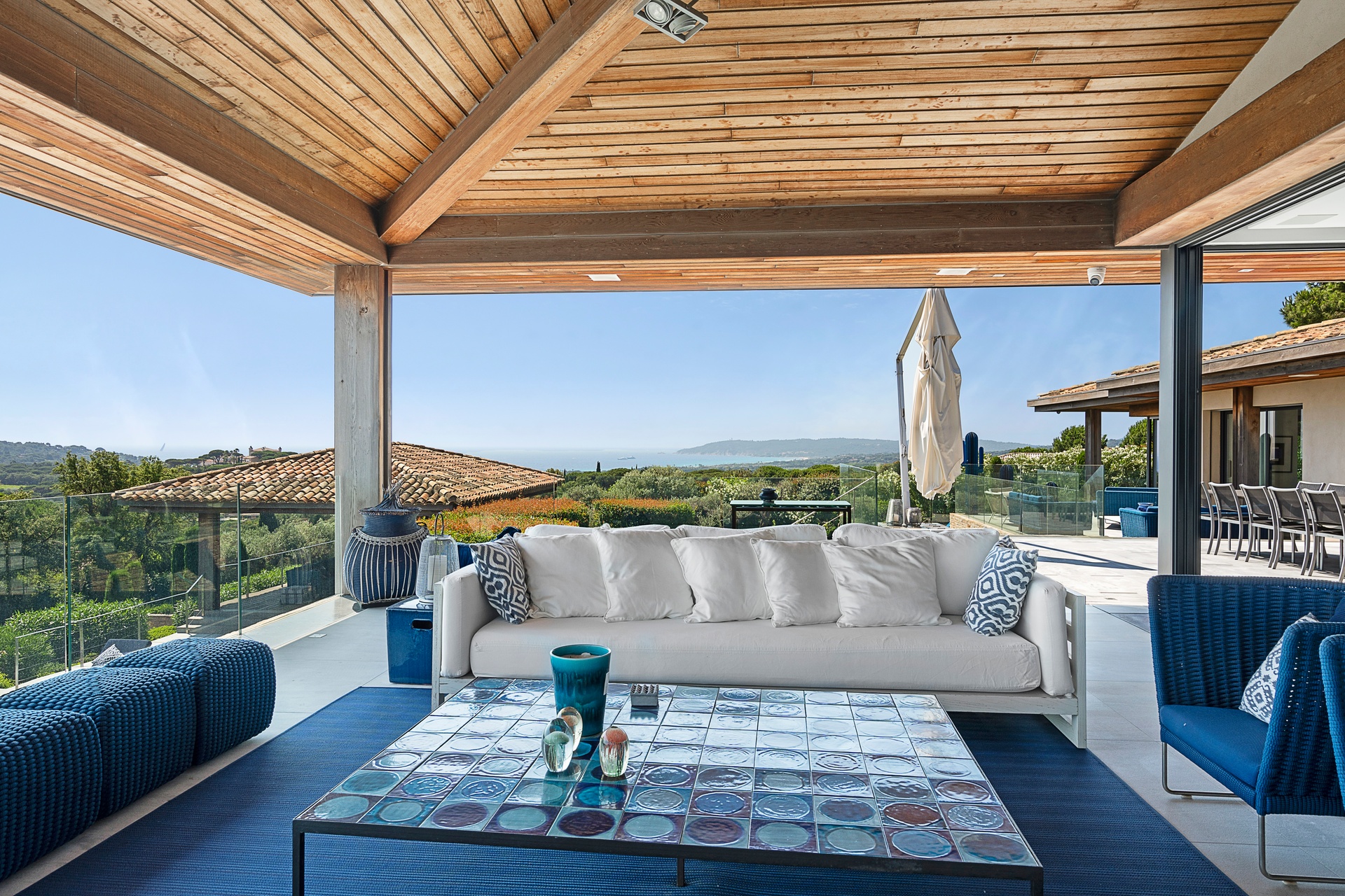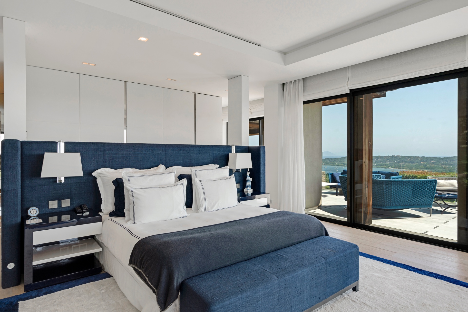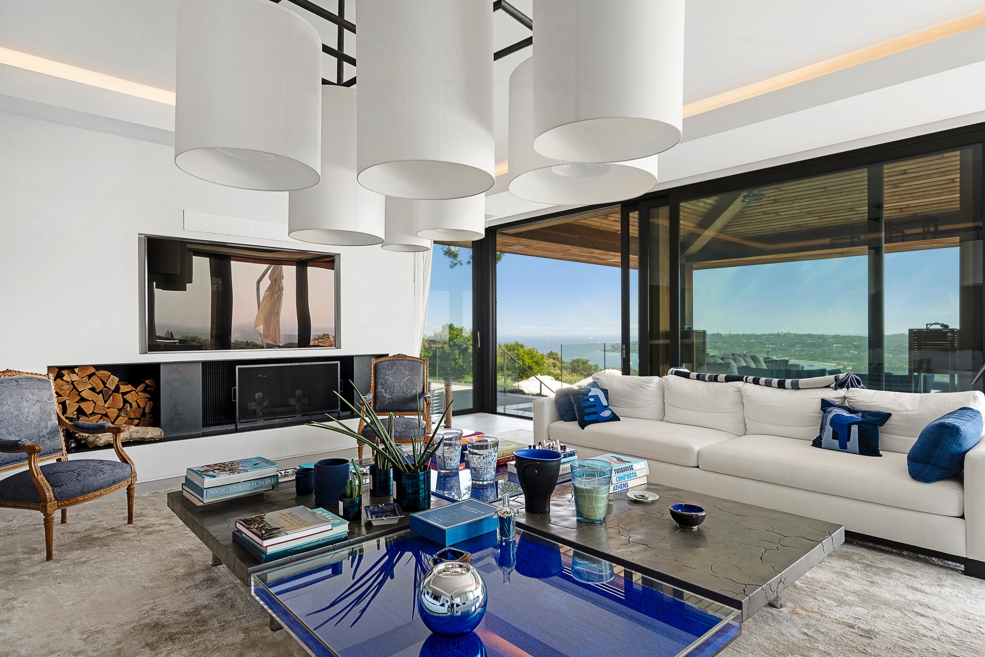 The living areas are an invitation to spend time together, encouraging moments of conviviality. The large, immaculate living room with its fireplace, whose openings let in exceptional light, offers unequalled comfort. The same goes for the generous dining room, ideal for formal dinners for 12. As for the sublime, fully equipped klein blue kitchen, it invites you to spend time cooking Mediterranean specialities or to invite a private chef to introduce you to the best local recipes.