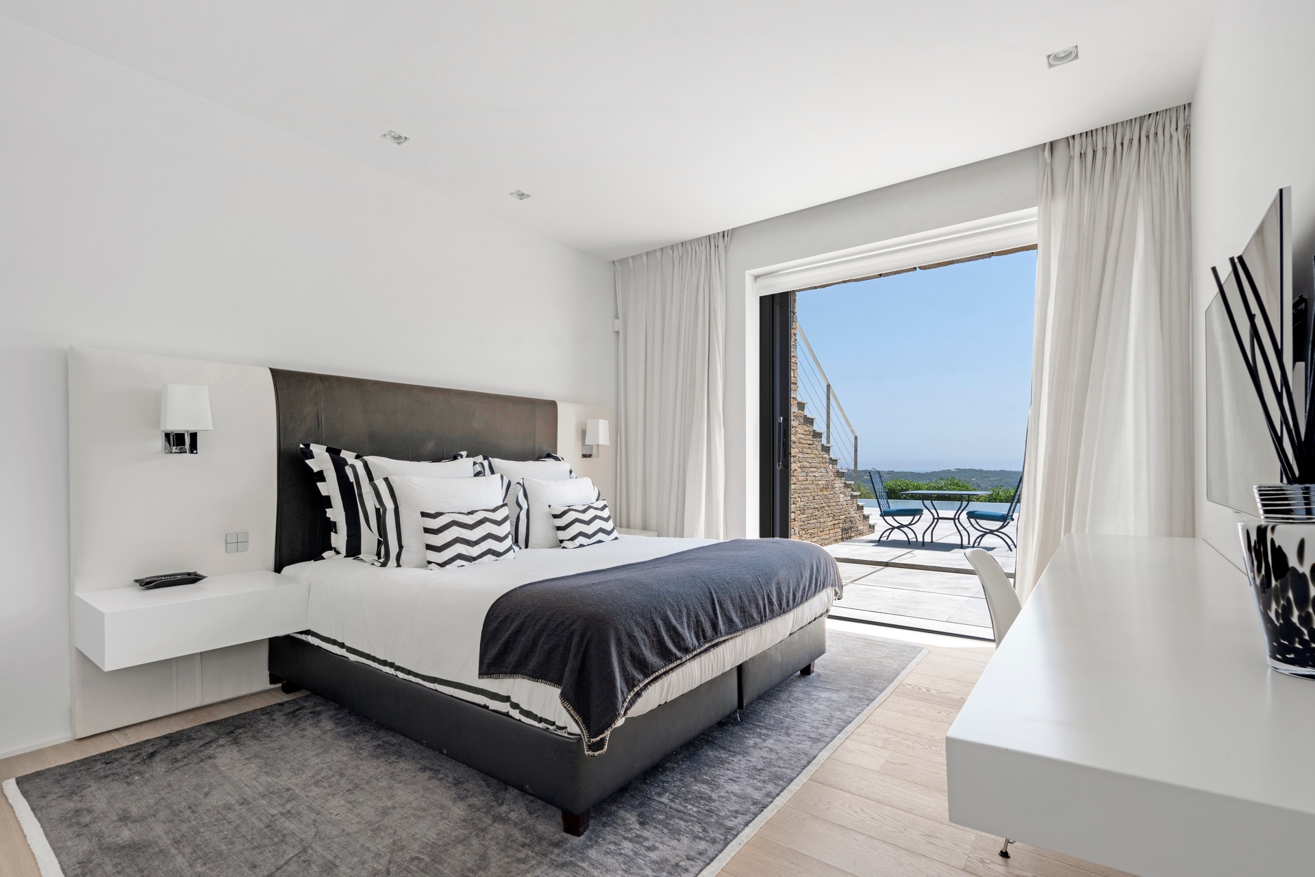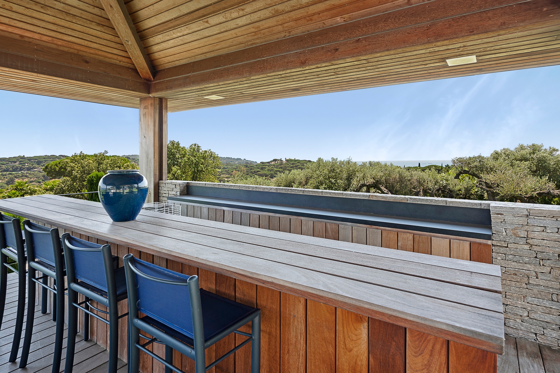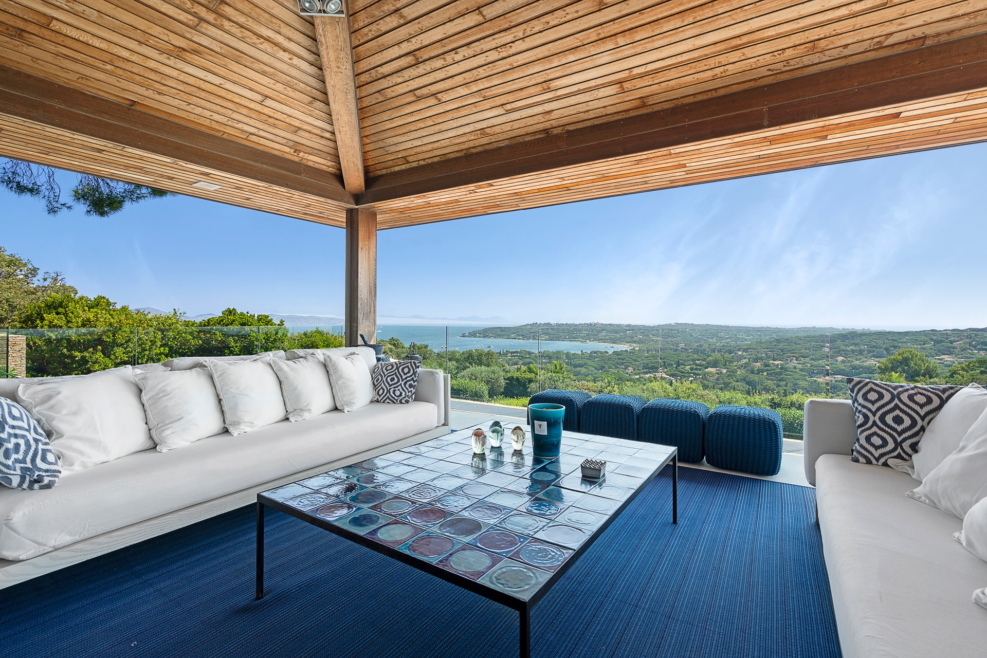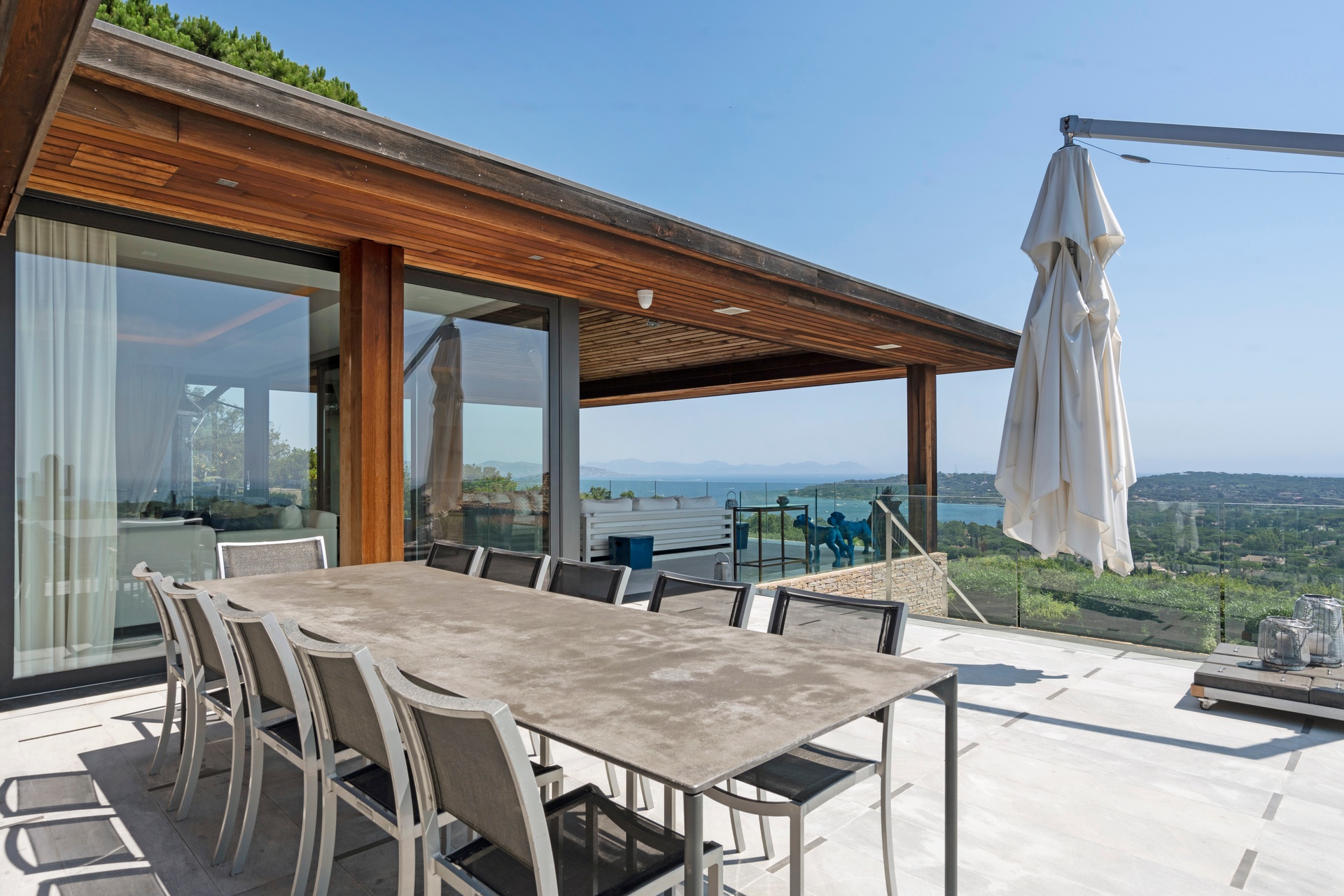 The living areas are an invitation to spend time together, encouraging moments of conviviality. The large, immaculate living room with its fireplace, whose openings let in exceptional light, offers unequalled comfort. The same goes for the generous dining room, ideal for formal dinners for 12. As for the sublime, fully equipped klein blue kitchen, it invites you to spend time cooking Mediterranean specialities or to invite a private chef to introduce you to the best local recipes.
