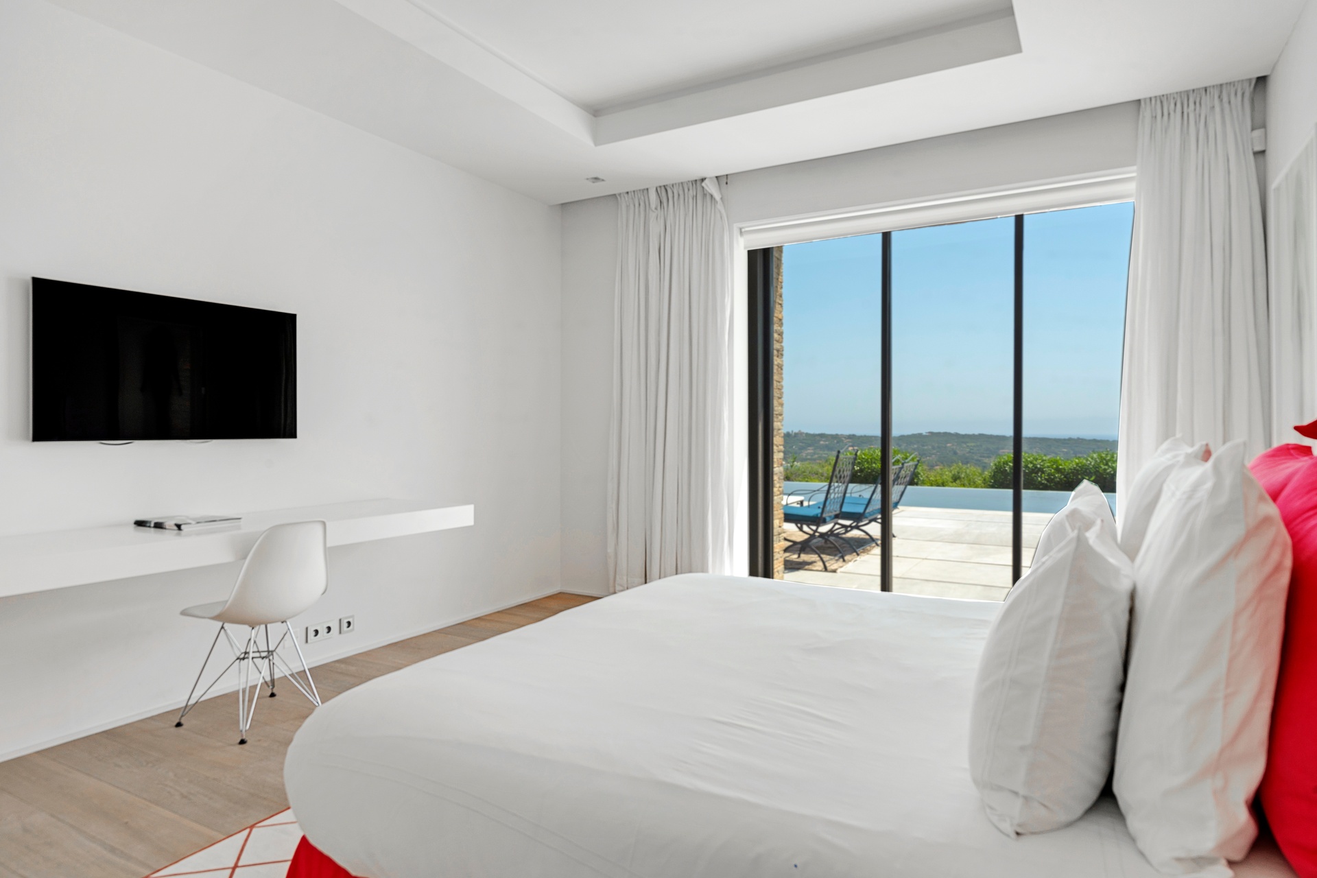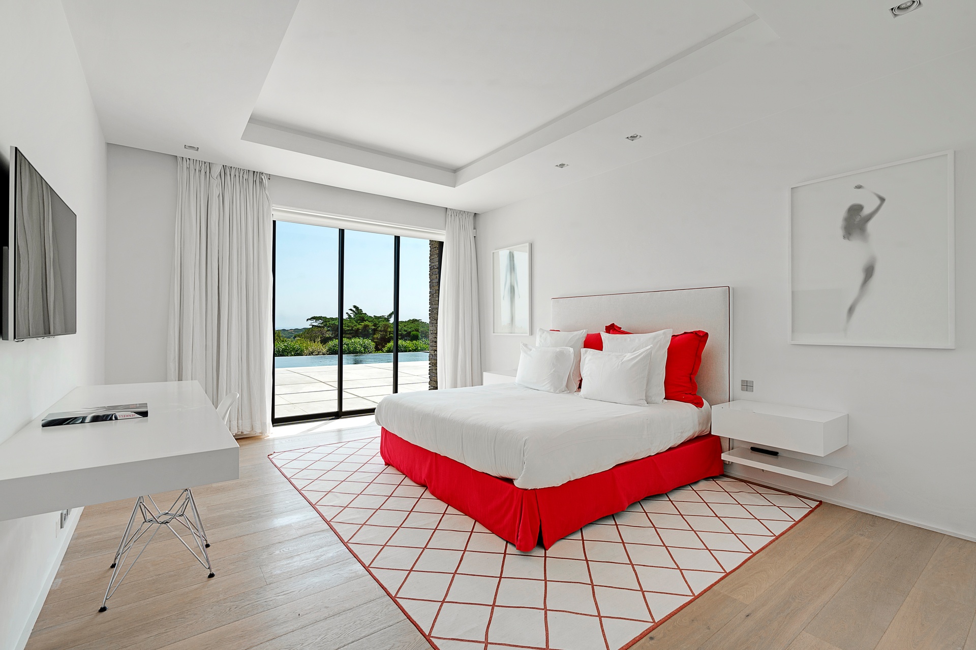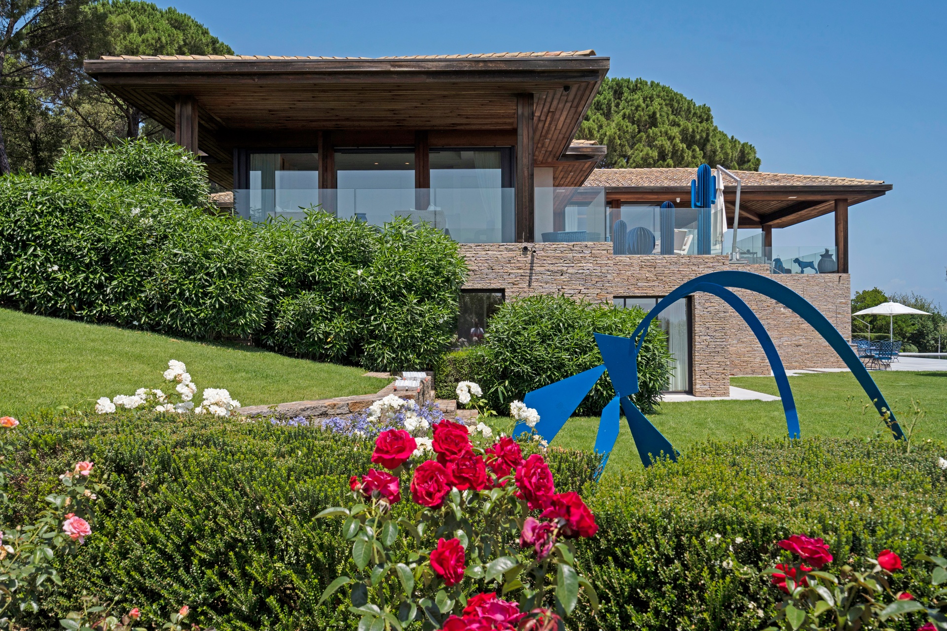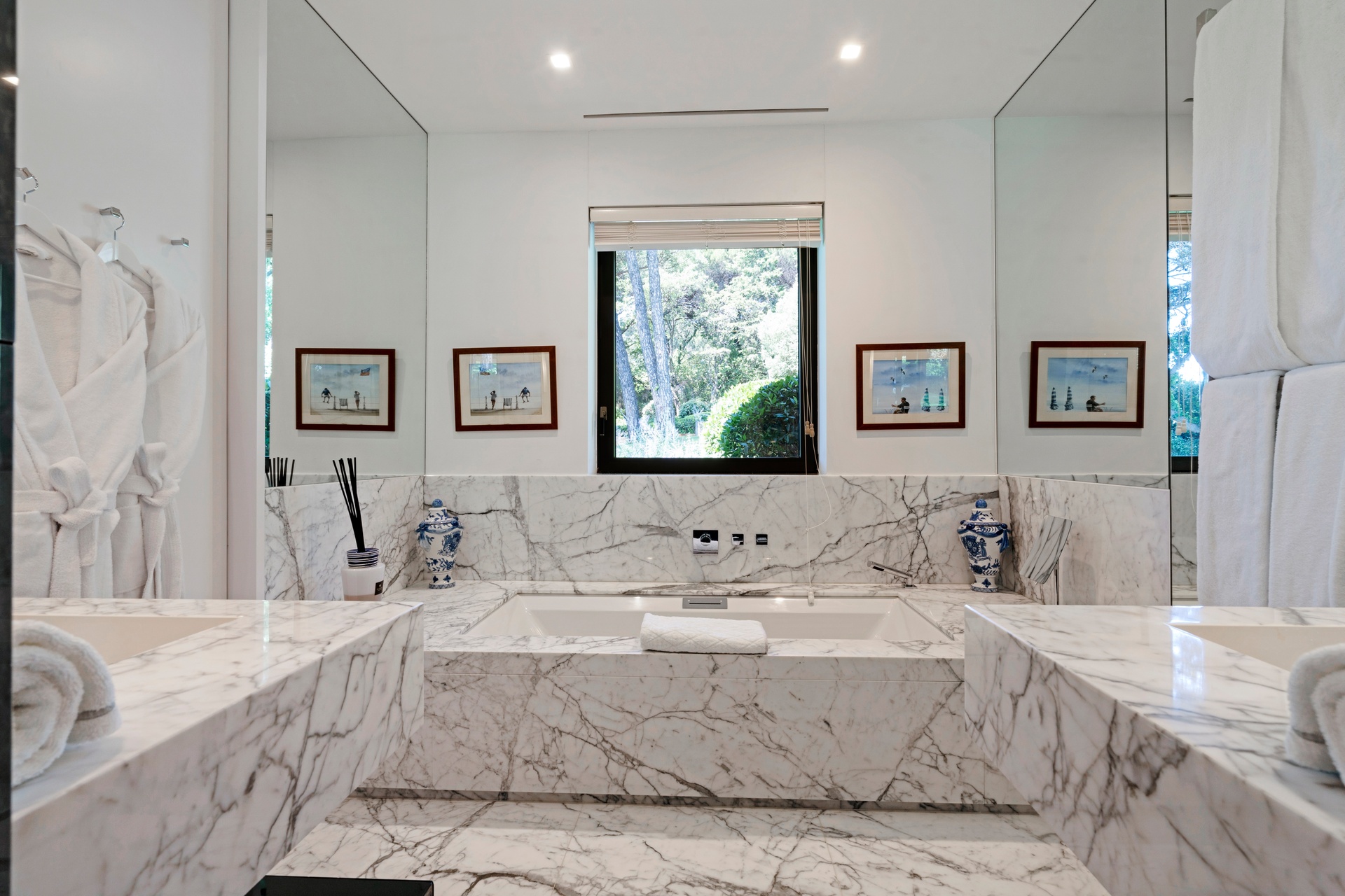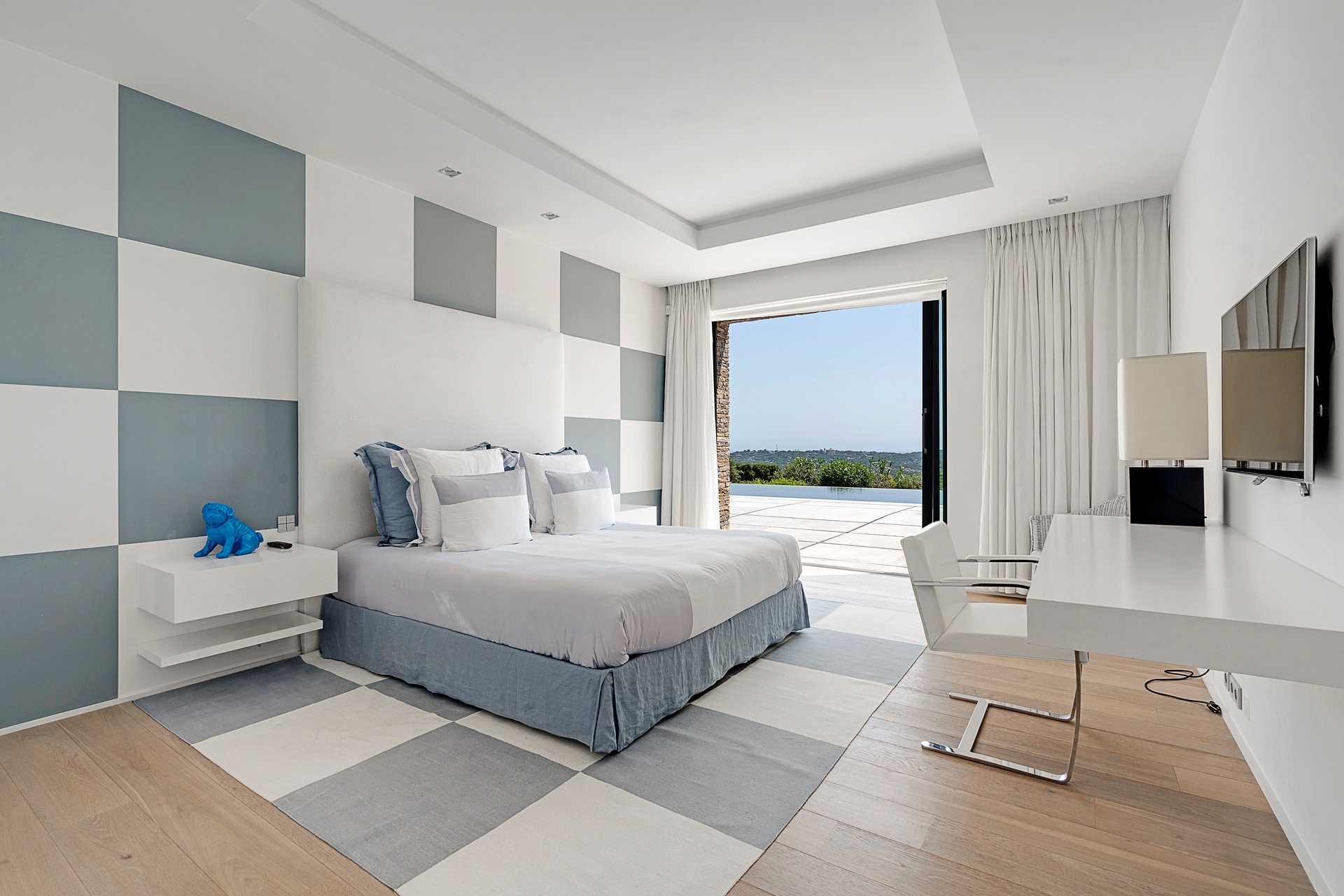 The living areas are an invitation to spend time together, encouraging moments of conviviality. The large, immaculate living room with its fireplace, whose openings let in exceptional light, offers unequalled comfort. The same goes for the generous dining room, ideal for formal dinners for 12. As for the sublime, fully equipped klein blue kitchen, it invites you to spend time cooking Mediterranean specialities or to invite a private chef to introduce you to the best local recipes.