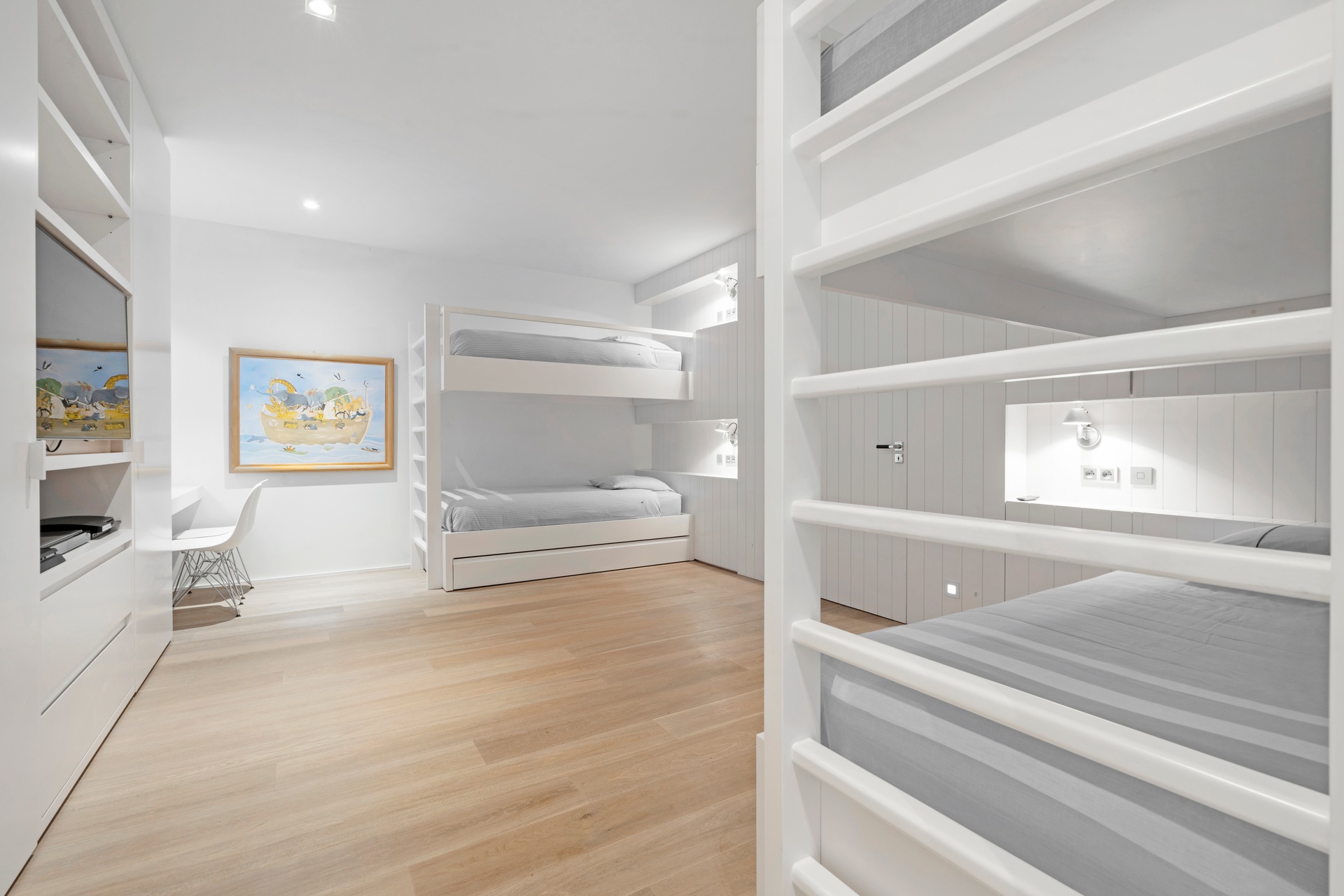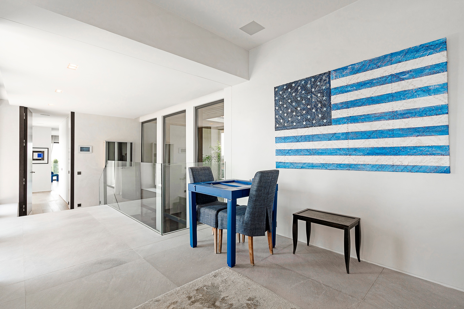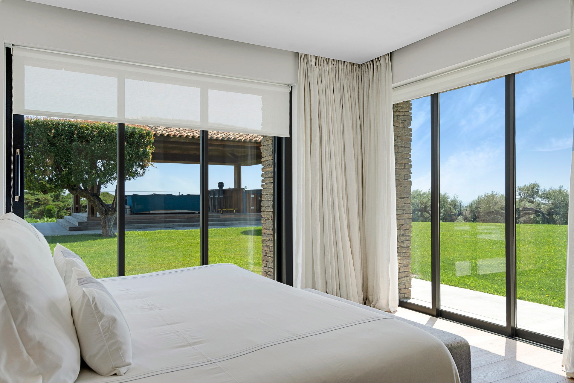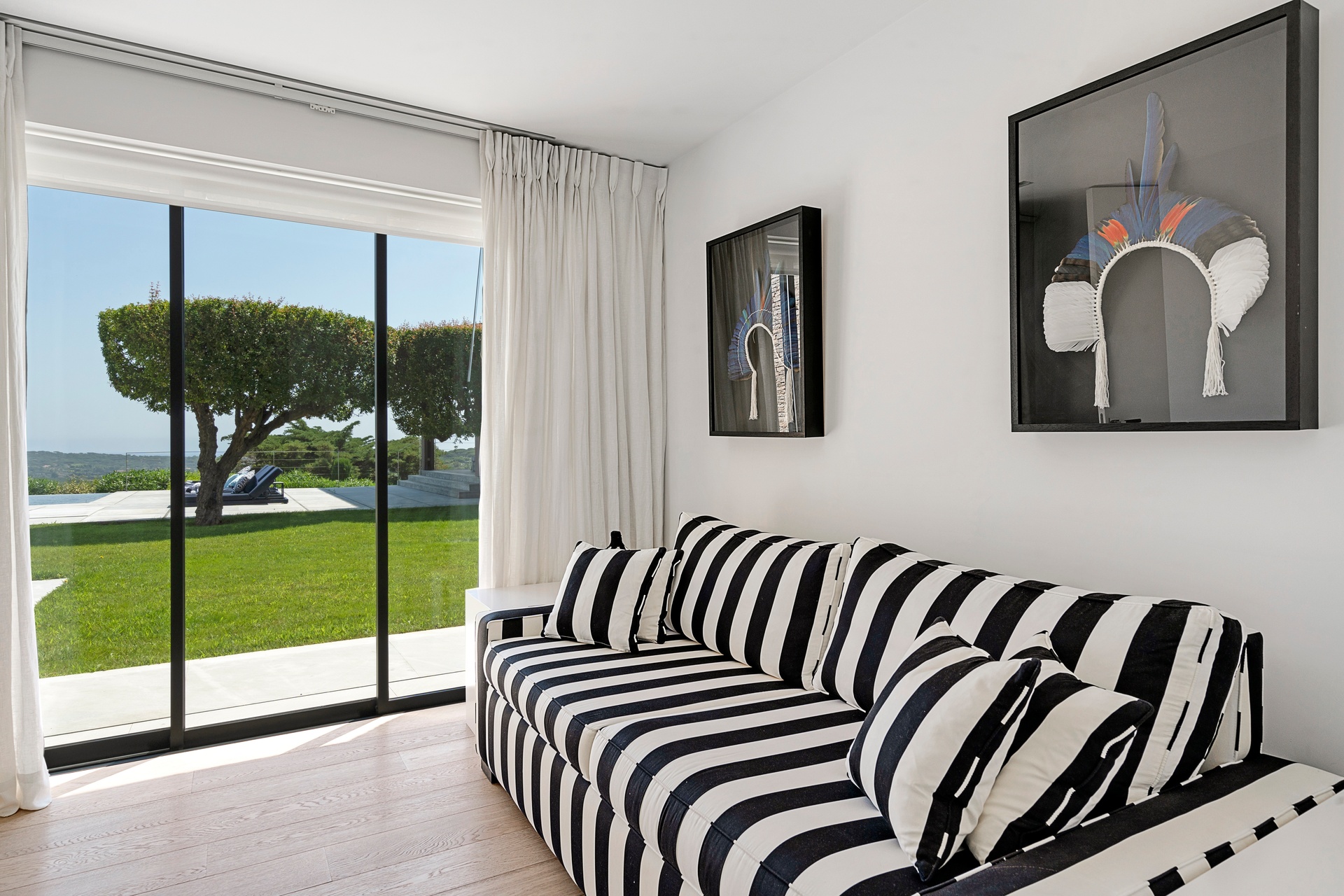 The living areas are an invitation to spend time together, encouraging moments of conviviality. The large, immaculate living room with its fireplace, whose openings let in exceptional light, offers unequalled comfort. The same goes for the generous dining room, ideal for formal dinners for 12. As for the sublime, fully equipped klein blue kitchen, it invites you to spend time cooking Mediterranean specialities or to invite a private chef to introduce you to the best local recipes.