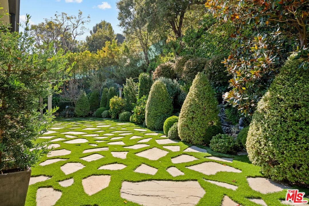 Extensively remodeled with exquisite taste and superior quality, this very special, light and bright one-story home harmoniously blends comfort and style and has been meticulously and painstakingly maintained. Its open and sensible floor plan begins at the formal foyer, leading to the sky-lit living room and dining area designed with the elegant entertainer in mind. This very expansive area, with its light-hued herringbone-patterned wood floors and two stone-clad fireplaces, opens easily to the backyard for seamless indoor-outdoor flow. The family room is warm and cozy with its wet bar and fireplace and opens to the fabulous outdoor living and dining room, complete with a barbecue area, outdoor fireplace and comfort heaters. The chef's kitchen has a breakfast area, quartz countertops, stainless steel appliances and double ovens. There are four bedrooms in total. The primary suite, also opening to the backyard, is truly wonderful with its ample closet space, many built-ins, beautiful spa-like bath and sitting area. Adjacent are two spacious bedrooms sharing a tasteful hall bath. The fourth bedroom is located by the kitchen, perfect as a gym, nanny's or housekeeper's room. The backyard is nothing short of glorious, every inch professionally landscaped. A true paradise, there is natural beauty to behold everywhere, all amidst the soothing sounds of an artfully-crafted cascading waterfall. There's also a separate multi-purpose art studio in the backyard, as well. Extensive updates, many of them quite recent, include central air and heat, metal doors and windows, many exquisitely-crafted built-ins, multiple skylights, recessed lighting, art-focused lighting, a separate generator connected also to the gas line, a Tesla car charging port, a new roof, a security system and so much more. The garage has extra storage and offers direct access into the house. Please ask the agents for a comprehensive list of updates. Inclusion in the very desirable public school districts which include Kenter Elementary School, Paul Revere Middle School and Palisades High School. All this, moments from the town center with all the shopping, dining and services that Brentwood offers.