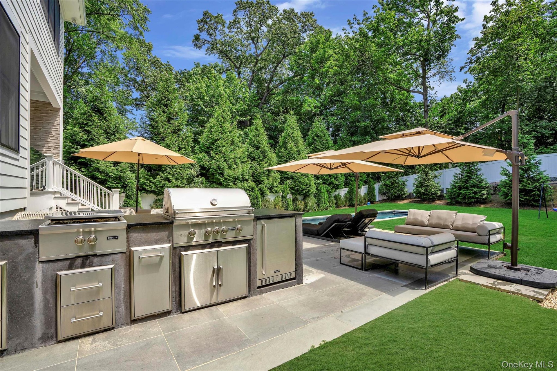 Welcome to 65 Myrtle Boulevard! This fabulous home was custom-built in 2023 by one of Westchester's premier home builders. With 5 bedroom and 5.1 baths, this very unique home boasts 10 foot first floor ceilings and a bright, sunny foyer. The first floor presents the gourmet kitchen offering a SubZero Refrigerator, Wine Frig, Wolf Range, 2 Bosch Dishwashers, Sharpe Microwave, and large island leading to the office/ pantry. The dining area, living/family room with gas fireplace and powder room with radiant heated floor complete the first floor. Step outside to the covered porch with wood-burning fireplace, ceiling fan and heater. The 2nd floor provides a large, bright primary bedroom with a huge walk-in closet furnished with an island and dresser drawers, a second large closet, and a wonderful study with custom built-ins and fireplace. The beautiful ensuite bath has a free-standing jacuzzi tub, large shower and radiant heated floor. There are 3 more ample bedrooms on the second floor each offering ensuite baths with radiant heat, and a laundry room with 2 washers and 2 dryers. The inviting finished basement offers recessed lighting, a large playroom, a gym/yoga studio with heated air blower, a steam room, a dry bar with refrigerator and a bedroom with radiant heated bath. Enjoy the spectacular fenced backyard with outdoor speakers. The huge patio with porcelain tile has a large built-in barbecue grill and a full outdoor kitchen. The magnificent heated pool sports a jacuzzi and an automatic cover. The backyard is perfect for playing, swimming, entertaining or just relaxing! This unique, outstanding smart home features wonderful large windows for maximum light, a Lutron shade system and lighting controlled by your smart phone, 3 fireplaces, wireless speakers throughout, 4 AC and heating zones, Nest thermostats, generator ready, 400 amp electrical service and a large 2-car garage leading to the mudroom. Located close to the train, Larchmont restaurants, shops, schools, playgrounds and the Saturday Farmer's Market, this magnificent new home offers everything one could desire!