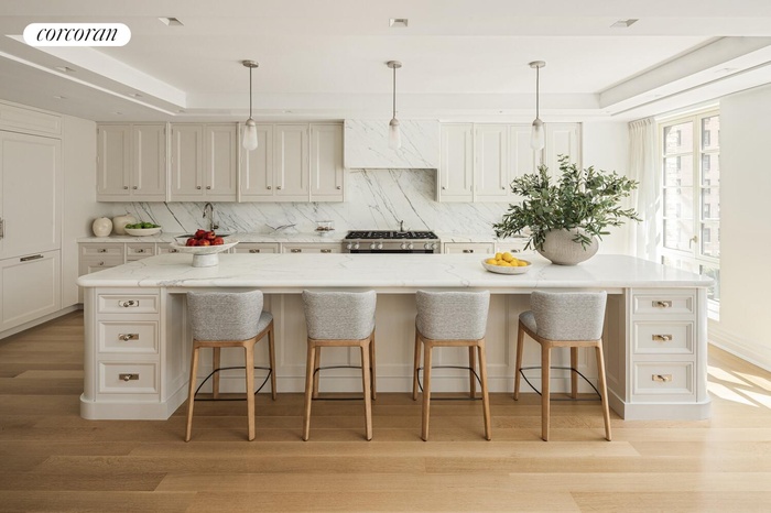 Elegant white oak flooring runs throughout, featuring a herringbone pattern in the gallery and great room, and five-inch planks in the kitchen and bedrooms. Residence No. 15 showcases a Christopher Peacock-designed chef's kitchen which serves as a stunning centerpiece to the home. The space includes a 14-foot island, custom cabinetry with Lambourne-style polished nickel hardware, and Calacatta Gold marble countertops and backsplash. Top-tier Miele MasterCool appliances, an undercounter wine refrigerator, a vented range hood, and a discreet pantry with a service entrance complete this exceptional kitchen.