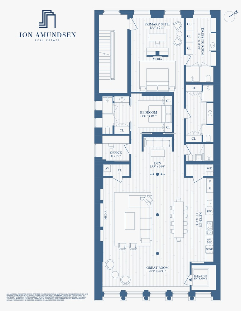 Upon entering through a private key-lock elevator, you are welcomed by an impressive 30-foot wall of windows, illuminating the expansive great room with abundant natural light. This grand space, extending over 30 feet in width and length, is adorned with Schotten & Hansen oak floors and boasts 11-foot ceilings, setting the stage for a grand yet welcoming ambiance.