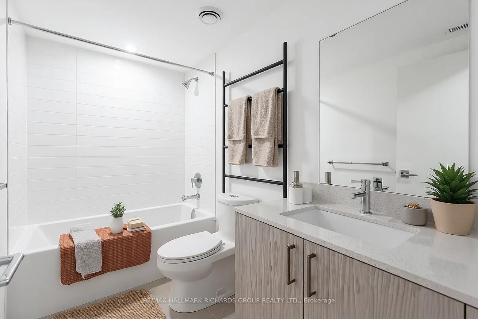 Brand new and never lived in. Welcome to Birchcliff's newest contemporary townhome collection - where design meets calm, just steps from the shoreline.This bright and thoughtfully planned 2-bedroom suite spans nearly 900 square feet, defined by an open-concept main floor that feels expansive and effortless. The kitchen is both functional and refined with quartz counters, stainless steel appliances, and a breakfast bar that invites morning coffee or casual dinners with ease. Floor to ceiling windows flood the living space with natural light and create an easy flow to the private terrace - perfect for quiet evenings or weekend brunches outdoors. Both bedrooms are generously sized, each with terrace access, while the primary offers a private ensuite for added comfort. Enjoy the feeling of newness throughout - clean lines, quality finishes, and a layout designed for modern living. Located in Birch Cliff Village - a quiet, established pocket steps to Kingston Road cafés, parks, and the lake. Minutes to the Bluffs, transit, and downtown connection points.