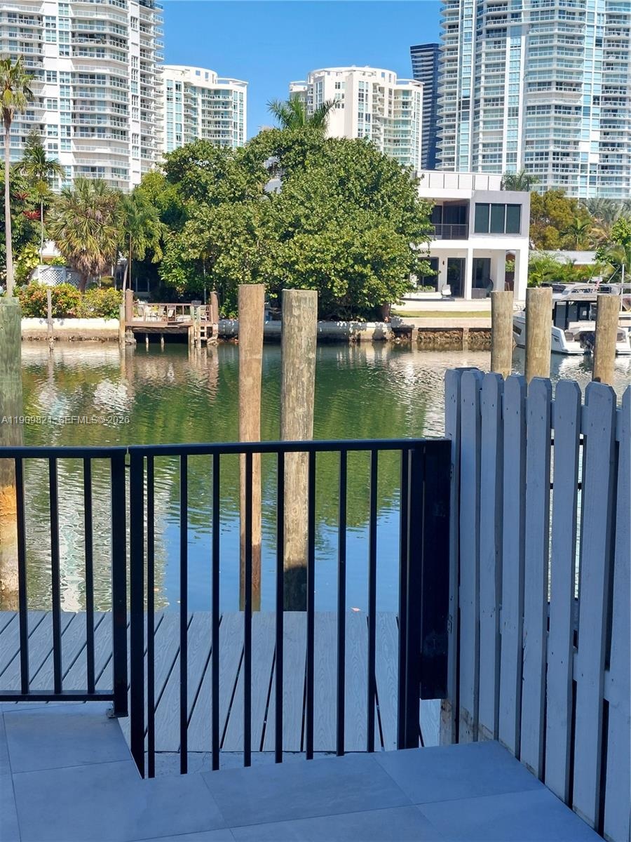 With a deed 30'-35' dock to shelter your boat, a Spacious Waterfront Townhome on Poinciana Island. Gated, 3 car parking, 3 bed, 2.5 bath townhome with vaulted skylight ceilings, kitchen, marble floors, and a patio with slate floors and water views. one car garage plus assigned front parking. New roof, impact front door, airy, light-filled interiors. The ocean is across the street. Resort-style amenities include two pools, tennis courts, gym, clubhouse, and 24/7 gated security with patrol. Water, sewer and trash included. HOA pays insurance, cable, and internet. Island-wide high-speed wireless connectivity, Enhanced security with cameras in all plazas, garages, and along the boardwalk, The location is unbeatable: just 15 minutes by boat to the Bal Harbour Inlet and sandbar and Aventura mall is 15 minutes away.