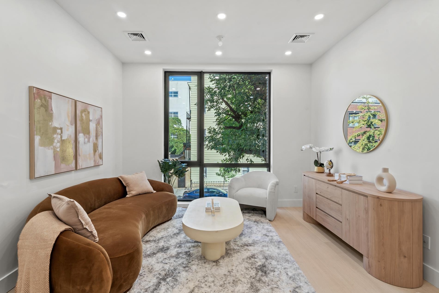Residents are greeted by a bright open-concept living, dining, and kitchen space with premium finishes like floor-to-ceiling double-pane Reynaers windows, recessed lighting, multi-zone Daikin heating and cooling mini splits, and solid 7-inch engineered white oak floors with a protective acoustic sublayer.