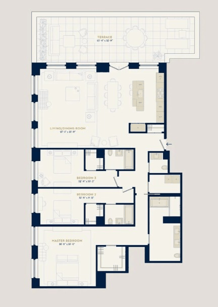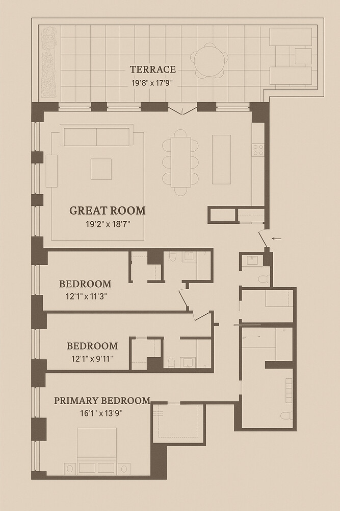 Measuring 2,265 square feet with an additional 654 square feet of private outdoor space, this three-bedroom, three-and-a-half-bath residence seamlessly balances grand scale with sophisticated design. The expansive terrace functions as an open-air extension of the living and dining areas-perfect for entertaining, dining al fresco, or simply enjoying panoramic city views.
